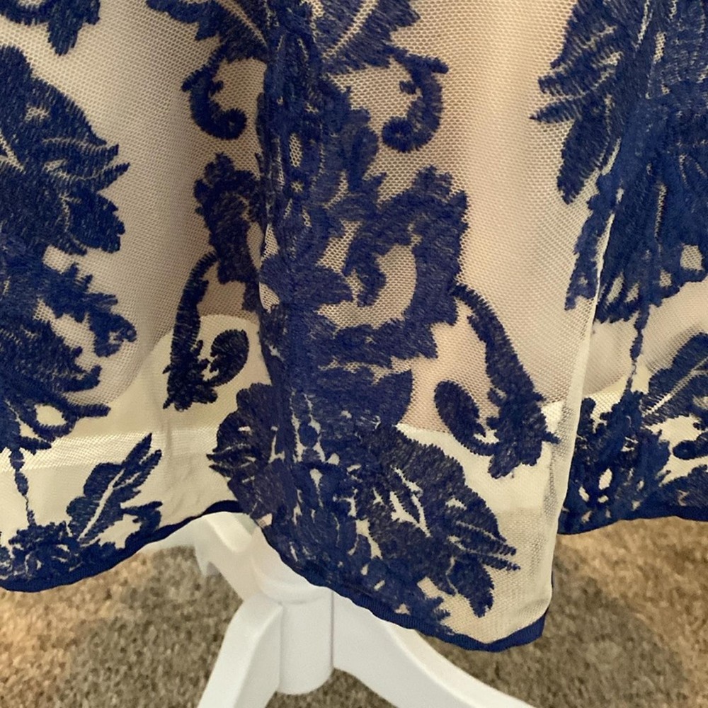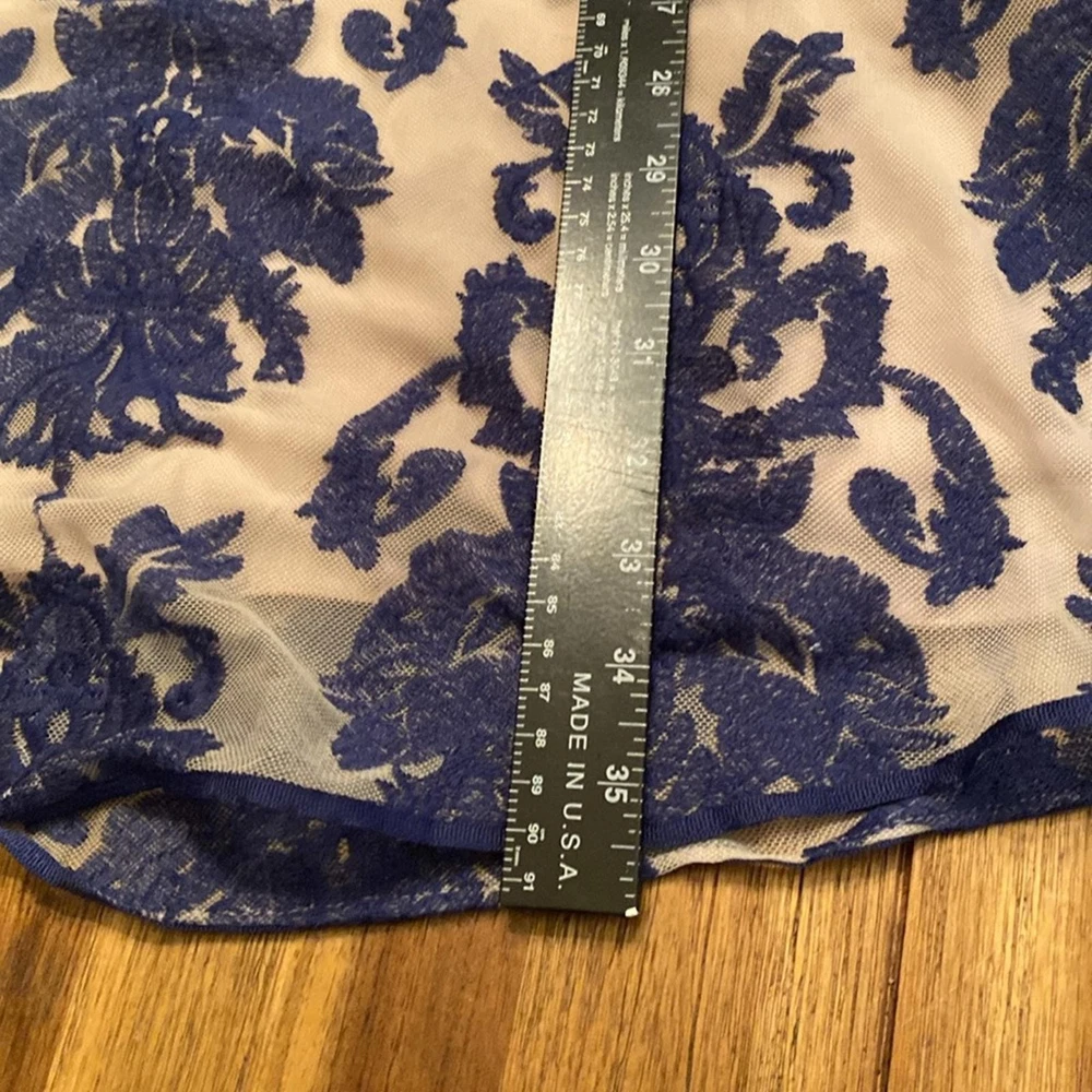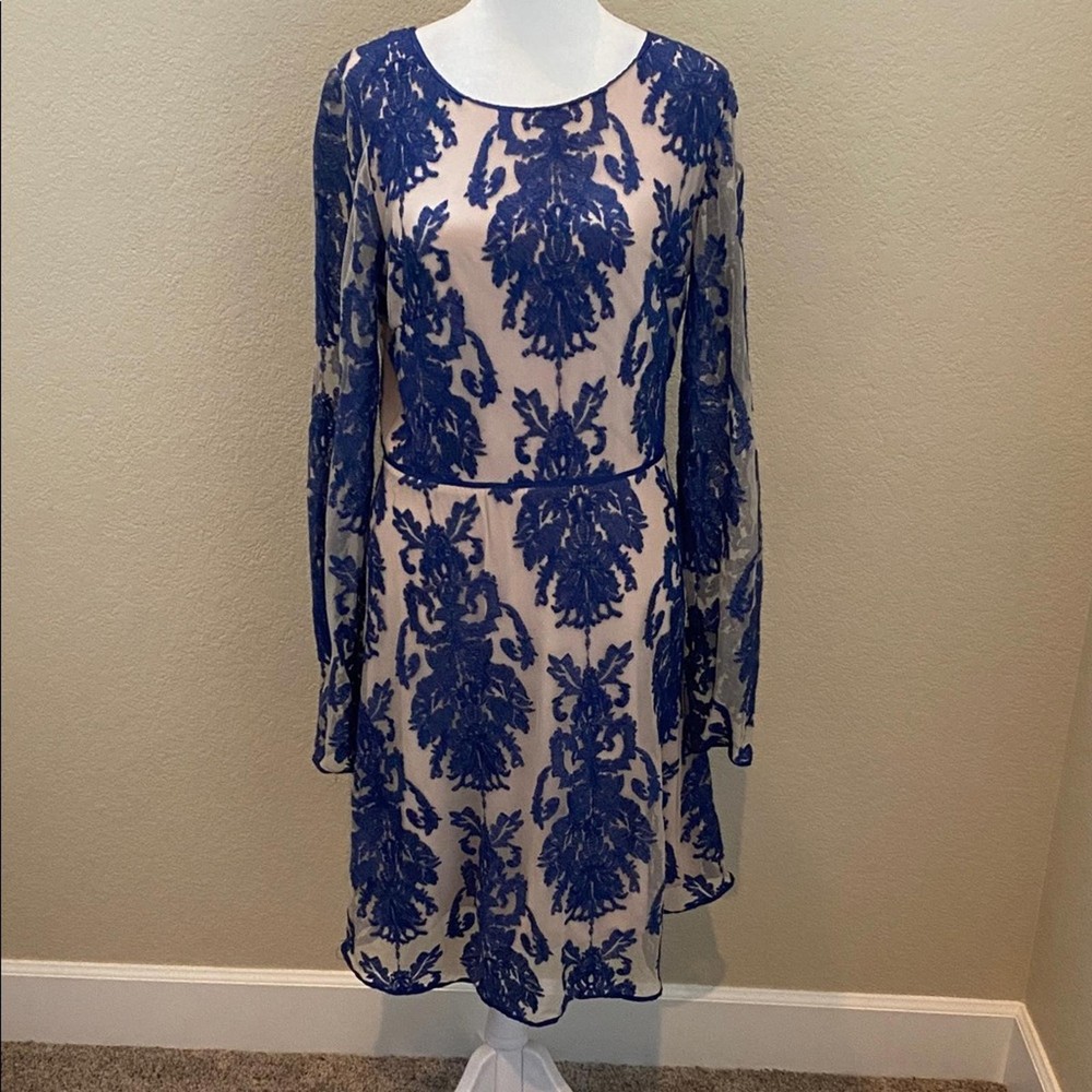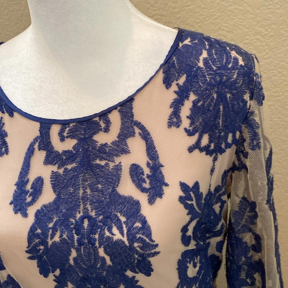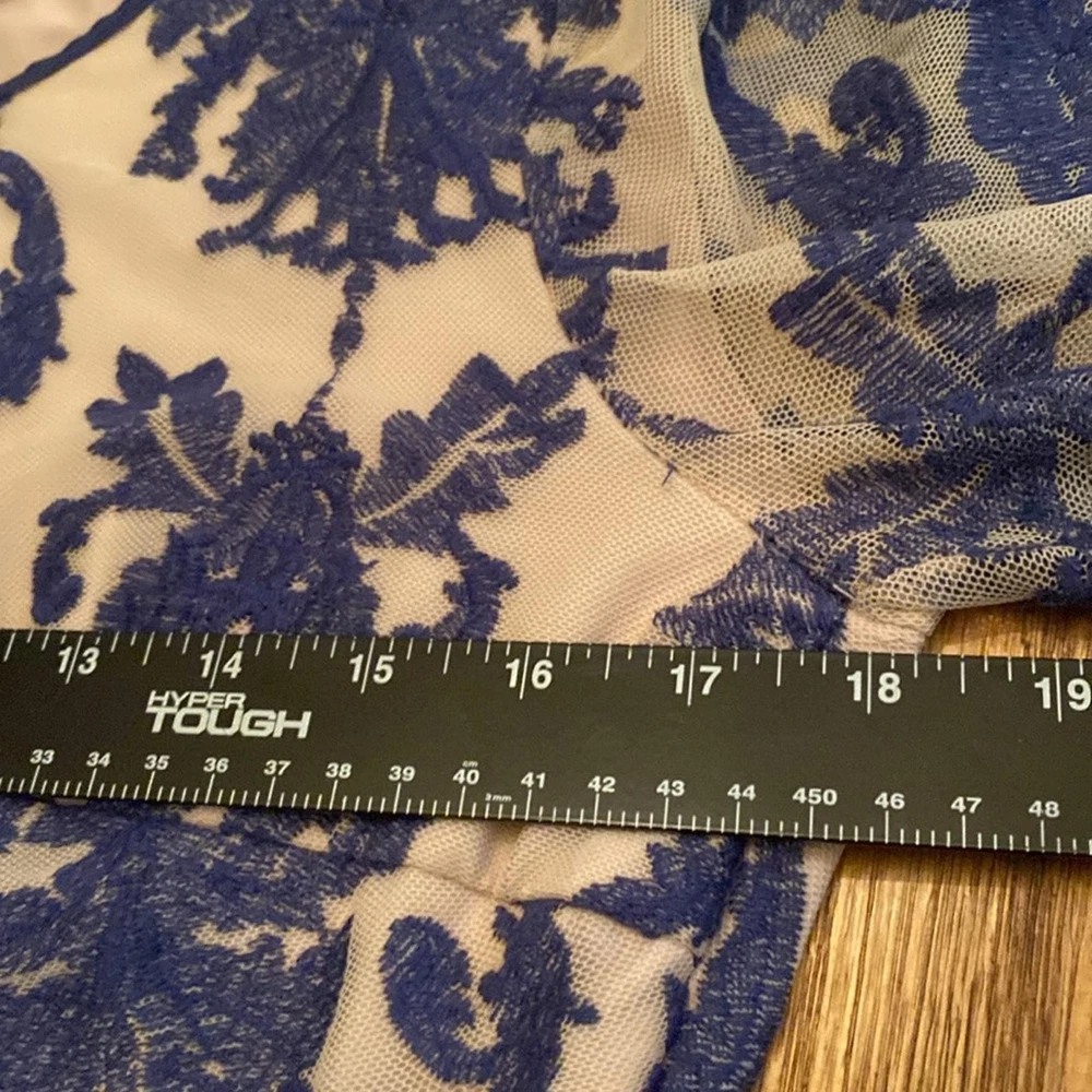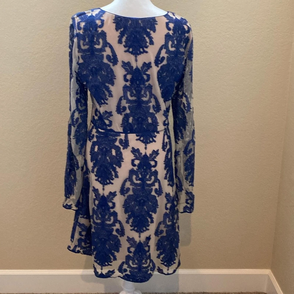 This elegant dress features a stunning blue pattern on a cream background, perfect for any occasion. The flowing design offers both comfort and style.
