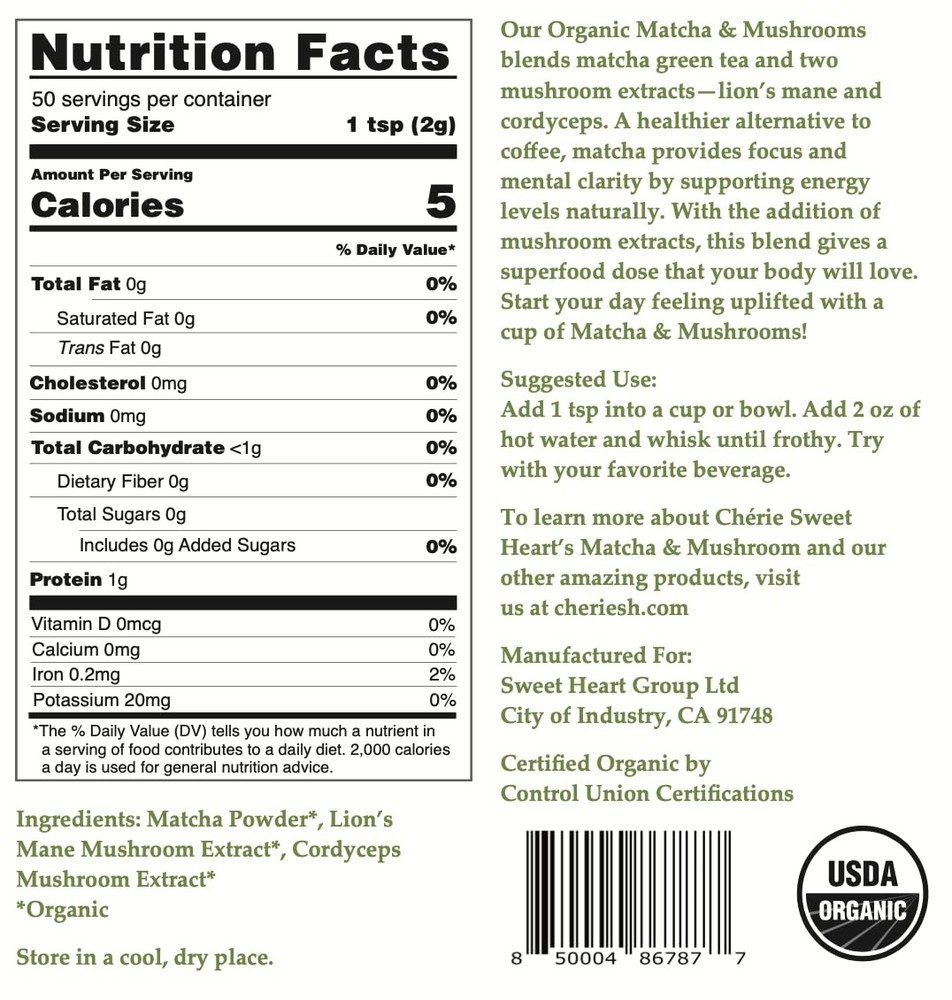 Our Organic Matcha & Mushrooms blends matcha green tea and two mushroom extracts—lion’s mane and cordyceps. A healthier alternative to coffee, matcha provides focus and mental clarity by supporting energy levels naturally. With the addition of mushroom extracts, this blend gives a superfood dose that your body will love. Start your day feeling uplifted with a cup of Matcha & Mushrooms! Matcha & Mushrooms, featuring lions mane and cordyceps mushrooms, is a ready-to-drink blend that’s a great substitute for coffee. Matcha has antioxidant properties, caffeine, and L-theanine, a relaxing amino acid, so you get balanced energy without a crash. Treat yourself to a tasty vegan matcha smoothie, green tea latte, or an iced tea. It’s unsweetened, so you can customize it just the way you like it. Perfect for our vegan, keto, dairy free or gluten-free friends. Only natural organic ingredients. No carriers, fillers, artificial flavors. All ingredients are naturally farmed or wild harvested. Superfood properties fully-charged to enrich your healthy lifestyle.