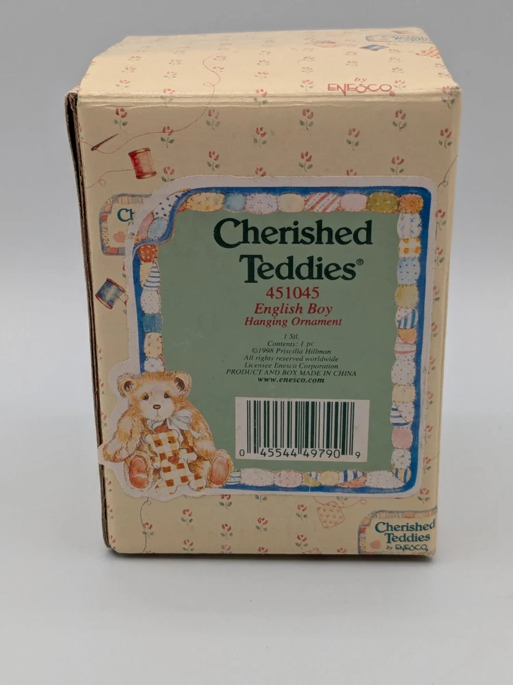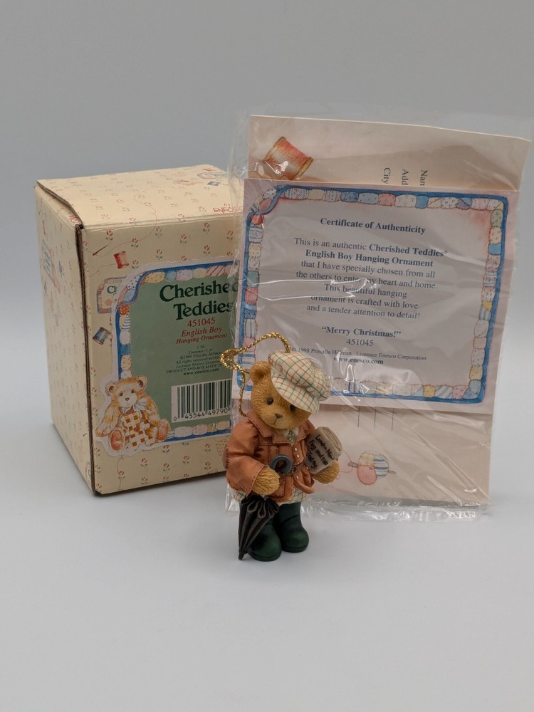 This adorable Cherished Teddies English Boy hanging ornament from 1998 is the perfect addition to any collection. Pre-owned and in excellent condition, it comes with the original box, which shows wear due to age. A charming vintage piece to celebrate the holiday season or add to your Cherished Teddies collection. We ship within one business day! This item comes from a smoke-free and dog-free home. Our items are carefully packed to guarantee their safe arrival to you. #cherishedteddies #cherishedteddiesfigurine #englishboy #ornament #holidaycollectible #vintagechristmas #christmaskeepsake #cbtreasures