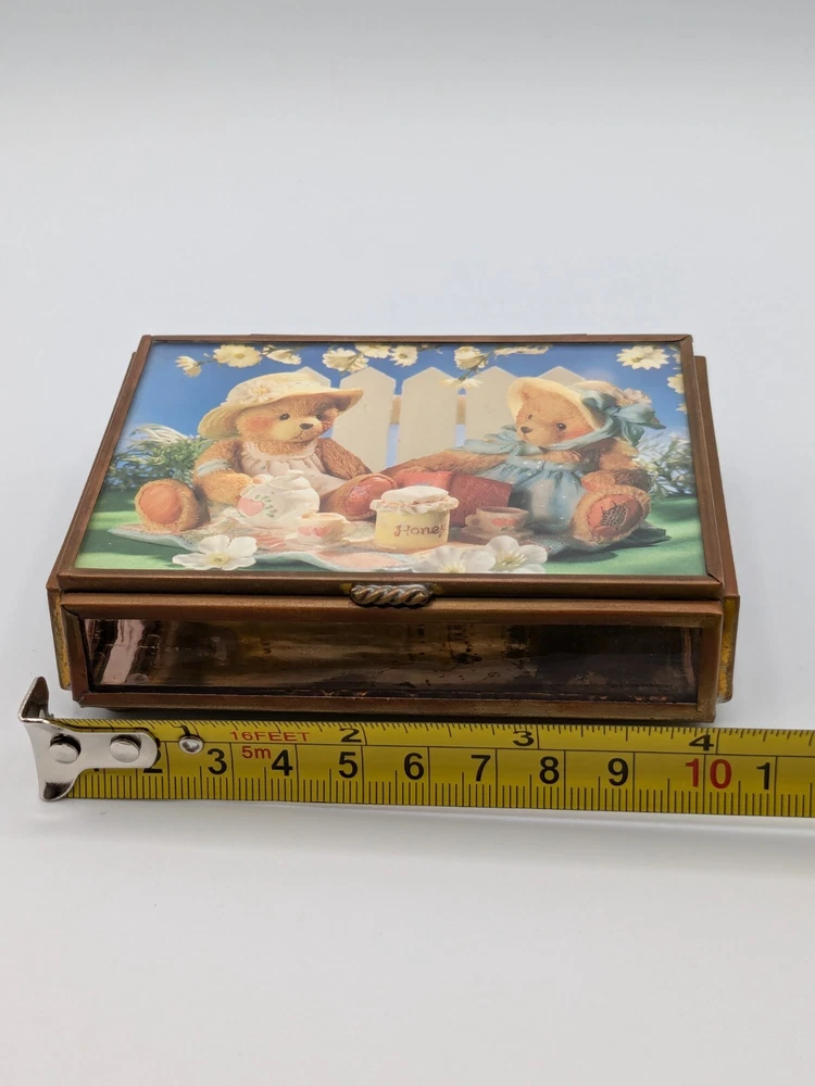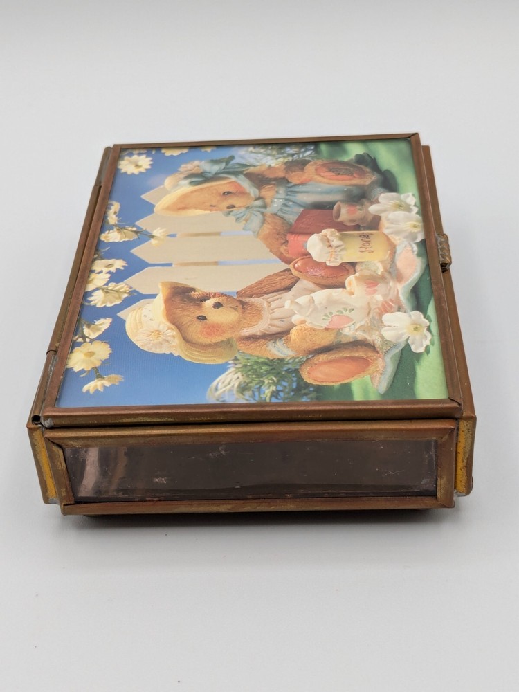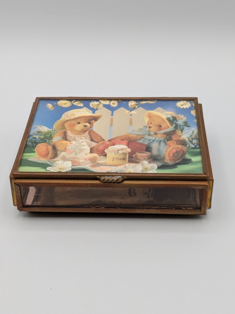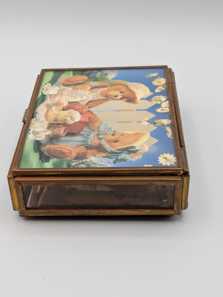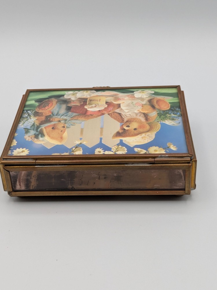 Cherished Teddies glass and brass trinket box with mirror base inside, measures 4" x 3" x 1". Pre-owned with one foot on the bottom missing as shown in photo; priced accordingly. CB Treasures ships same day / next day! All items are stored in a clean, smoke-free, and dog-free environment. Our Cherished Teddies are carefully packed -- bubble wrapped -- to guarantee their safe arrival to you.