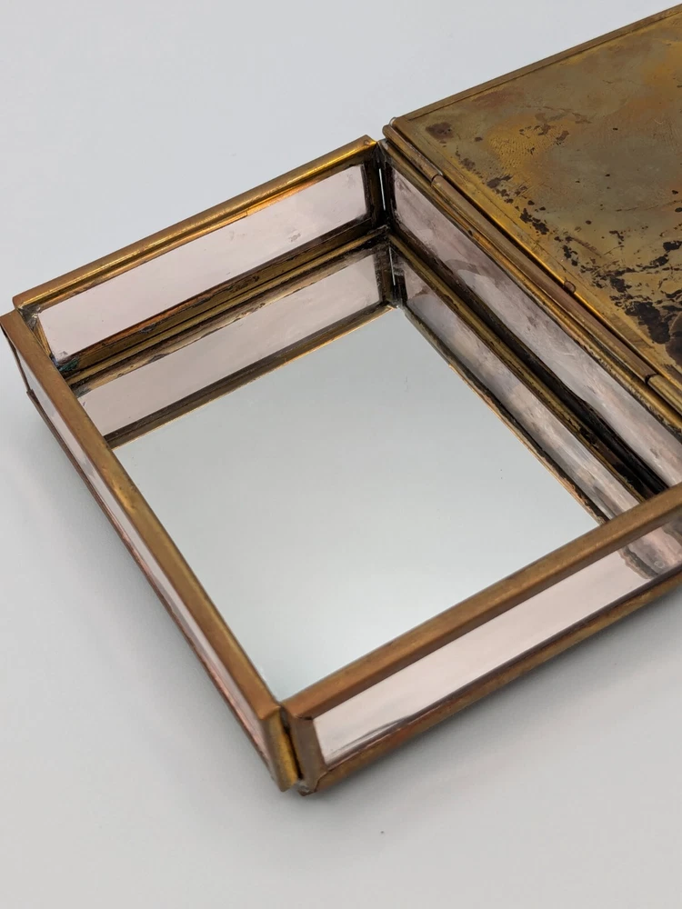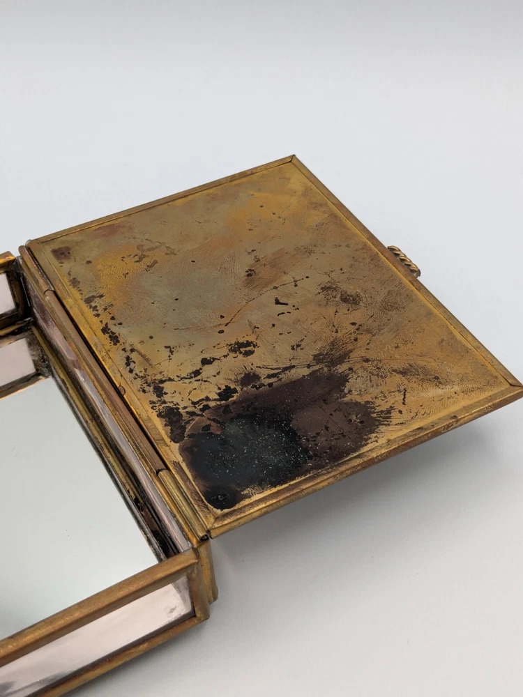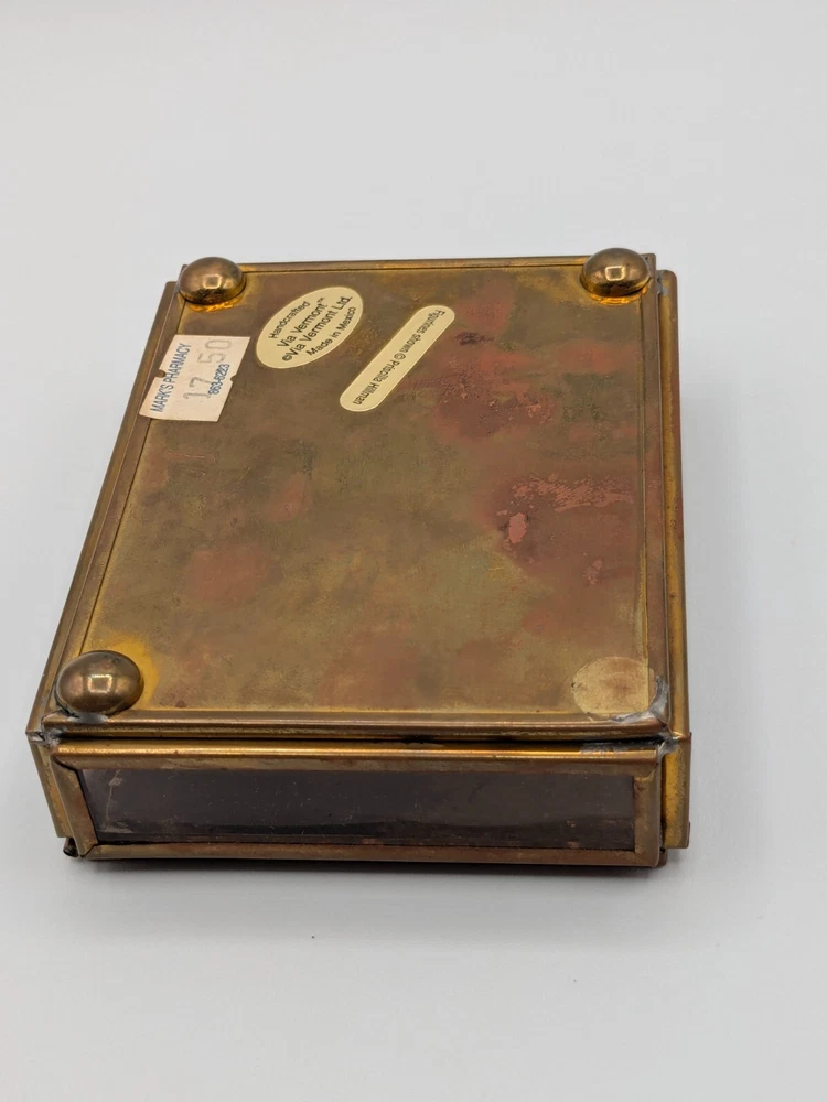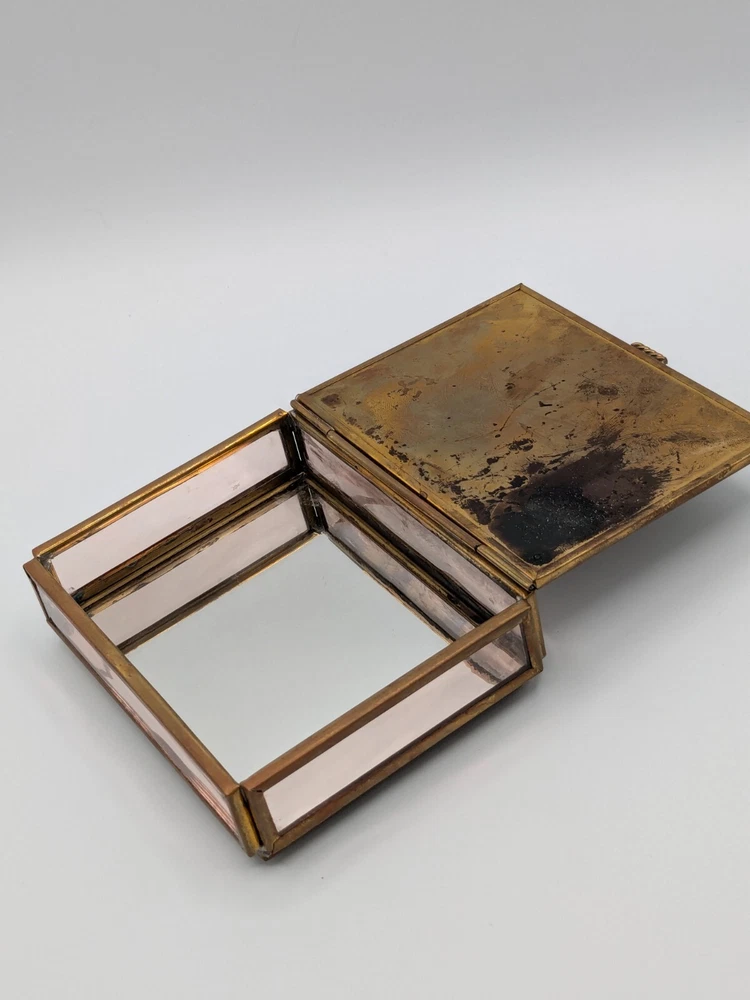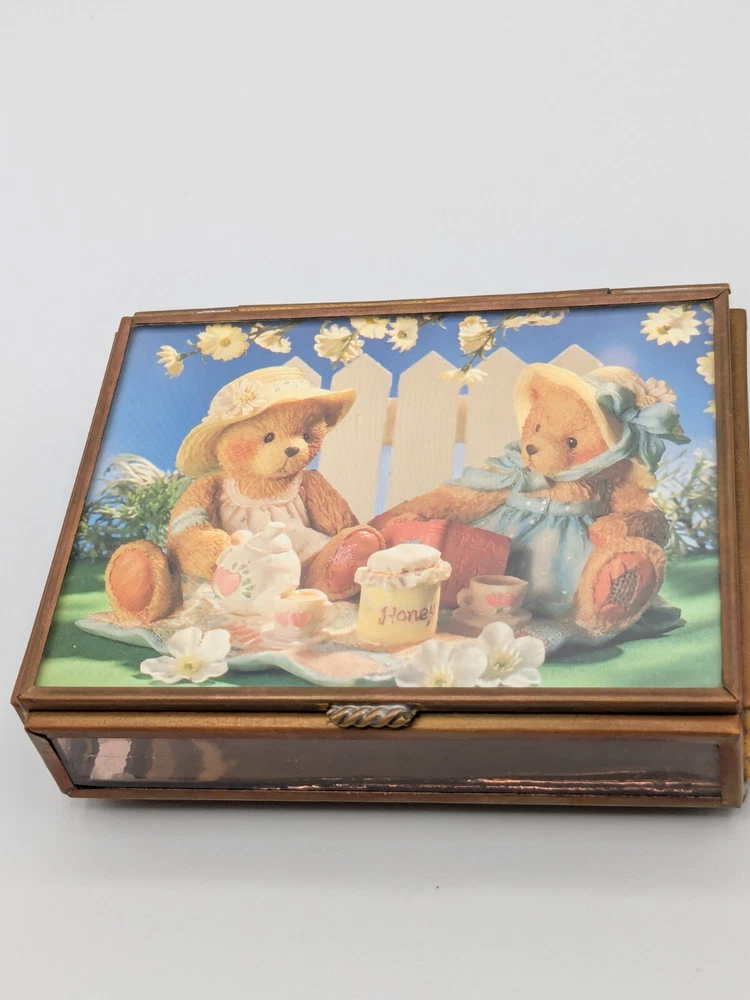 Cherished Teddies glass and brass trinket box with mirror base inside, measures 4" x 3" x 1". Pre-owned with one foot on the bottom missing as shown in photo; priced accordingly. CB Treasures ships same day / next day! All items are stored in a clean, smoke-free, and dog-free environment. Our Cherished Teddies are carefully packed -- bubble wrapped -- to guarantee their safe arrival to you.