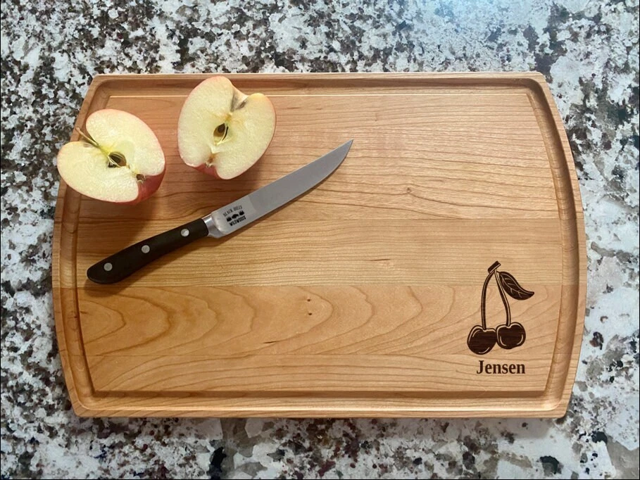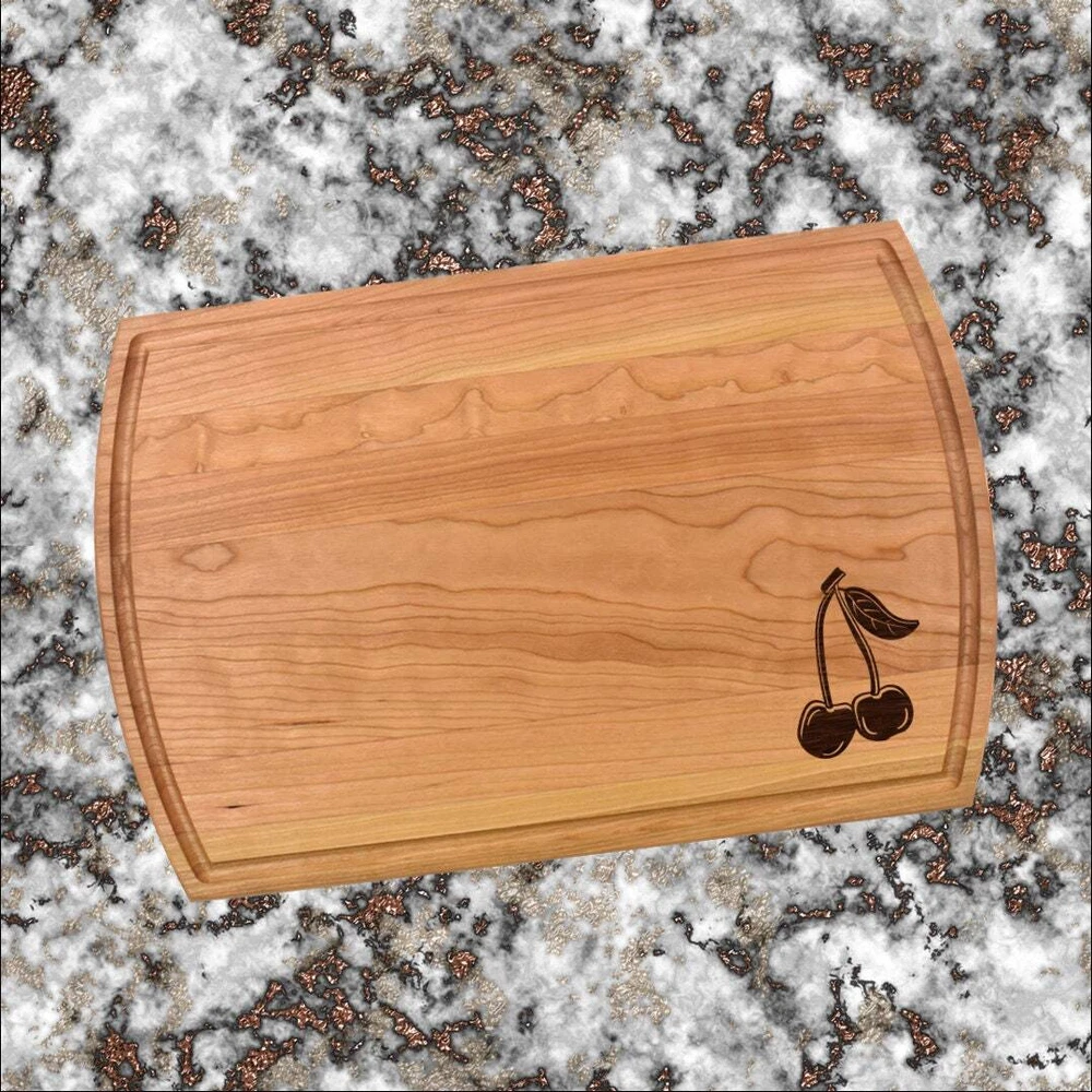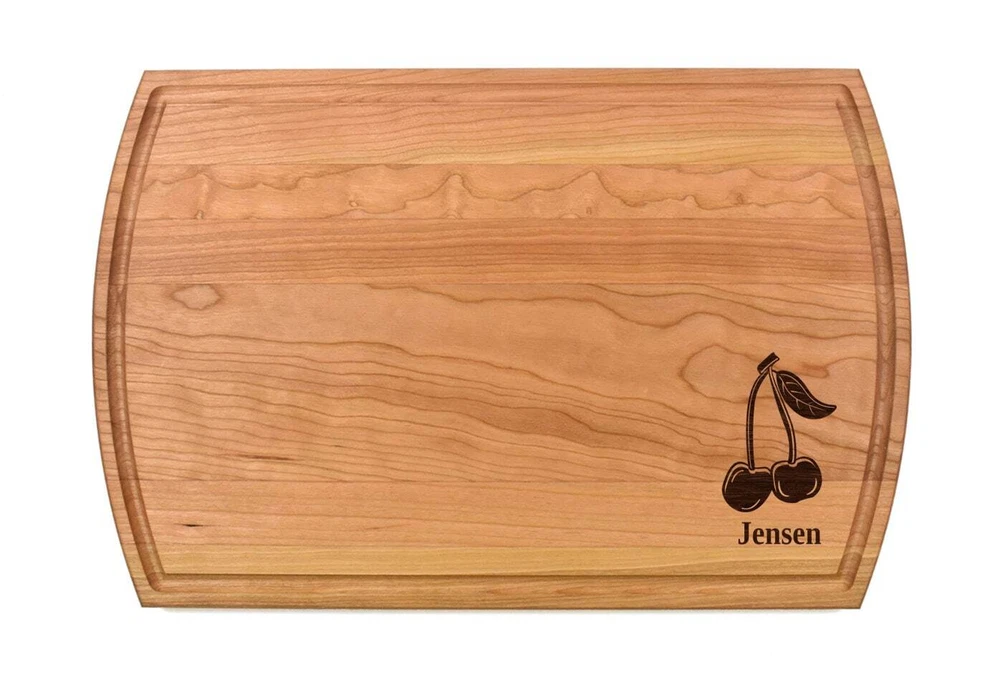 Design: Personalized Cherry Cutting Board or Charcuterie Serving Tray All items ship via USPS - please make sure your address is correct :-) Whether used as a charcuterie serving tray for snacks or cutting board, our bamboo, walnut and cherry custom boards are the perfect addition for the home and make the perfect gift for your loved one celebrating a birthday, anniversary, new home, wedding, etc! *** FEATURES *** • SIZES: We have multiple styles and sizes available. To see our current sizes available, click the drop-down menu. The photo slide contains a photo showing each side by side. Please note, the board with the juice groove only has the groove on the front side of the board. • THICKNESS: Bamboo Boards - Approximately 1/2" Thick; Walnut & Cherry Boards - Approximately 3/4” Thick • UNIQUE: Every board is unique with the grain and coloring varying throughout - no board is the same! • CARE INSTRUCTIONS: Hand wash only with warm water. Do not soak. Please apply mineral oil throughout the board’s life. • PERSONALIZATION/CUSTIMIZATION: Do you want the text placed differently on the board? Please don’t hesitate to contact us. All personalization notes can be entered in the personalization box when checking out. • SHIPPING: All cutting boards ship within 2 to 5 business days. • WHOLESALE ORDERS: Please don’t hesitate to contact us for information about wholesale orders. Processing times for larger orders may change. • NOTE: Colors can vary a bit on different monitors and screens. Any props included in photos are not included. Please be sure to double-check your address to make sure it is accurate for USPS delivery. If a package is returned to us due to an invalid address, the buyer is responsible for all additional shipping charges. We appreciate you supporting small business – best wishes! For items ordered with simple edits, we do not send proofs since the layout doesn't change from the example(s). However, in the event there are requests that change the layout from the example(s), we do send proofs for approval before making the product. If you'd like a proof before we make the product, please note so in the personalization box.