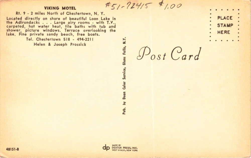 The postcard advertises the Viking Motel located on the shore of Loon Lake in the Adirondacks, specifically 2 miles north of Chestertown, New York. The motel offers large, airy rooms with amenities such as TV, carpeting, hot water heat, tile baths with tub and shower, and picture windows.