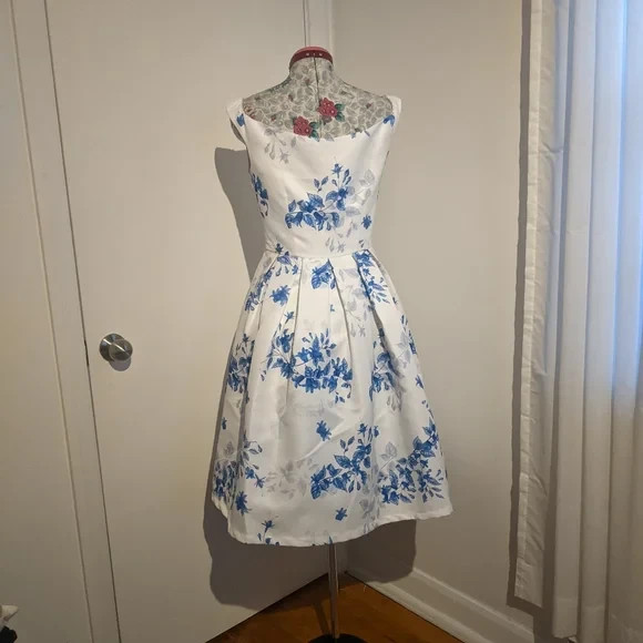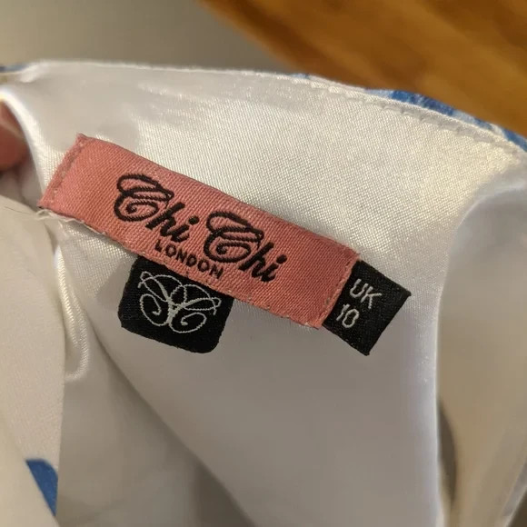 Emanate timeless elegance with the CHI CHI LONDON swing dress, a perfect choice for formal events, cocktail parties, and even weddings. The sweetheart neckline pairs harmoniously with the off-the-shoulder sleeve style, creating a flattering and feminine silhouette. The midi length, coupled with a fit & flare design, flatters the figure while offering comfortable movement.The dress features a delicate floral pattern set against a crisp white background, giving it a fresh and vibrant look. Made from a polyester blend, the dress is lined for extra comfort and crafted to maintain its beautiful shape. A discreet side zip closure ensures a seamless fit, making this garment a stunning addition to any fashion-conscious wardrobe. Bust 33 Waist 27 Skirt lenght 24