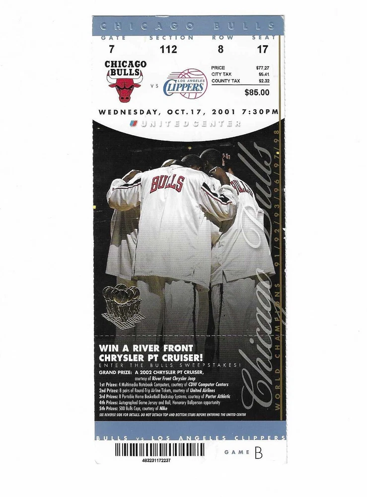 Chicago Bulls vs Los Angeles Clippers Unused Basketball Ticket From October 17, 2001 Here is 1 unused Chicago Bulls vs Los Angeles Clippers unused Basketball Ticket from October 17, 2001. The game took place at The United Center in Chicago, Illinois. The ticket is in good condition and would make an excellent addition to your collection. Payment Payment is due within 24 hours of sale. Shipping Your item will be shipped within 24 hours of receipt of payment via US Mail. Terms and Conditions All Sales are final. No Refunds