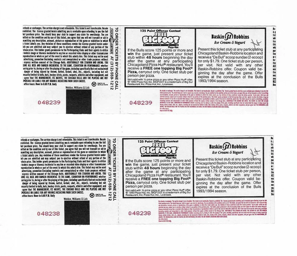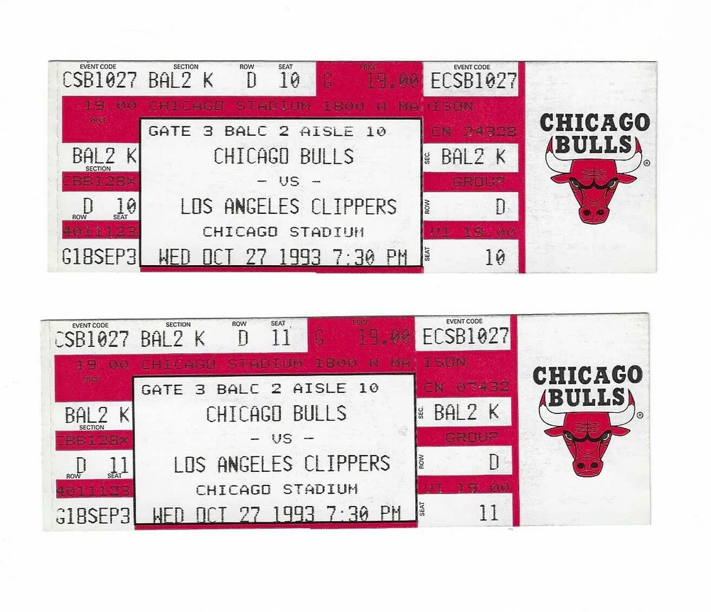 Chicago Bulls vs Los Angeles Clippers Unused Basketball Tickets from 10/27/1993