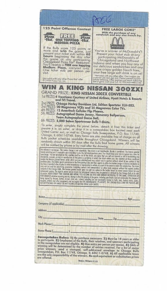Chicago Bulls vs Milwaukee Bucks Unused Basketball Ticket From January 18, 1995
