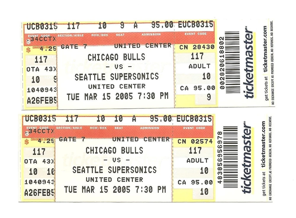 Chicago Bulls vs Seattle Supersonics Unused Basketball Tickets From March 15, 2005 Here are 2 unused Chicago Bulls vs Seattle Supersonics Basketball Tickets from March 15, 2005. The game took place at The United Center in Chicago, Illinois. The tickets are in fair condition and would make an excellent addition to your collection. Payment Payment is due within 24 hours of sale. Shipping Your item will be shipped within 24 hours of receipt of payment via US Mail. Terms and Conditions All Sales are final. No Refunds