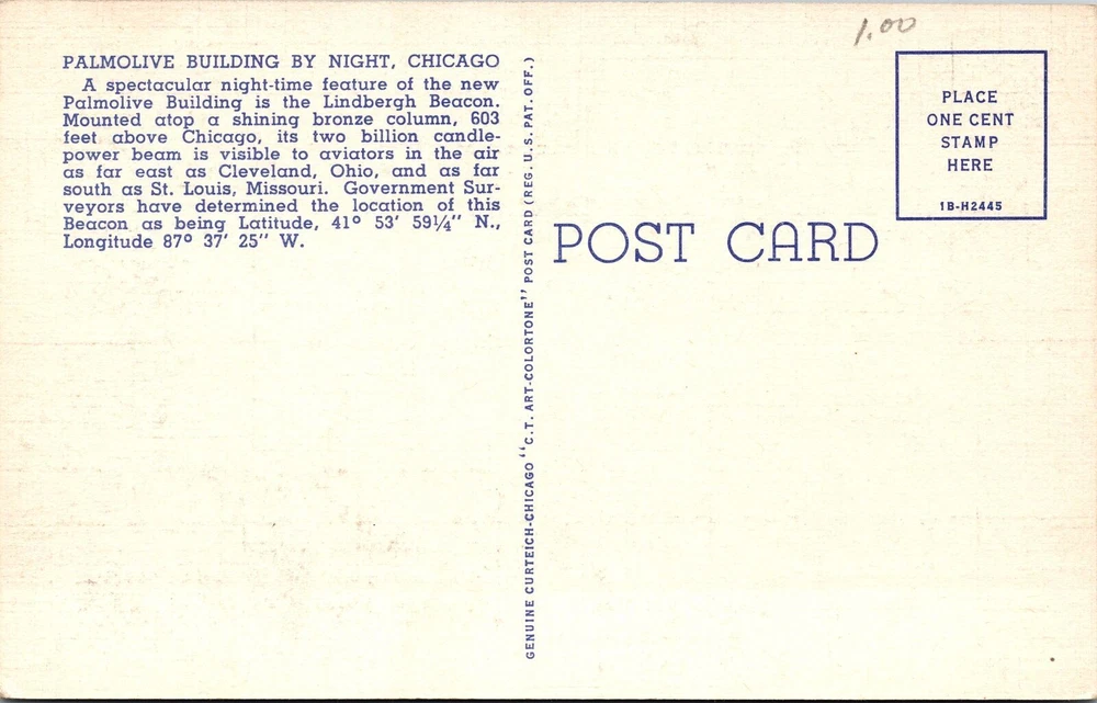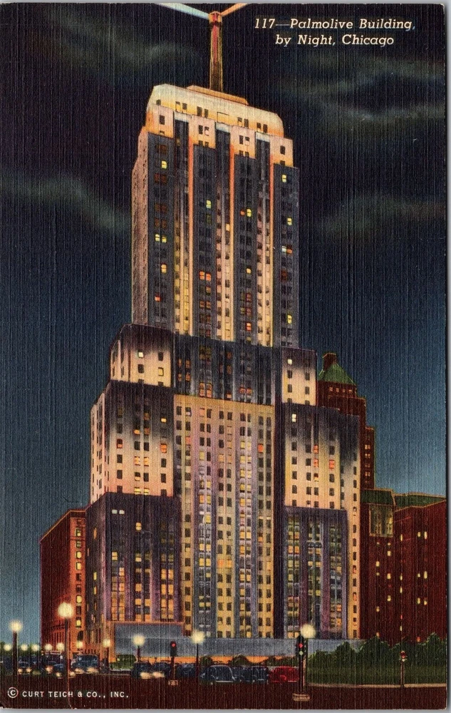 Chicago IL-Illinois, Palmolive Building By Night, Beacon Vintage Postcard
