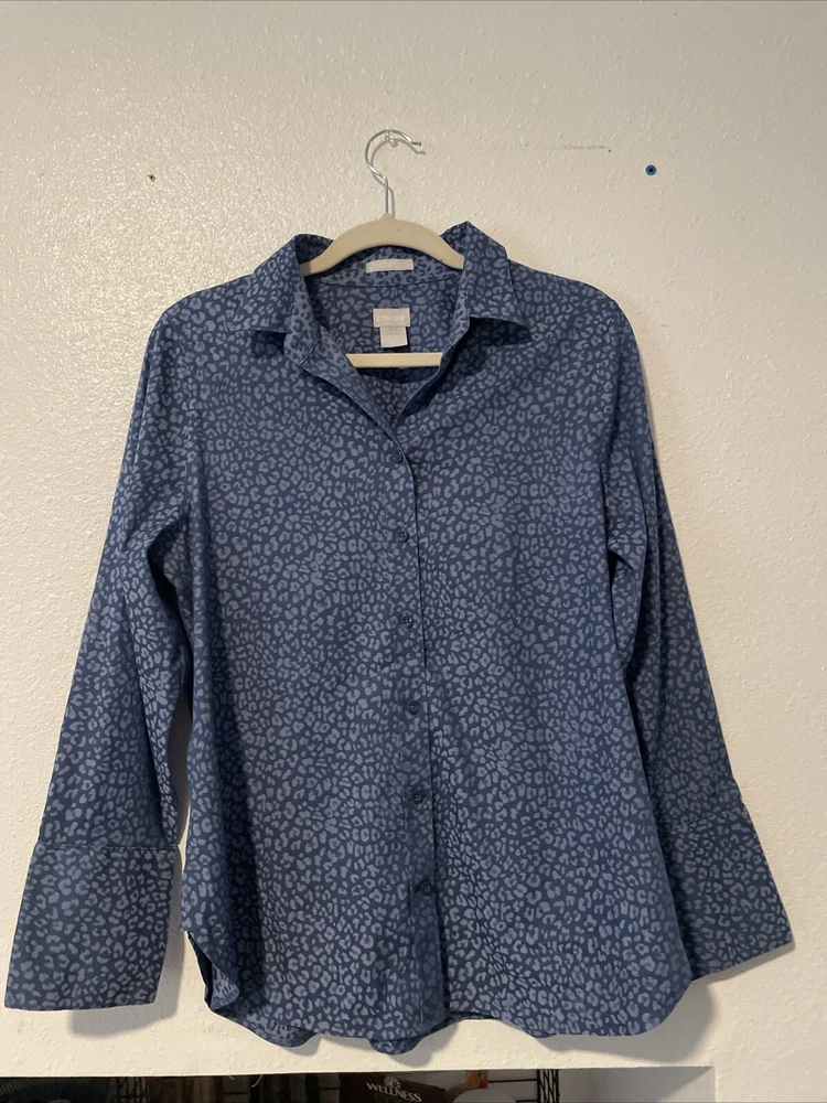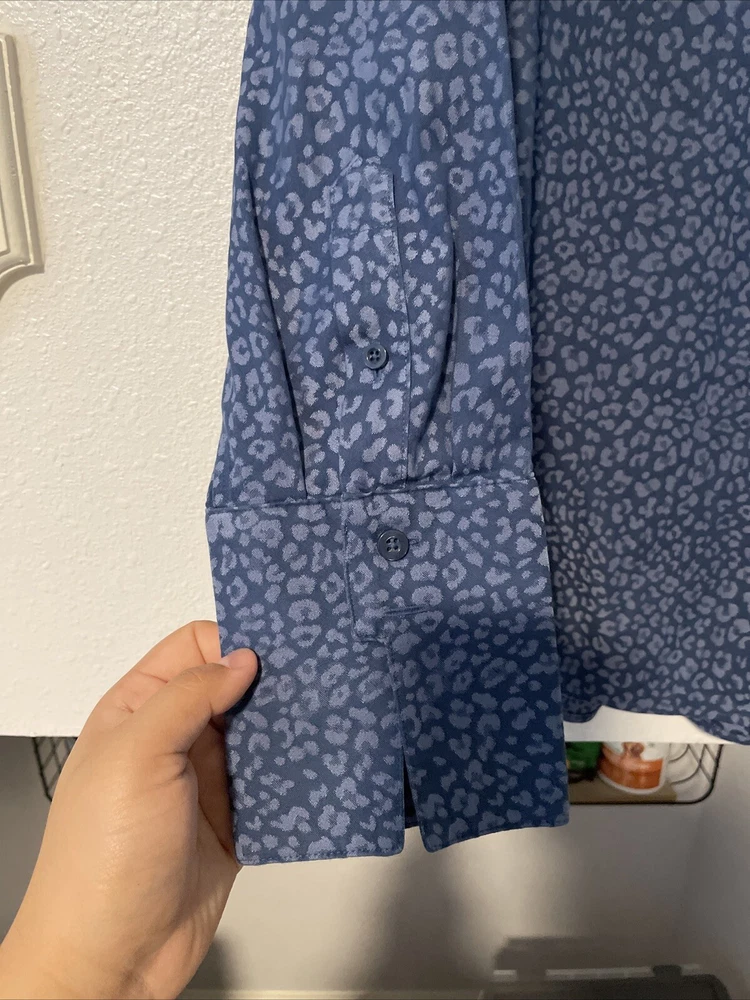 Material: Cotton Blend Type: Button-Up Sleeve Type: na Season: Fall, Spring, Summer, Winter Personalize: No gtin13: na Pattern: Animal Print Size: Size 1 Brand: Chico's MPN: na Features: All Seasons Size Type: Regular Strap Type: na Occasion: Business, Casual, Formal, Party/Cocktail, Travel, Wedding, Workwear Vintage: No Department: Women Theme: Classic Personalization Instructions: na Country/Region of Manufacture: Thailand Sleeve Length: Long Sleeve Fit: Regular ISBN: na Garment Care: Machine Washable Accents: Button Character: na Style: Basic Handmade: No Closure: Button Neckline: Collared Color: Blue Fabric Type: na