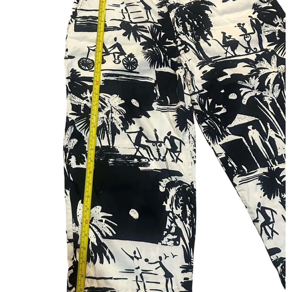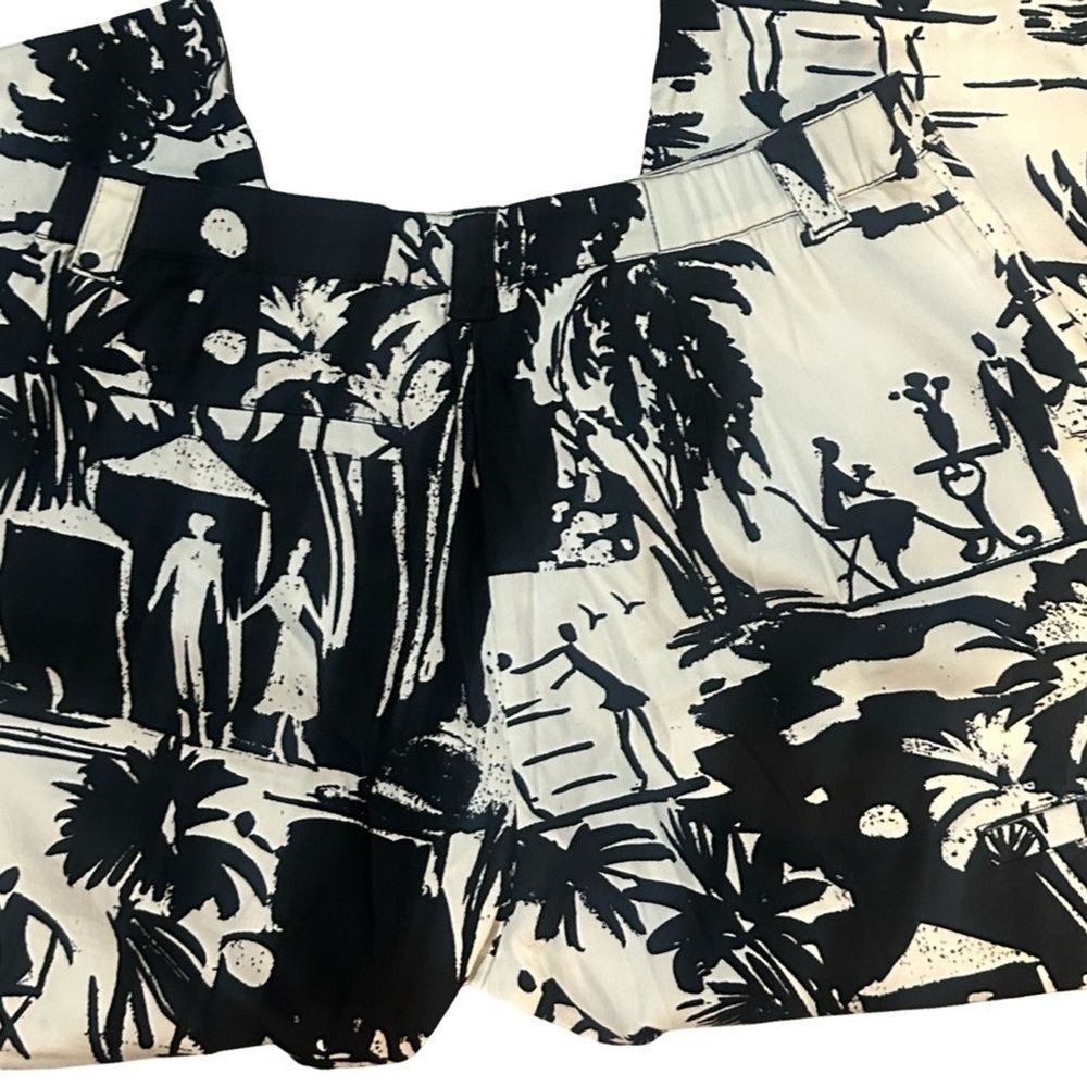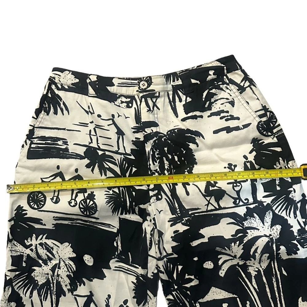 The Chico's Size 0 Black White Abstract Palm Beach Scene Cropped Pants Trousers are stylish and trendy dress pants designed for women. Made from spandex material, these wide-leg pants feature a beach theme with a black and white abstract palm beach scene. The cropped style adds a modern touch to the overall design, making them suitable for various occasions. With the trusted brand of Chico's, these pants offer a comfortable and fashionable fit for women looking to make a statement with their clothing choices.