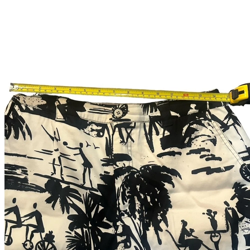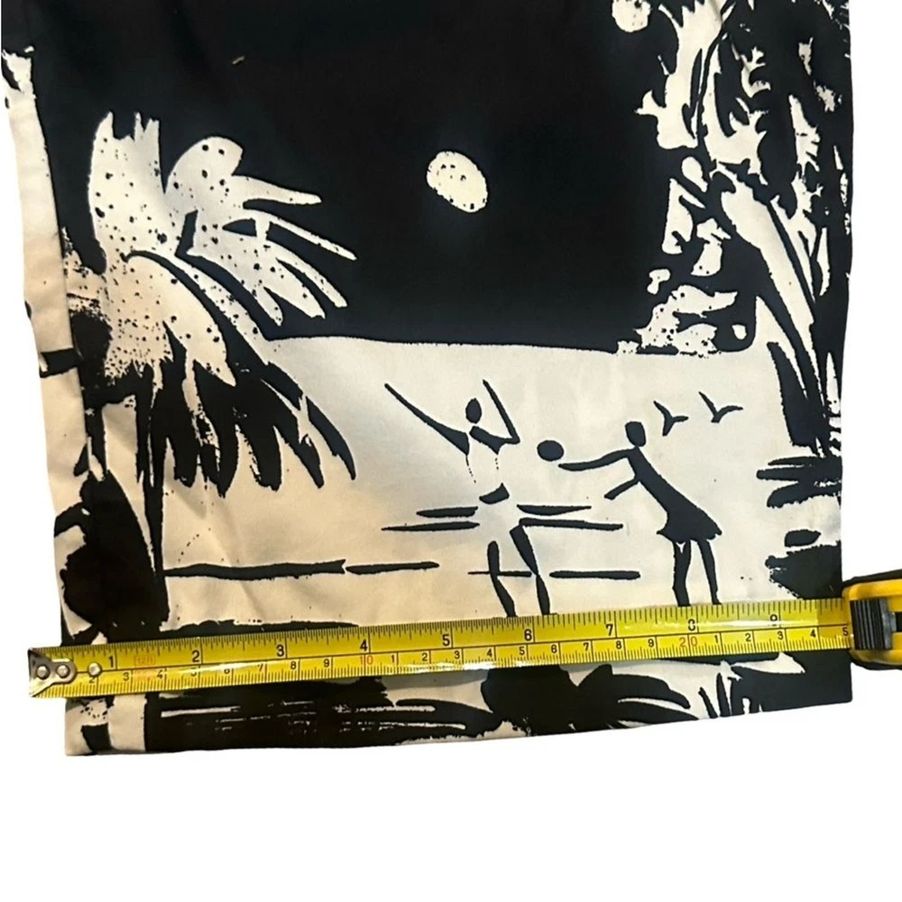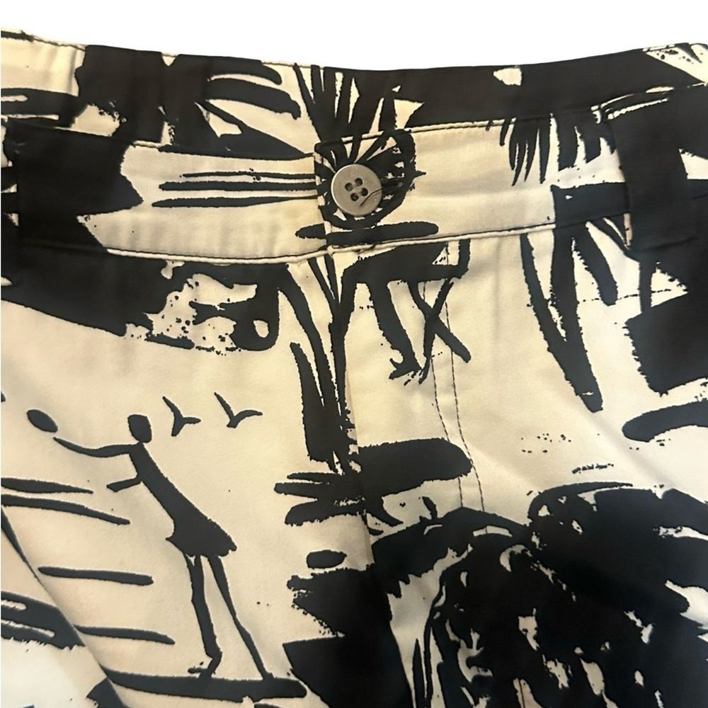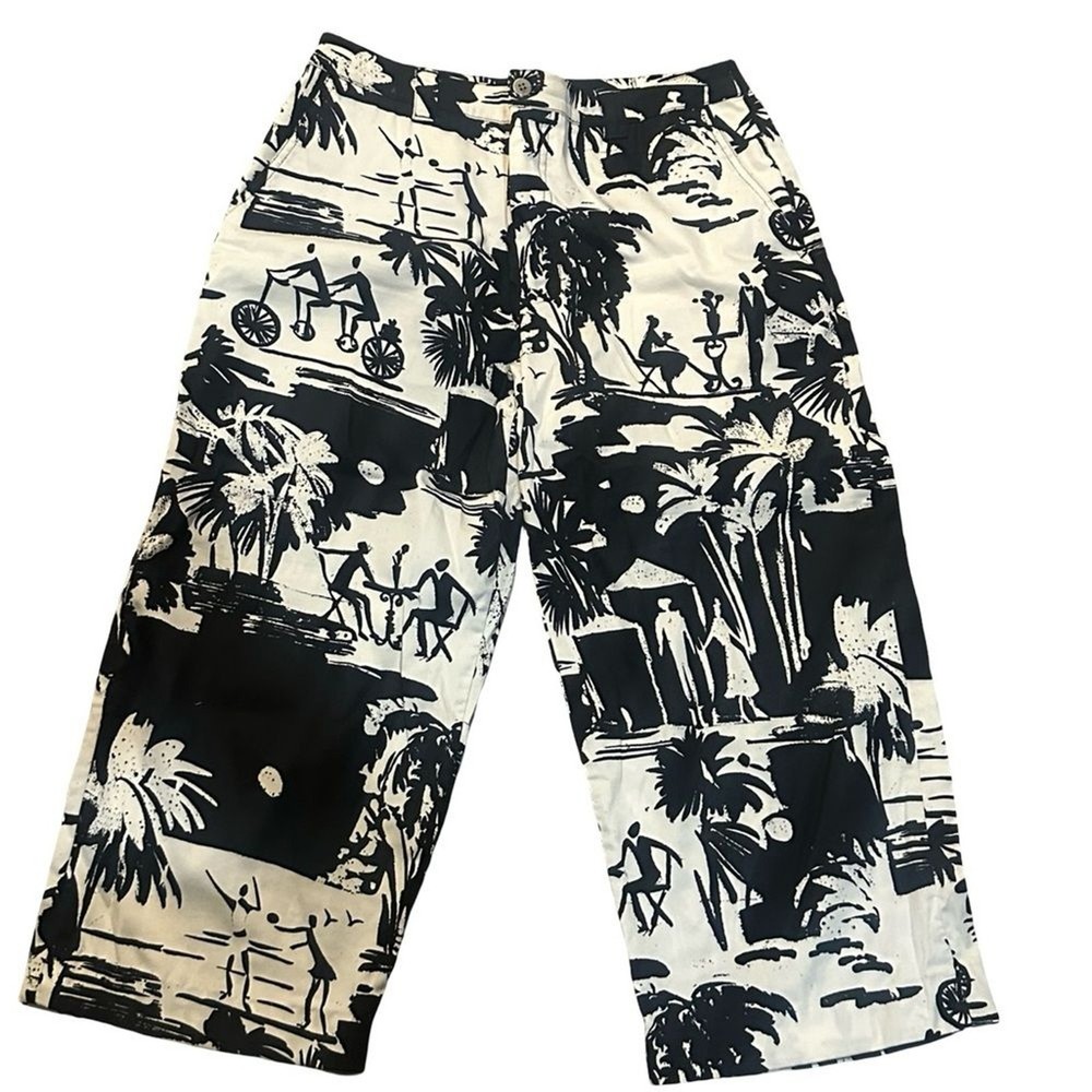 The Chico's Size 0 Black White Abstract Palm Beach Scene Cropped Pants Trousers are stylish and trendy dress pants designed for women. Made from spandex material, these wide-leg pants feature a beach theme with a black and white abstract palm beach scene. The cropped style adds a modern touch to the overall design, making them suitable for various occasions. With the trusted brand of Chico's, these pants offer a comfortable and fashionable fit for women looking to make a statement with their clothing choices.