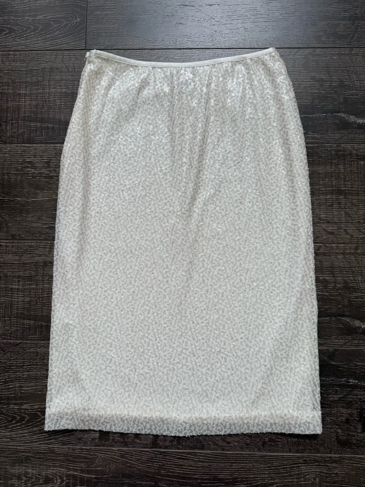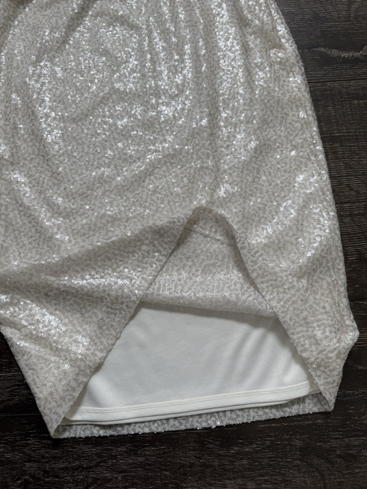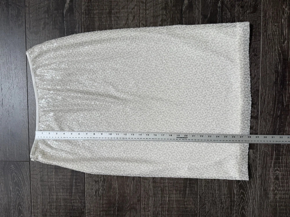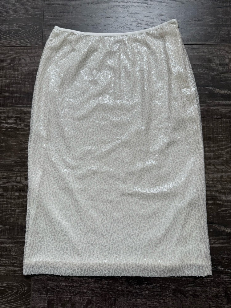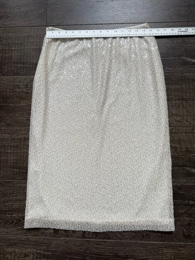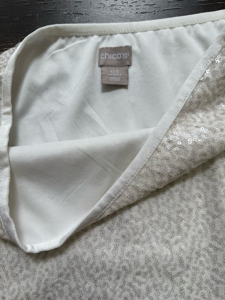 The Chico's Women’s White Sequins Lined Pencil Skirt in size 6 is a stylish and versatile piece suitable for various occasions including weddings, parties, and casual or formal events. Made from a polyester cotton blend satin fabric, this skirt features a high rise with a zip closure and beautiful sequin accents. The midi length and straight pencil style make it a flattering and elegant choice for any season, while the lined and lightweight design ensures comfort and easy care through hand washing only. Made in India, this skirt adds a touch of sophistication to any wardrobe. Condition of the skirt is Pre-Owned in great shape! Shipped asap by USPS ground advantage mail.