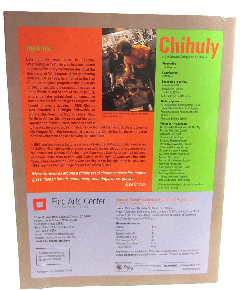 Chihuly, Glass Art, Tri Fold Folder, Exhibit April 2005 , US Seller. Folder from this wonderful display of Art Glass at the Colorado Springs Art Center, CO. Condition - Like new in good condition. No rips, tears, marks or repairs. Small spot on front. Year - 2005 You will receive the actual item pictured & described All our packages ship with tracking. Stored in & Ships from our smoke free - pet free home. If there is a problem please contact us we try to respond within a few hours. Thank you for visiting, please visit us again, real soon. HerbsCraftsGifts