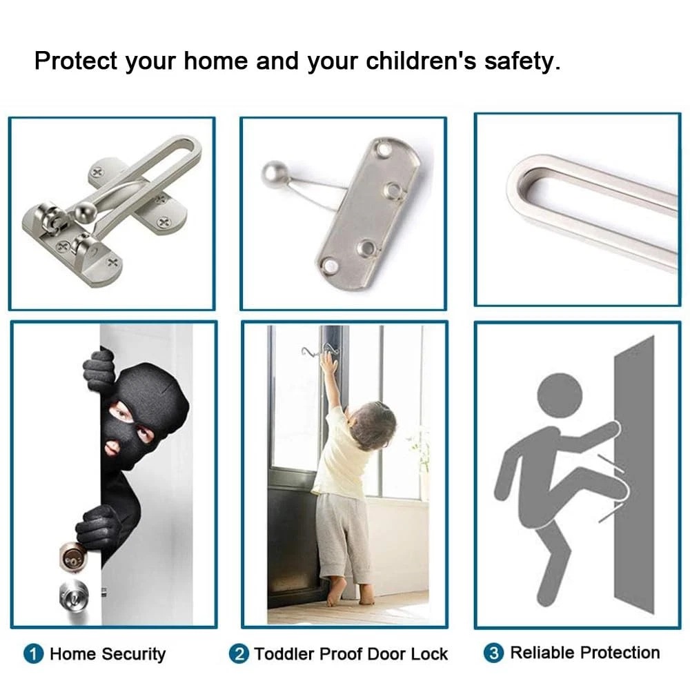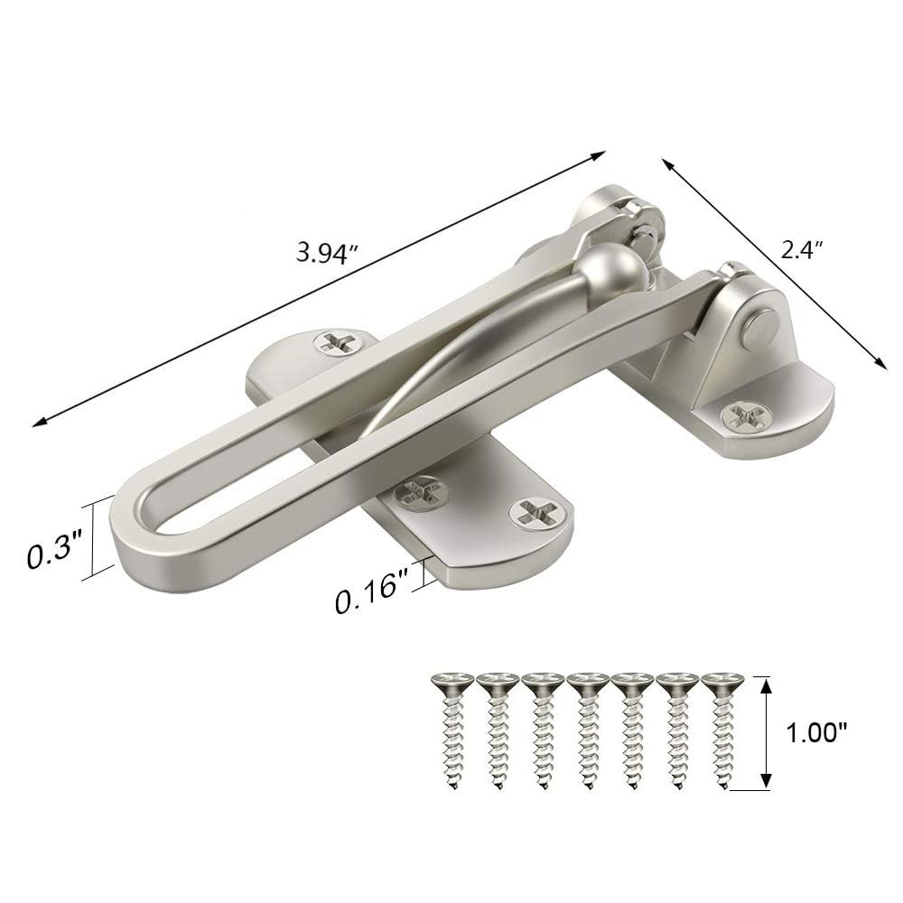 【Home Reinforcement Lock】The U Swing Bar Lock is a security locking device for hinged swing-in doors, allowing a door to be slightly opened to allow safe viewing and ventilation. 【Childproof Door Reinforcement Lock】Out of reach swing bar lock catch prevents children from opening the door themselves for child-safe door security. 【Safety Door Lock】Door security locks are constructed from premium solid aluminium alloy with beautiful polishing and finish,durability and rust proof. 【Home Security Door Lock】2 Pack door latches, each latch is equipped with 7 screws,easy to install. 【Safety and Lovely Home Ddecor】The rocker door lock is suitable for homes, offices, hotels, motels and other places that need limit door opening and door security, easy to unlock from inside in an emergency, not easy to be forced open from the outside.