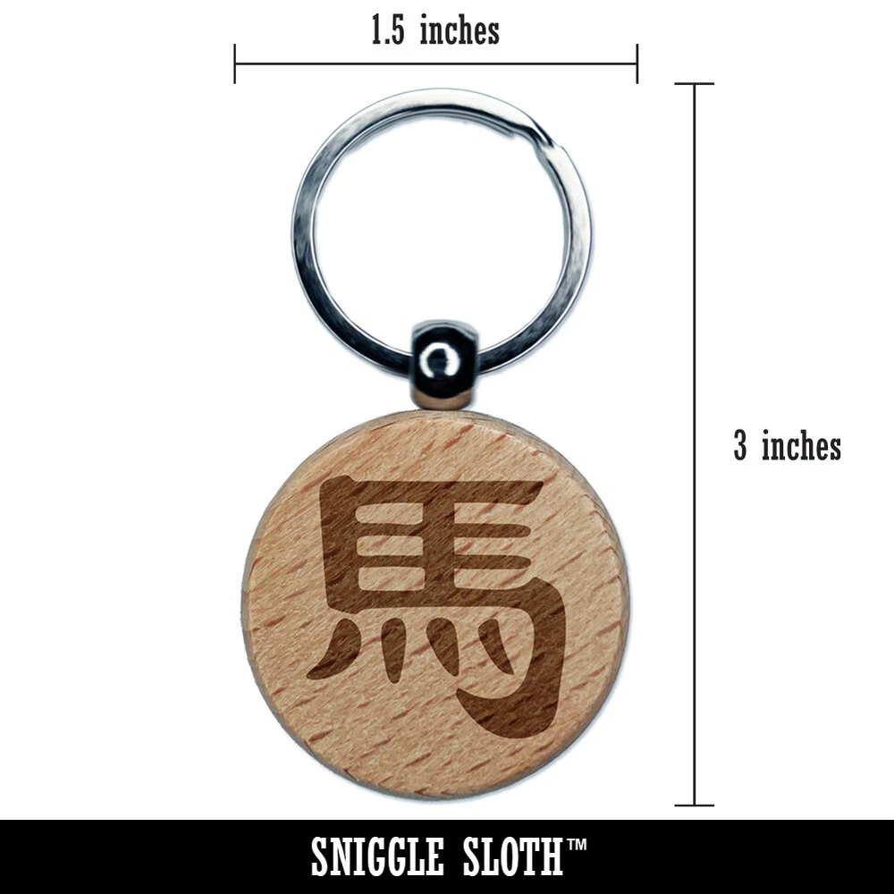 Chinese Character Symbol Horse Engraved Wood Round Keychain Tag Charm