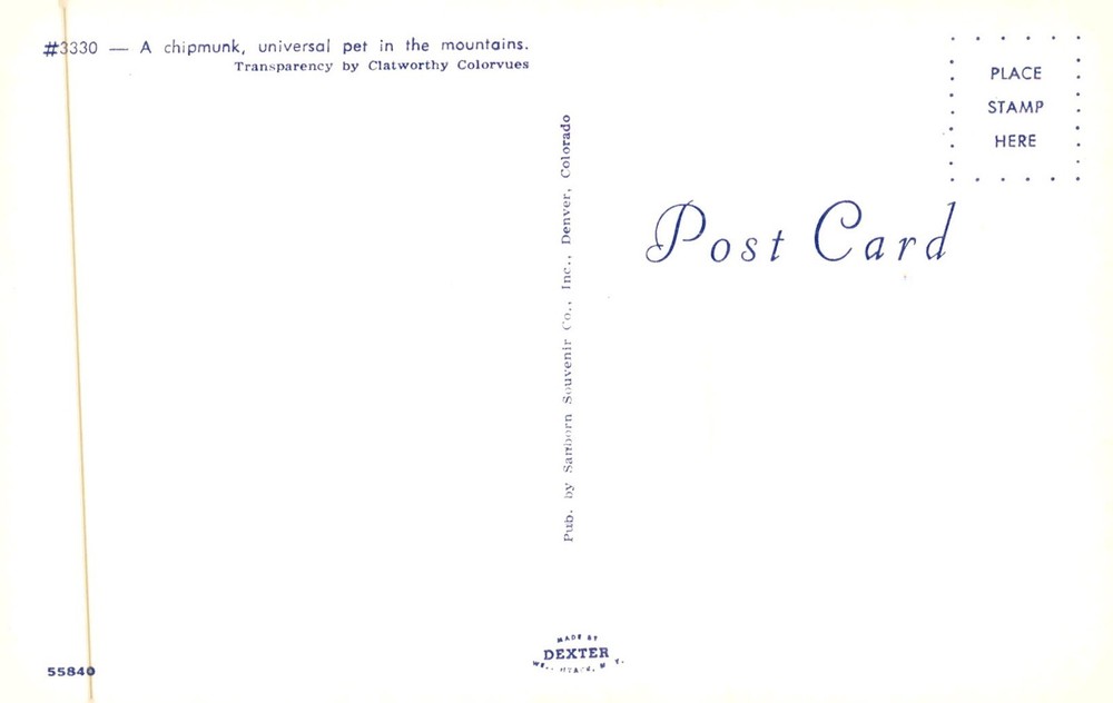 MAKE AN OFFER. THE MORE YOU BUY THE BETTER DEAL I WILL ACCEPT This postcard features a chipmunk, a common pet in mountainous regions. It was produced by Clatworthy Colorvues and published by Sanborn Souvenir Co., Inc. in Denver, Colorado.