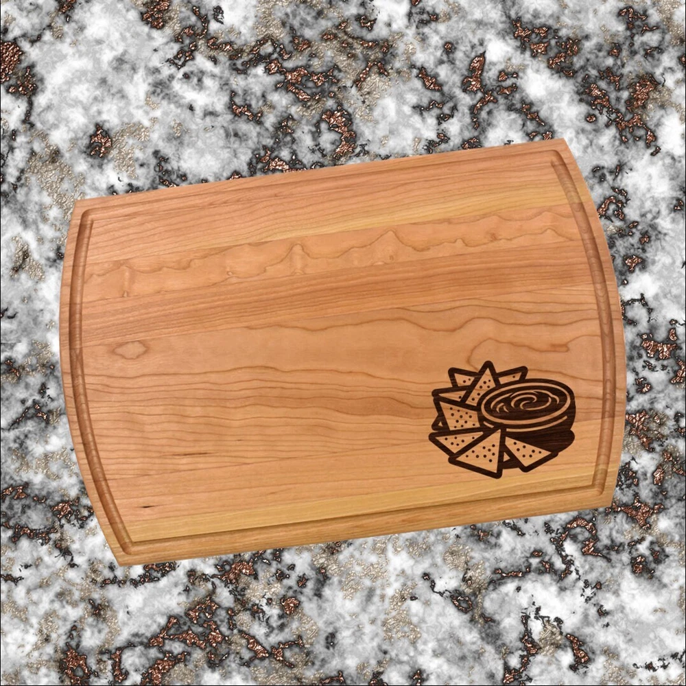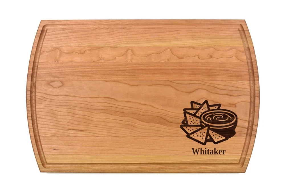 Design: Personalized Chips and Salsa Queso Dip Cutting Board or Charcuterie Serving Tray All items ship via USPS - please make sure your address is correct :-) Whether used as a charcuterie serving tray for snacks or cutting board, our bamboo, walnut and cherry custom boards are the perfect addition for the home and make the perfect gift for your loved one celebrating a birthday, anniversary, new home, wedding, etc! *** FEATURES *** • SIZES: We have multiple styles and sizes available. To see our current sizes available, click the drop-down menu. The photo slide contains a photo showing each side by side. Please note, the board with the juice groove only has the groove on the front side of the board. • THICKNESS: Bamboo Boards - Approximately 1/2" Thick; Walnut & Cherry Boards - Approximately 3/4” Thick • UNIQUE: Every board is unique with the grain and coloring varying throughout - no board is the same! • CARE INSTRUCTIONS: Hand wash only with warm water. Do not soak. Please apply mineral oil throughout the board’s life. • PERSONALIZATION/CUSTIMIZATION: Do you want the text placed differently on the board? Please don’t hesitate to contact us. All personalization notes can be entered in the personalization box when checking out. • SHIPPING: All cutting boards ship within 2 to 5 business days. • WHOLESALE ORDERS: Please don’t hesitate to contact us for information about wholesale orders. Processing times for larger orders may change. • NOTE: Colors can vary a bit on different monitors and screens. Any props included in photos are not included. Please be sure to double-check your address to make sure it is accurate for USPS delivery. If a package is returned to us due to an invalid address, the buyer is responsible for all additional shipping charges. We appreciate you supporting small business – best wishes! For items ordered with simple edits, we do not send proofs since the layout doesn't change from the example(s). However, in the event there are requests that change the layout from the example(s), we do send proofs for approval before making the product. If you'd like a proof before we make the product, please note so in the personalization box.