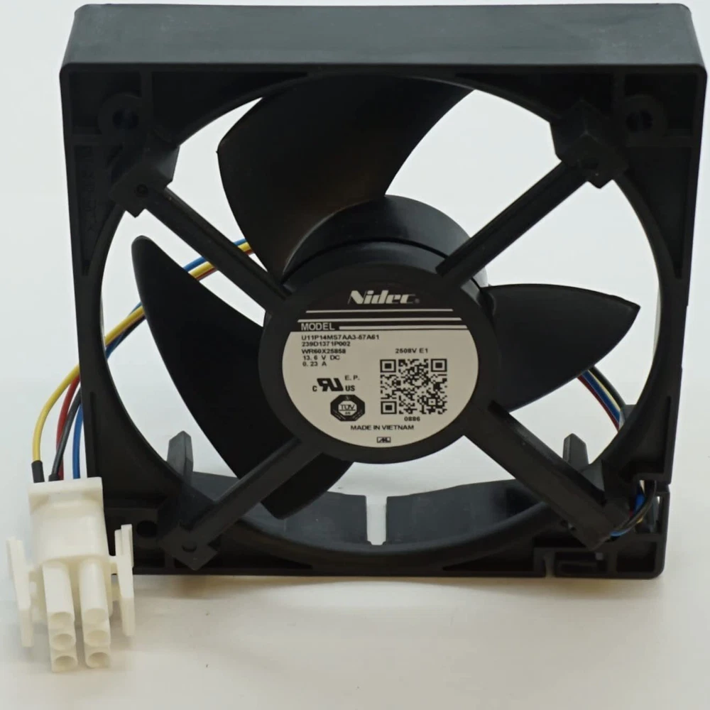Choice Manufactured Part number WR60X25858CM Refrigerator Evaporator Fan Motor for GE 13.6V DC, 0.23 Amp 3-5/8" mounting center to center 3-3/4" Diameter Fan Blade, 3 paddles 6 Prong Molex Plug, 4 Wires, Two Holes are Empty in the Plug Replacement for numbers U11P14M7AA3-57A61, 239D1371P002, WR60X25858, WR60X10340, PS12727431, AP6891698 Designed to fit specific General Electric Refrigerator Makes and Models Choice Manufactured Part number WR60X25858CM Refrigerator Evaporator Fan Motor for GE 13.6V DC, 0.23 Amp Replacement for numbers U11P14M7AA3-57A61, 239D1371P002, WR60X25858, WR60X10340, PS12727431, AP6891698 Designed to fit specific General Electric Refrigerator Makes and Models