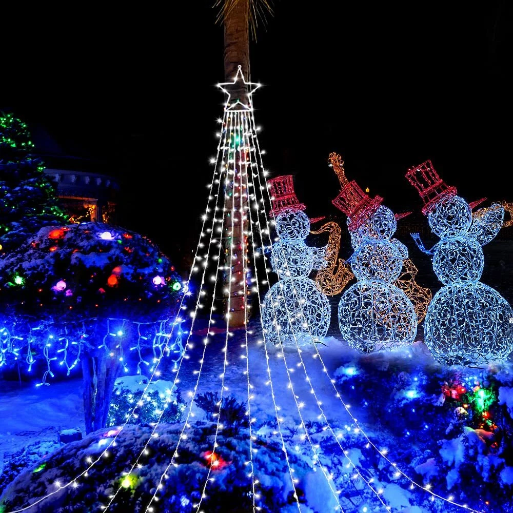 ⭐【Unique Large Christmas String Lights】Glowing in 320 LEDs, our Christmas string light also has a 12.6" metal star with the tail of 9 light strings, each string is 10.4 feet long and looks like a comet when falling down. Light up your house or yard with the outdoor Christmas star lights! ⭐【Outdoor Christmas Decorations】 Our Christmas string lights works great with trees from around 8 feet to 13 feet tall. You can also hang the treetop starlight to decorate your room, curtain, window, or outdoor yard. Simply hang the big star about 10 feet up on an exterior wall, then drape the 9 lights string down to the ground. You can also hang them sideways more like a shooting star. It will be a beautiful addition to the home or outside decorations. ⭐【8 Lighting Modes & Waterproof】 These falling star Christmas lights have 8 different light patterns to choose from: combination, in waves, sequential, slo-glo, chasing/flash, slow fade, twinkle/flash, and steady on. IP44 waterproof led tree decoration starlight is perfect for home indoor and outdoor decorations. Available to resist all types of weather well. ⭐【Easy & Safe to Use】Directly plugs in and unplug this led Christmas starlight for power on and off. With a 30V low-voltage adapter, the outdoor decoration star is safe to touch and will keep at a low-temperature state after lighting up for hours. Safe, power-saving, creating a dazzling light for your house. ⭐【 Christmas Decorations & Ideal Gift】 The star Christmas lights can be used for a tree, yard, outdoor, wedding, or Christmas, as well as great gifts for family, lovers, friends, colleagues, neighbors for holidays, New Year, birthday, wedding, festival, etc.
