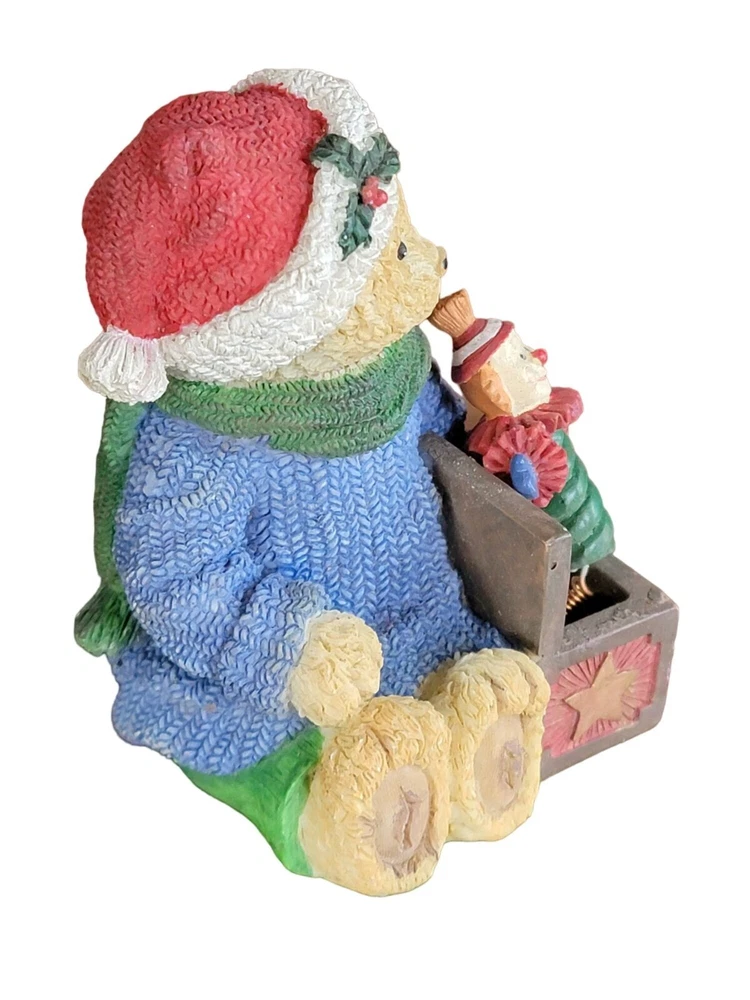 Vintage Christmas Decoration Teddy Bear w/ Jack In The Box is a multicolored, 3"x4" table top ornament made from poly-resin. Covered in an all-over pattern, it's a festive addition to any home. • Brand: Unbranded • Size: 3" D x 4" H • Color: Multicolored • Material: Poly Resin • Style: Table Top Ornament, Christmas Decor • Pattern: All Over Pattern Features: • Very Detailed • Table Top Ornament, Christmas Decor Size: 3" D x 4" H Condition: Pre-Owned Good Good Condition Gently Used Please be sure review all photos and description closely before purchasing, thank you! Smoke free work space Please read the description for further details and measurements, Thank you!