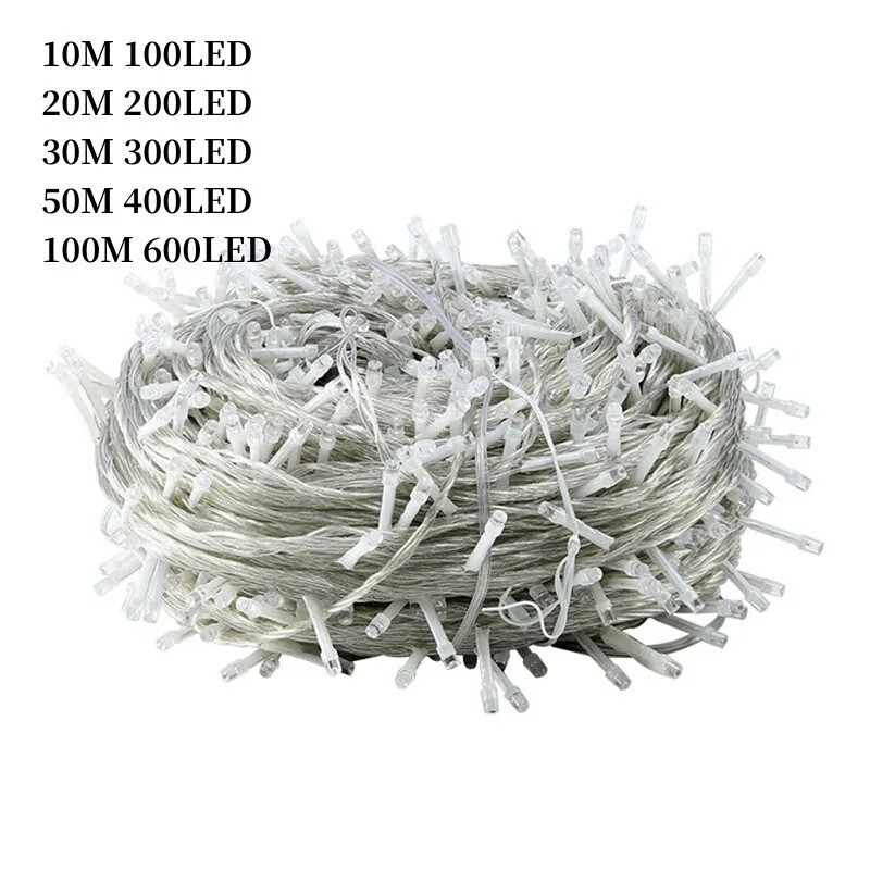 Outdoor Christmas LED String Light Garlands Decoraction Fairy Lamp Specifications Description Versatile Use :These LED string lights are perfect for various occasions such as Christmas, weddings, parties, and holidays, adding a festive touch to your celebrations. High-quality material:Made in Mainland China, these lights are composed of RoHS-certified beads, ensuring durability and safety in use. Extensive Coverage :With a 10M length, these lights can cover a significant area, providing ample lighting for your events. Easy Installation :Featuring a EU plug, these lights are easy to install, making them a convenient choice for your decorations. Fairy-Like Design :Their fairy-like design adds a whimsical and magical touch to your decorations, enhancing the overall ambiance. Energy-Efficient :Despite their brightness, these lights are energy-efficient, making them a cost-effective choice for your lighting needs. Features Mini and artistic appearance, it is easy to carry. With multicolor light, it looks very beautiful at the night. String Light with 100 to 2000 LED little bulbs. Low power consumption, safe and reliable One-button-operation design, it is more convenient to use Oceans of little stars twinkle, flash and change magically It can be put or hung on walls, windows, doors, floors, ceilings, grasses, Christmas trees, etc. Every string has 8 different modes: combination, in waves, sequential, SLO GLO, chasing/flash, slow fade, twinkle/flash, and steady on Super bright and perfect decoration for valentine's Day, Christmas, other holidays, parties, weddings, etc. The lights string is rain-proof but the plug and the controller are non-waterproof, you should protect them well when using them outside. NOTE: 10M, 20M LED string light with tail plug, can be connected to as much as 100 meters together(5pcs together), 30M, 50M, and 100M without a tail plug. specification Input Voltage: AC 110V-220V Light color: warm white, white, multicolor LED Qty.: 10M 100LEDs String Light length: 10M Plug to Control box Length: About 50~60cm Control box to first LED Length: About 10~15cm Distance between every 2 bulbs: Approx. 9cm Working Environment: Indoor and Outdoor Long-life: >50,000 hours Certification: CE & RoHS Cable color: Transparent Waterproof: IP44 (Note: The control box and Plug is not waterproof) Package includes 1X LED String Light About The Details Highlight / 8 Lighting Mode / US,EU Plug Scenes Shows Application to decorate your Home, Wedding, Garden, Christmas, Party, Festival, etc.