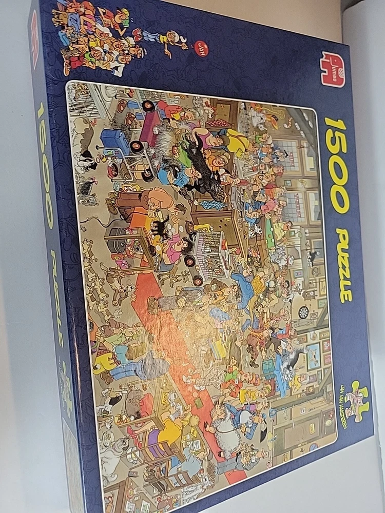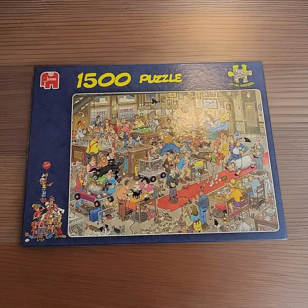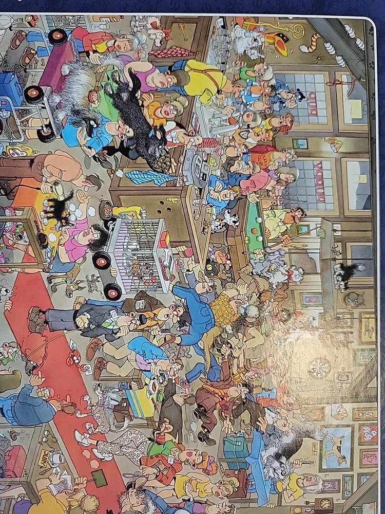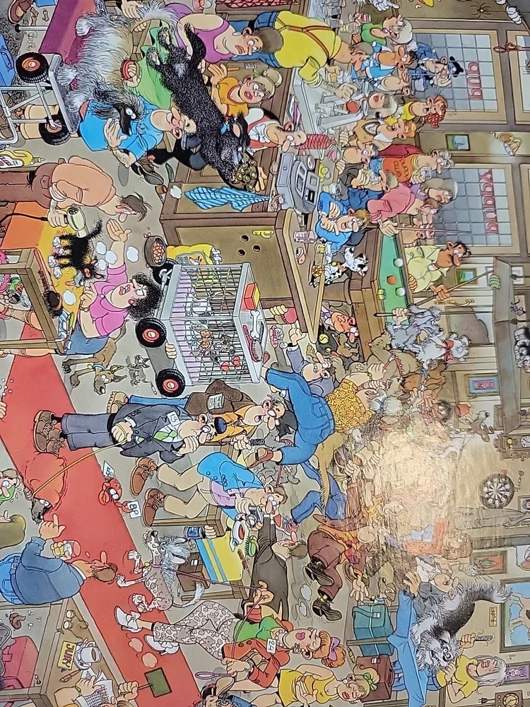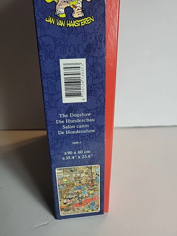 The Dogshow 2009 90cm x 60cm Rare puzzle Jumbo Was assembled 1x and bagged neatly Puppy cats dogs Grooming pets puppy pup fun fun puzzle to assemble Jan Van Haasteran Jigsaw Puzzles Jan Van Haasteran Puzzles - Jan Van Haasteren was born in 1936, in Schiedam, The Netherlands. He has been creating humorous illustrations exclusively for Jumbo puzzles. His dedicated fans immediately search for his trademark – a shark fin – in each new jigsaw puzzle that comes out! Jigsaw puzzles by Jan Van Haasteran are a joy to put together! Jan Van Haasteren creates cartoon jigsaw puzzles that are crowded, silly, and even include a secret hidden shark fin. Jan Van Haasteren puzzles on sale now! Jan van Haasteren is a comic artist who has created these crowded and funny cartoon puzzles that are very silly and enjoyable even for adults. Every cartoon he creates features a hidden shark fin, can you find i