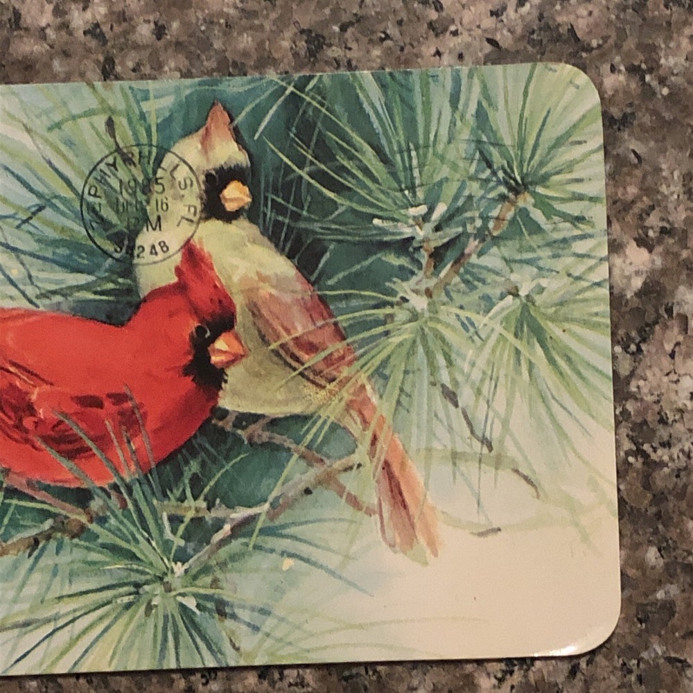 This vintage Christmas postcard features a charming scene of birds perched on a tree with pine needles, including a cardinal. With its postcard birds theme and holiday occasion, it captures the essence of the Christmas season. The printed lithograph design and the fact that it is an original piece from the 1980s add to its collectible value. Made in the United States, this postcard is a unique and nostalgic piece that would make a delightful addition to any Christmas card collection.