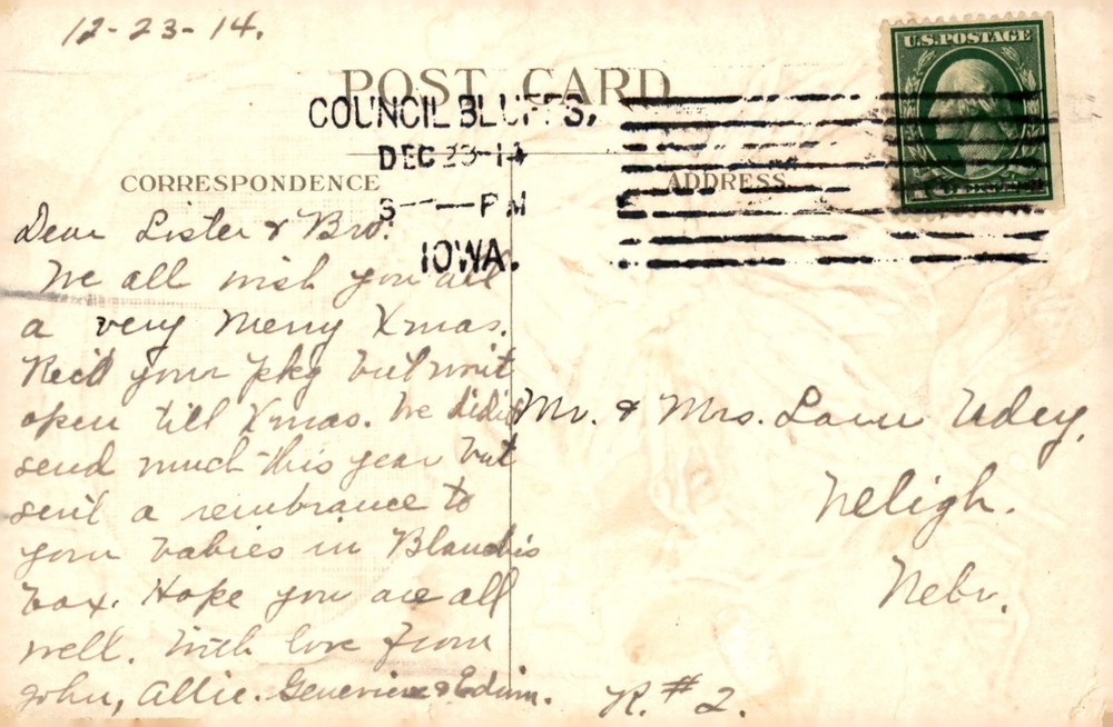 Season's greetings from Council Bluffs, Iowa, dated December 23, 1914. The sender expresses missing the recipients and sends wishes for a merry Christmas. They mention a gift sent to the recipients' babies in a box.