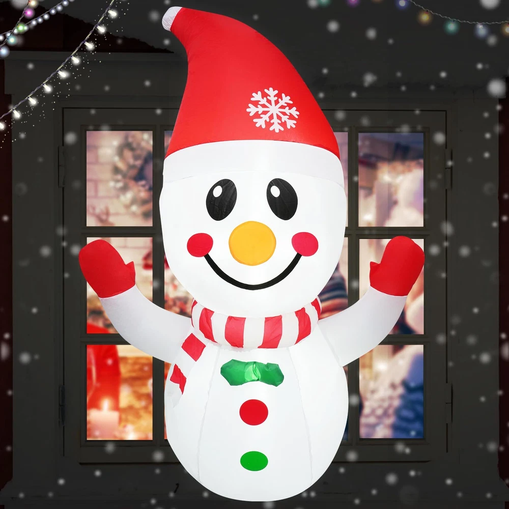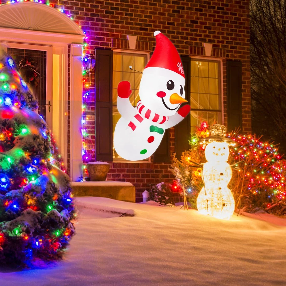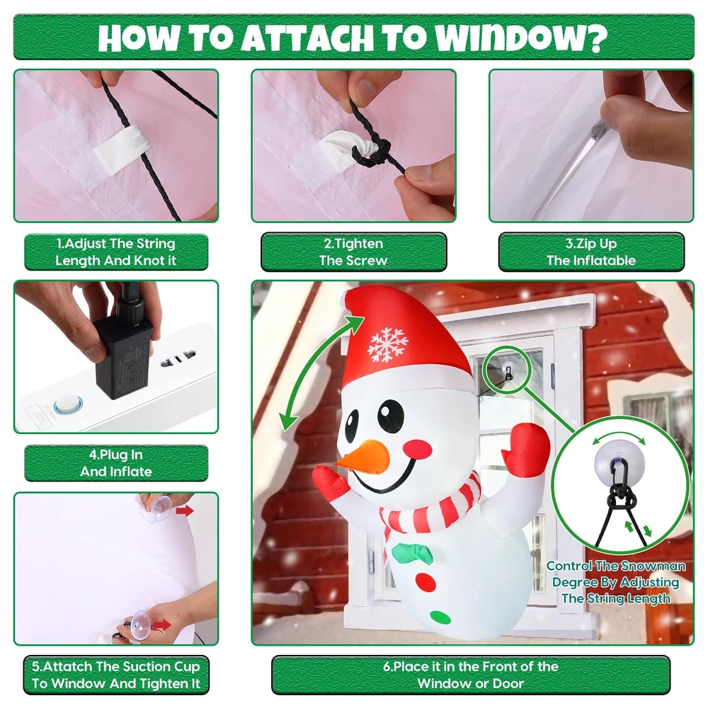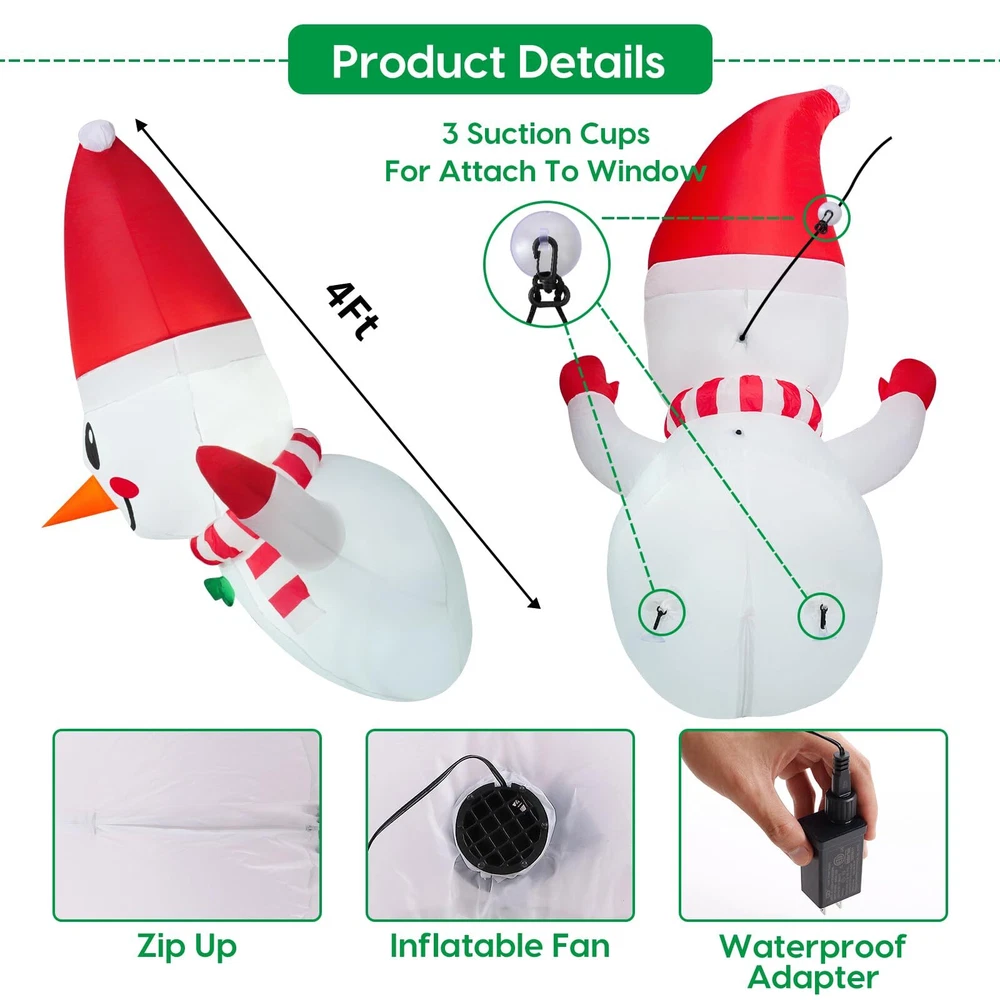 Ideal Christmas Inflatable Outdoor Decorations: This 4-foot Christmas inflatable snowman comes with 3 fixed suckers, 1 fasten rope, 2 buckles, 1 powerful air blower, and a UL-approved adapter. It is lightweight and can be placed anywhere you want for outdoor decoration Durable LED Light & Air Blower: This Xmas inflatables decoration features long-lasting and bright LED lights that will beautifully illuminate your window, yard, garden, and lawn. The powerful air blower ensures 24-hour decoration of your patio, creating a memorable Christmas atmosphere Durable and Weather-Resistant: Made of premium thick polyester, these Christmas inflatable window decoration snowman are waterproof, fade-resistant, and reusable. They are built to withstand outdoor elements, allowing you to display them throughout the Christmas season, regardless of the weather conditions Easy Setup & Quick Deflate: With the included air blower, this Christmas window inflatable can be set up in minutes. Simply plug it in, and watch as it comes to life. Attach it to the window using the suction cups provided, and let it tower over your yard with its adorable presence. It can also be used indoors for added versatility Excellent : We are committed to providing you with the best . If you have any questions about this Christmas Inflatable Snowman Outdoor, please message us through "Sellers". Our service team is dedicated to helping you solve any problems you may encounter