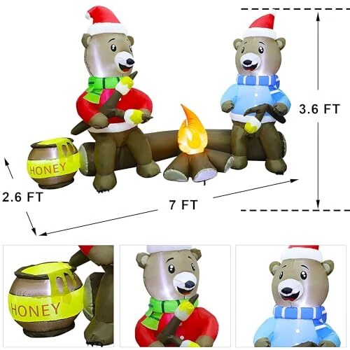 30 Days Return Policy Fast Delivery Trusted seller Christmas Inflatable Decorations, 7FT Blowup Lighted Xmas Inflatable for Yard Front Door Outdoor Indoor Decor Product Description ALL IN ONE SET: Package includes un-inflated item with power adapter and blower*1, 3.3FT tie strings*4, plastic stakes*8, manual*1, and green drawstring bag*1. The inflated length is 7ft. As ONLY the polyester fabric cloth is waterproof, please keep the blower and adapter from rain or water. 7FT GIANT CRHISTMAS INFLATALE: blow up Christmas yard decoration features 2 brown bears wearing red Santa hats and sitting on the log and roasting marshmallows over a campfire, who are spending and celebrating Christmas in their own way. The scene is full of romantic fairy-tale touch. APPEALING NIGHT LIGHT: T are 4 bright built-in white LED lights making the inflatable great vivid and appealing at night, and it would definitely impress your neighbors and passersby. Just leave it lighted for night viewing and accompanying you on a whole Christmas holiday and winter season. STAND WELL & EASY STORAGE: Zip it up firstly, and once plugged in, the built-in fan will help the inflatable in a really short time. Included 8 stakes and 4 tie strings help it better stand on the ground without worrying about being blown away with the wind. It comes with a drawstring bag, with which the inflatable can be easily packed for storage. FASCINATING CHRISTMAS DECOR: giant Christmas inflatable is great attractive standing indoors or outdoors, and is great ideal to be placed at yard, garden, patio, lawns, and other places you like to welcome the coming of winter and bring great Christmas touch to your area. Shipping Returns Payment Shipping Shipping is FREE to all addresses other than APO/PO boxes in the lower 48 states. All our stock ships from US-based warehouses. Shipped via USPS or UPS (depending on location and package weight) Unless stated otherwise, all orders will ship within 24-72 hours of your payment being processed. Check our feedback to see the great reviews of FAST shipping we offer. Returns As our valued customer, we will do our best to make sure the product you receive arrives to you on time and as expected. If you are not satisfied with your purchase, please contact us within 30 days of receiving your order to process a return. Payment We currently accept payment via eBay managed payments only. Once payment is cleared, we will dispatch your shipment within 1-3 business days. Please refer to the "Shipping" tab for more information regarding shipping speed to your destination.