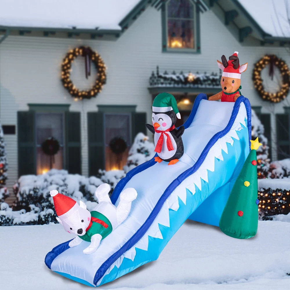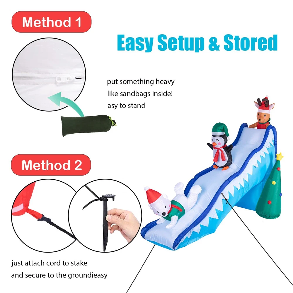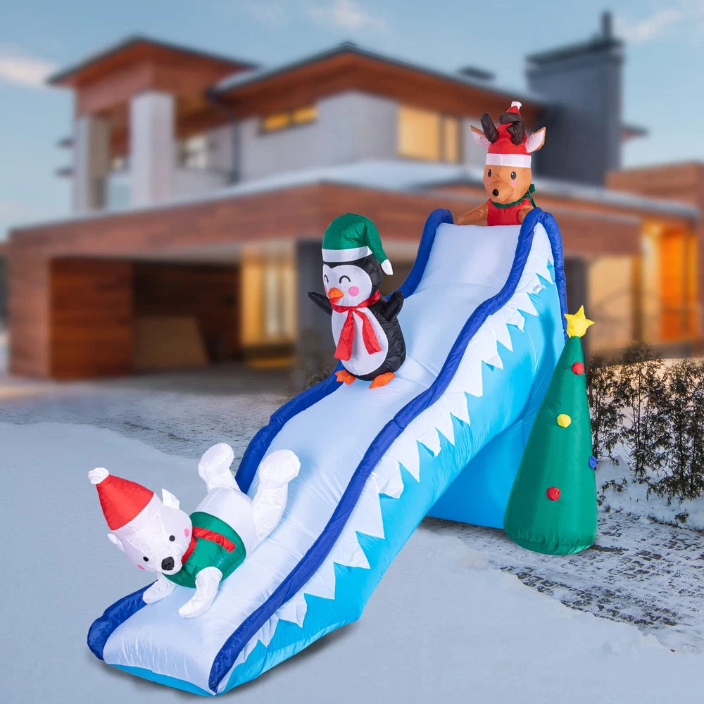 Christmas Decorations Outdoor Inflatable: 9FT Christmas inflatable cute animal trio slide design outdoor inflatable brings joy to your Christmas, it is the best choice as Christmas holiday blow up yard decorations. Installed in the courtyard to enjoy holiday with your family and spreading a happiness atmosphere to your neighborhoods Inflatable With LED Lights: The Christmas inflatable slide comes with a built-in white LED. You can light up your house with this Christmas inflatable and gives your guests an impression, convenient for you to install High-quality Material: Christmas inflatable outdoor decorations is made of waterproof polyester, lightweight, durable and well-sewn, so you don't have to worry about any tears or holes. For better stability, it has built-in sandbags and extra 4 stakes and 4 ropes to help you fix the inflatable yard decoration on the ground firmly and without blowing down Easy to Set Up & Storage: Just plug in, Christmas inflatable slide is easy to self inflating with powerful and quiet blowers. Inflate in a few seconds, then you will get a giant christmas blow up soon. When not use, you can deflate it easily and store for next use without occupying much spaces Winter Christmas Decorations: Christmas inflatable slide is a great Christmas indoor and outdoor decoration that can be used for decor front door, lawn, garden and holiday yard decorations. Best Christmas gifts for children and family. If you have any questions, please feel free to message us through “Contact Sellers”