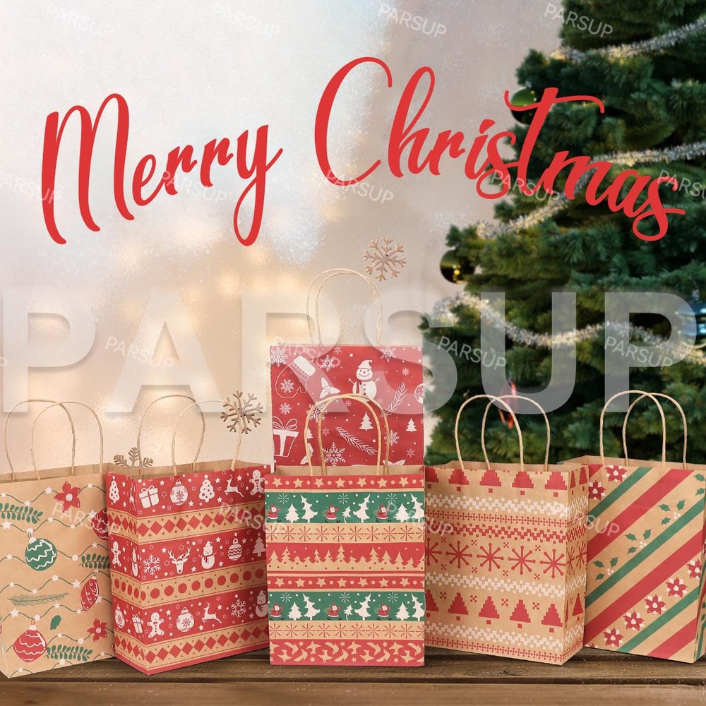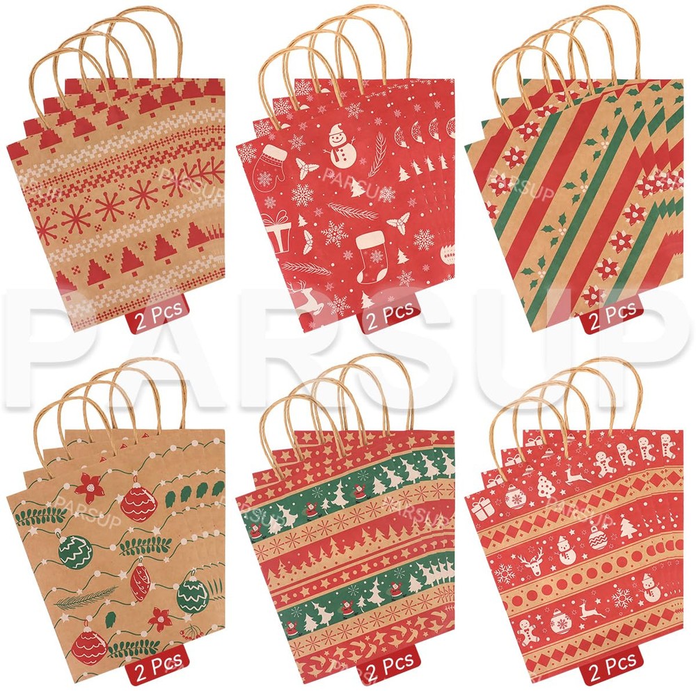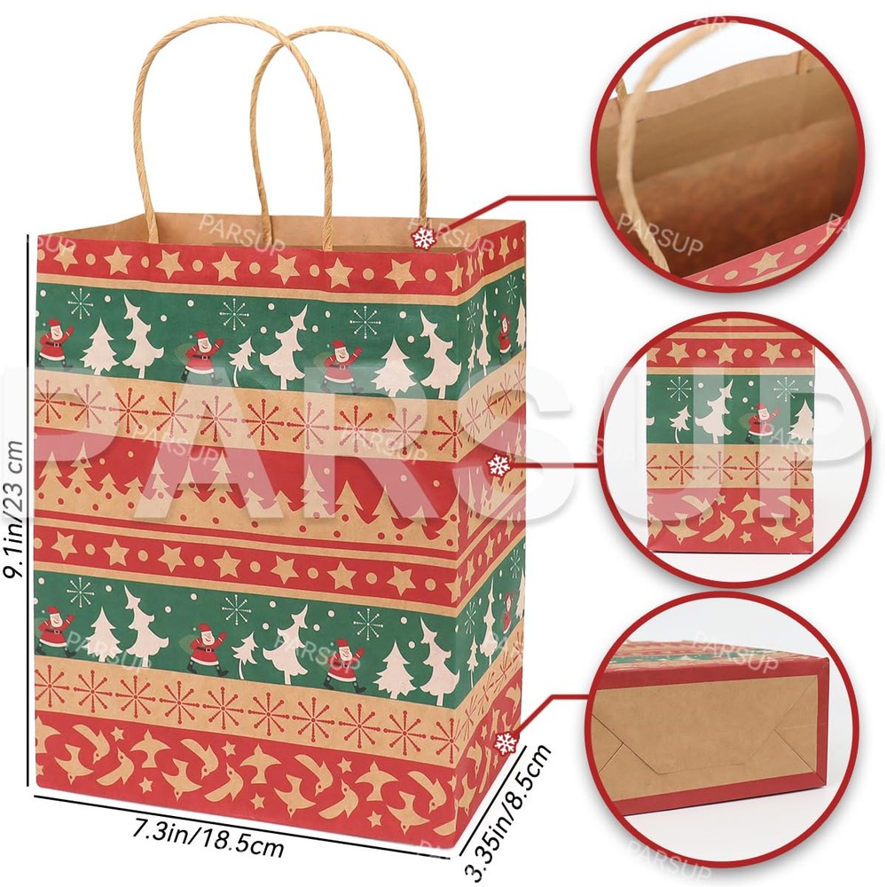 DECENT QUALITY MATERIALCHRISTMAS KRAFT GIFT BAGS - Made of high-quality kraft paper, the handle is fixed with high-quality glue. The Christmas paper bags are sturdy and durable enough, and can be used to carry gifts to reduce the risk of tearing. 100% recyclable, reusable and environmental, you can replace your smelly plastic bags with these super eco-friendly Christmas kraft paper bags. PERFECT SIZE AND PACKAGE CONTENTS - Each Christmas kraft paper gift bag measures 23×18.5×8.5 cm/9.25"×7.3"×3.35", and has a 7-8 cm handle. They are proper in size and can hold items such as Candies, biscuits, chocolates, cards, small toys, etc. Very suitable for Christmas holiday gift packaging. This set includes 24 kraft paper gift bags, 6 different holiday classic designs and each design has 4 pieces. Well packed give gifts to your neighbors, teachers, friends, customers, colleagues, etc. VARIOUS EYE-CATCHING PATTERNS - Christmas party bags, vibrant colors and Christmas themed patterns make them eye-catching, very suitable for gift packaging and candy containers, exquisite enough to make gift bags that little girls and boys like, or beautiful decorations for some Christmas holiday themed parties. IDEAL FOR GIFT WRAPPING DURING CHRISTMAS HOLIDAY - These Christmas party bags are very suitable for most sizes of gift packaging, you can use it for Christmas parties, holiday gifts, Christmas gift packaging, Christmas decorations, wine bottle gift packaging, large gifts, friend gift bags, hospitality bags, they can hold any gift for Christmas or for kids. Light weight, easy to carry, strong structure can withstand heavy loads, not easy to break, durable. GREAT CUSTOMER SERVICE - Our party bags fit for adults, girls and boys. If you have any problems, please contact us freely. We will strive to try our best to make you satisfied.