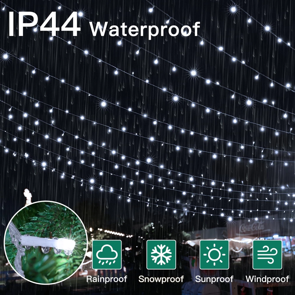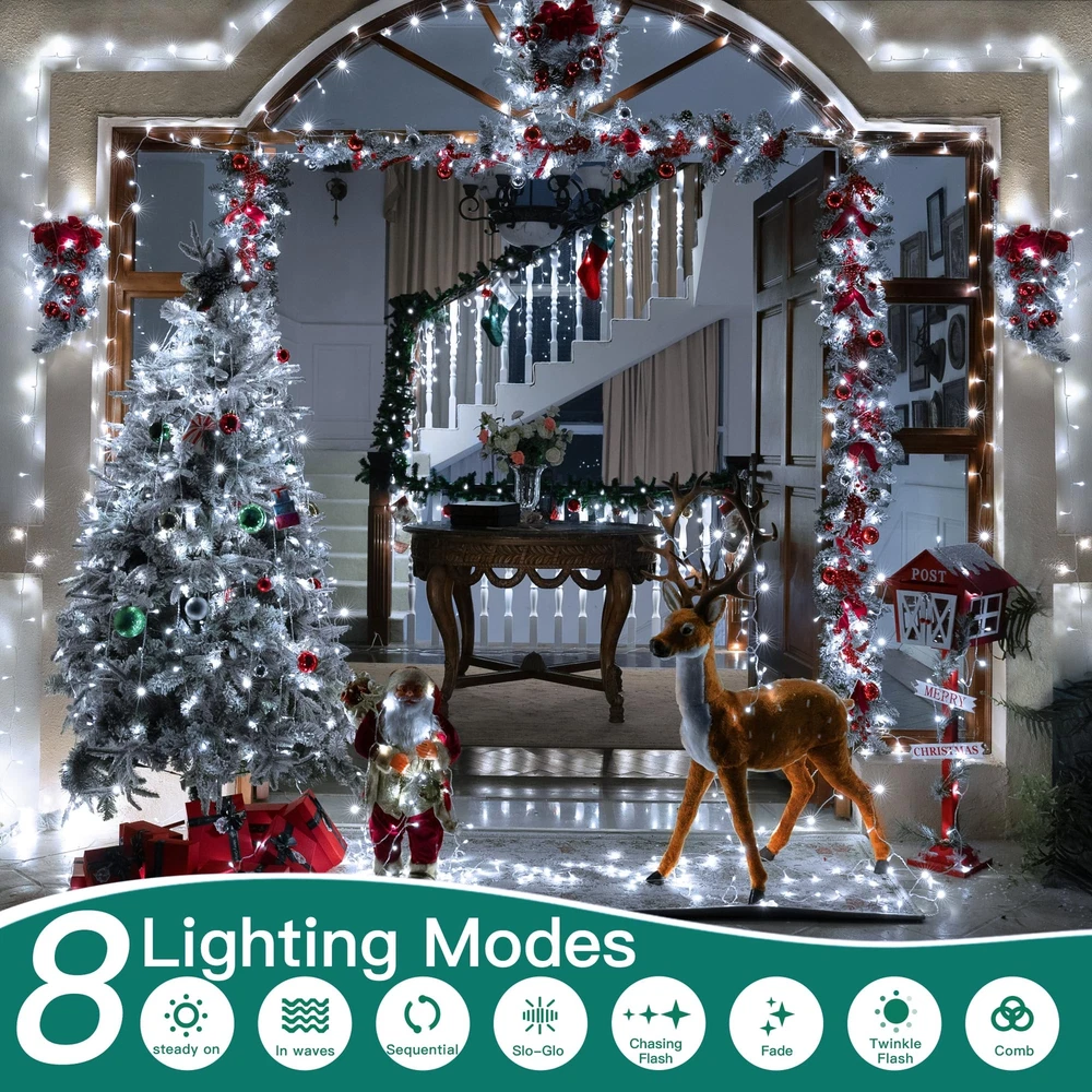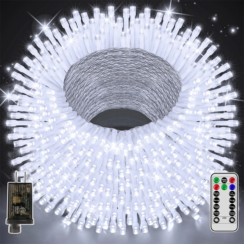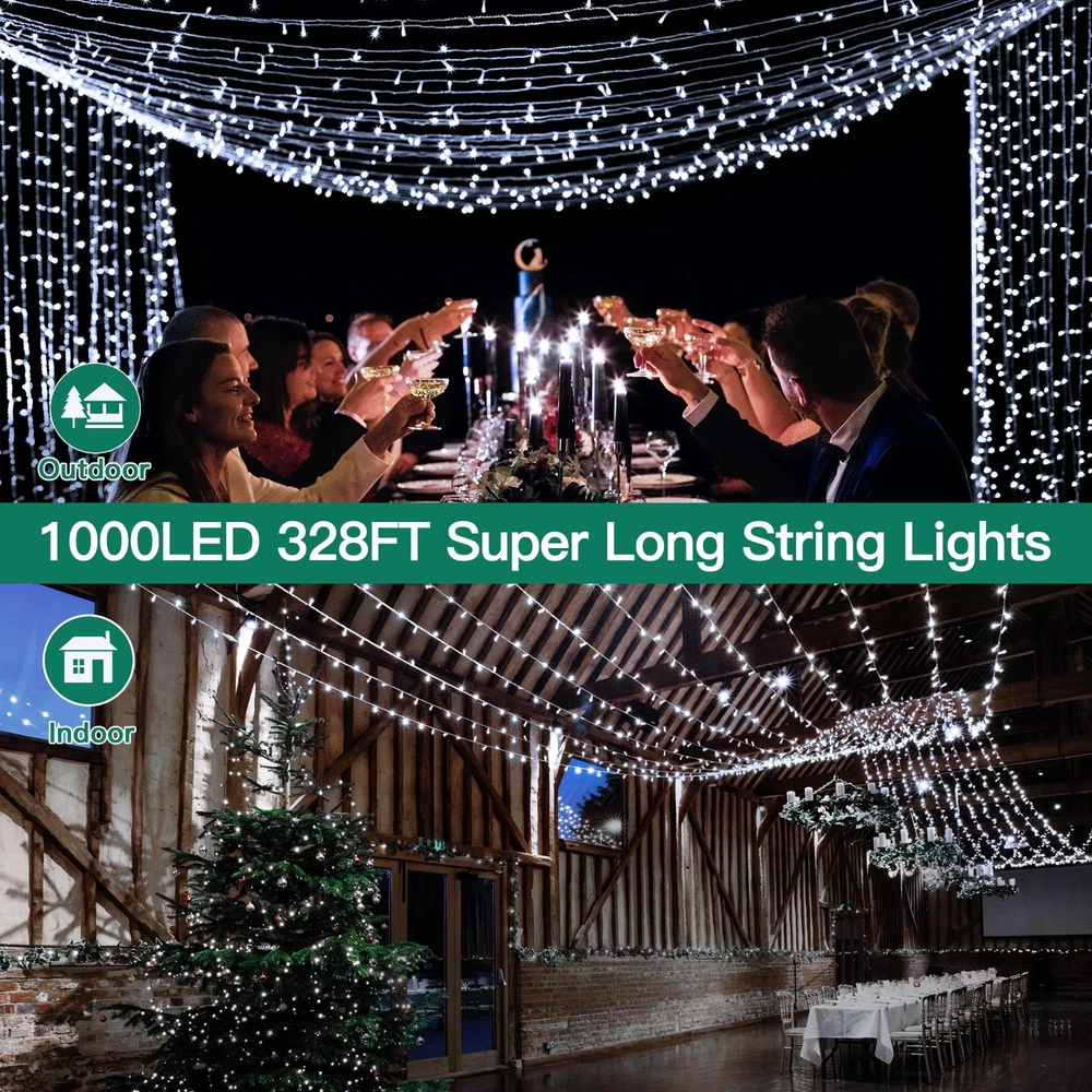 Ultra Long Christmas Lights: 328FT 1000 LED christmas outdoor lights with a 10ft extension cord; enough to decorate every corner of your house, patio, garden, yard, Christmas tree, party, birthday, outside and indoors 8 Modes & 4 Brightness Adjustments: Our Christmas lights have 8 Lighting Modes and 4-level brightness adjustments. Different modes are suitable for various occasions, you can switch them by the remote control or the adapter according to your needs Remote Control & Timer: christmas lights come with a remote control with a time and memory function. You can choose the right timer option that suits your life habits. Lights will auto on/off once set Widely Used: IP44 waterproof design of this Christmas light, 100% protected against solid objects like dust and sand. And fun for your family at Christmas, Thanksgiving, Birthdays, Weddings, and Anniversary Safe & Flexible: Christmas lights have passed the UL588 certification; which enough safe to use. Christmas outdoor light wire made of PVC and copper is durable and flexible, and can be folded and bent arbitrarily, easily builds the shapes you want