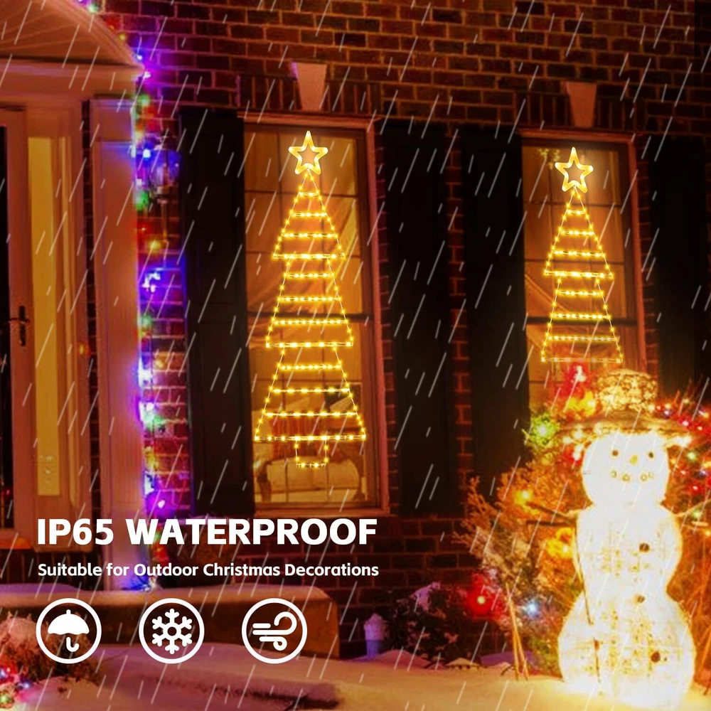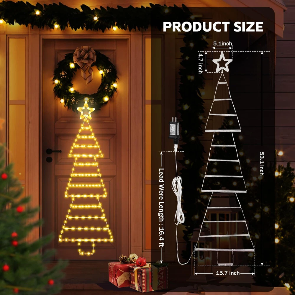 2024 Newest Christmas LED Ladder Lights: Unique Designed Christmas light consists of a 4.4 FT long illuminated rope ladder shaped like a lighted Christmas tree, with a star at the top, funny and cute, it will add a lot of festive atmosphere for your Christmas. Novelty Christmas Decor: Simply hanging the Christmas tree light indoors or outdoors with the included hook, the lights will create a warm and festive atmosphere for your holidays, it's perfect for your home, garden, yard, roof, window, porch, Christmas tree DIY decor. Impressing your neighbors and friends! 8 Lighting Modes & Memory Function: LED Christmas ladder lights come with 8 different lighting modes including steady on, twinkle, flashing and more, you can create the desired Christmas ambiance. The built-in memory chip, which will save your last mode setting. No need to reset mode every time. IP55 Waterproof: The Christmas window decorations lights are powered by 30V low voltage, safe to touch. Constructed with waterproof materials, it's suitable for indoor and outdoor use during the holiday season. (Note: The plug is NOT waterproof, keep it away from water.) Ideal Christmas Gift Choice: 4.4ft height Christmas tree lights with 189 pcs LED, 16.4ft lead wire, perfect for decorating Christmas trees, windows, bedrooms, living rooms, fireplaces, lawns, great gift for Valentine's Day, Christmas, Thanksgiving day and more.