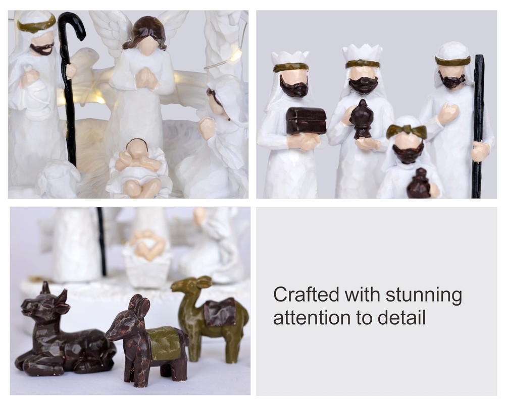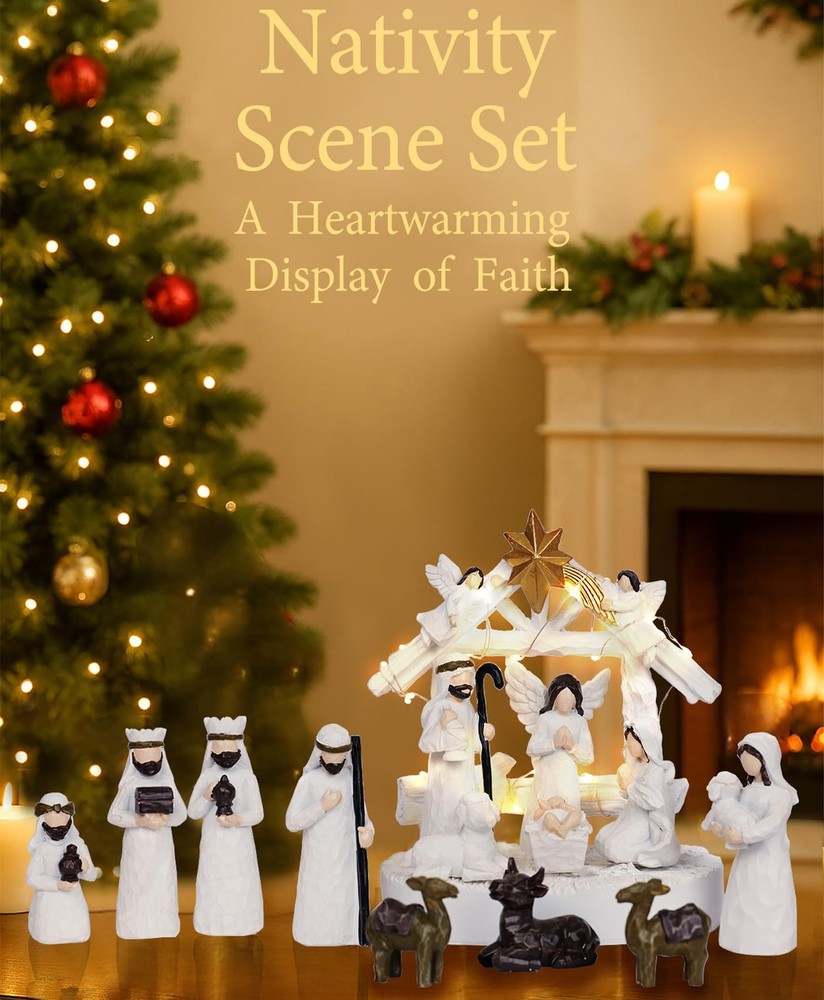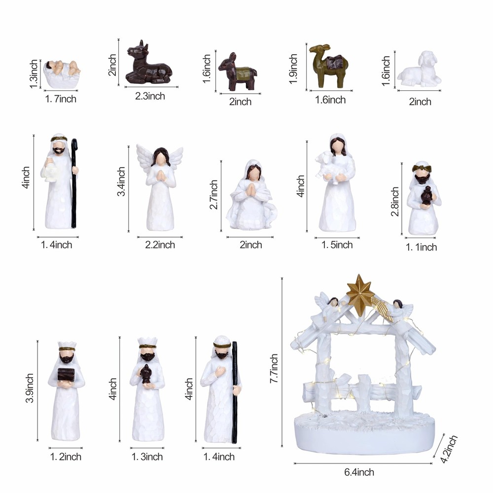 14pcs Christmas Decorations with LED Light – Glows with Sacred Warmth Unlike plain stables, this LED-lit nativity scene decoration adds a gentle glow that fills your space with reverence. Perfect for living rooms, bedrooms, kitchens, churches, or classrooms. Battery-powered — no plugs, no hassle, just light and grace. Deluxe 14-Piece Nativity Scene Set – Full Cast for True Christmas Display This large nativity set captures the essence of the Christmas Nativity story through every meaningful detail. While most nativity scene sets leave out key figures, this complete nativity set with stable includes all 13 essential characters—Baby Jesus, Mary, Joseph, 1 Angel, 3 Wise Men, a Shepherd, a Woman with Lamb, and 4 animals—plus a glowing LED stable centerpiece. The full story. No compromises. No missing pieces. Tabletop Christmas Nativity Set – Sized to Fit Figures range from 1.3" to 4" tall; stable measures 4.2" wide × 6.4" long × 7.7" high. Perfectly sized for mantels, coffee tables, shelves, or entryways, this miniature nativity set is more than a decoration — it’s a symbol of love, hope, and the miracle of Christmas. A finely crafted work of art that brings the Lord’s light into your home. Handcrafted Nativity Figurines – Sculpted with Devotion, Made to Last Crafted from durable solid resin nativity set materials and hand painted nativity set finishes with elegant woodgrain detail, each figure is a testament to artistry. From the manger to the animals to the holy family figurines, every piece is sculpted with care and reverence. From a distance, the nativity scene captivates; up close, the craftsmanship moves you. Christian Holiday Gift – A Spiritual Centerpiece for Family & Friends More than a seasonal decoration, this Christmas nativity set is a heartfelt celebration of the true meaning of Christmas, symbolizing the birth of Jesus. An ideal gift for Christian families, neighbors, church members, and spiritual friends. Securely packed for gifting, long-term use, and annual tradition.
