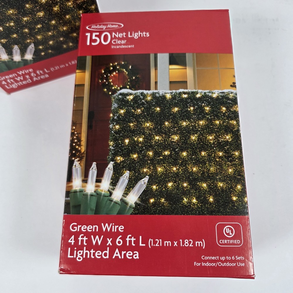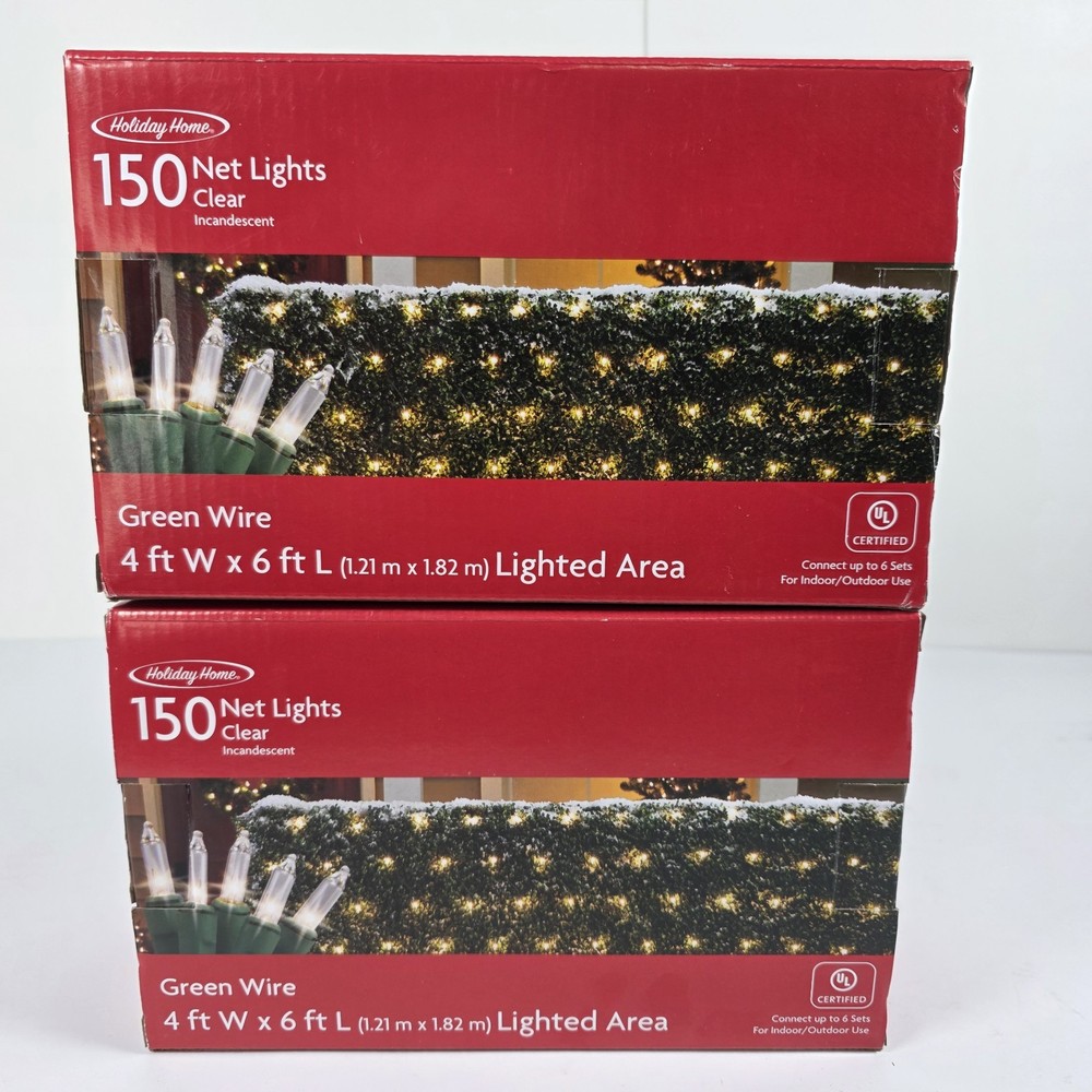 Lot of 2 – Holiday Home 150 Clear Net Lights (Green Wire) Perfect for easy outdoor decorating! These net-style Christmas lights make covering bushes, hedges, railings, and shrubs quick and uniform. Product Details: Brand: Holiday Home Quantity: 2 Boxes (Lot of 2) 150 Clear Incandescent Lights Per Set Net Size: 4 ft x 6 ft (1.21 m x 1.82 m) Wire Color: Green UL Certified Connect up to 6 sets Indoor / Outdoor Use Condition: New in box. Boxes may show light shelf wear from storage. Lights have not been tested due to sealed packaging. These are great for: Bushes & hedges Porch railings Christmas décor Holiday yard displays Quick, even light coverage Net lights save time compared to traditional string lights and provide a clean, professional look. Ships securely packaged.