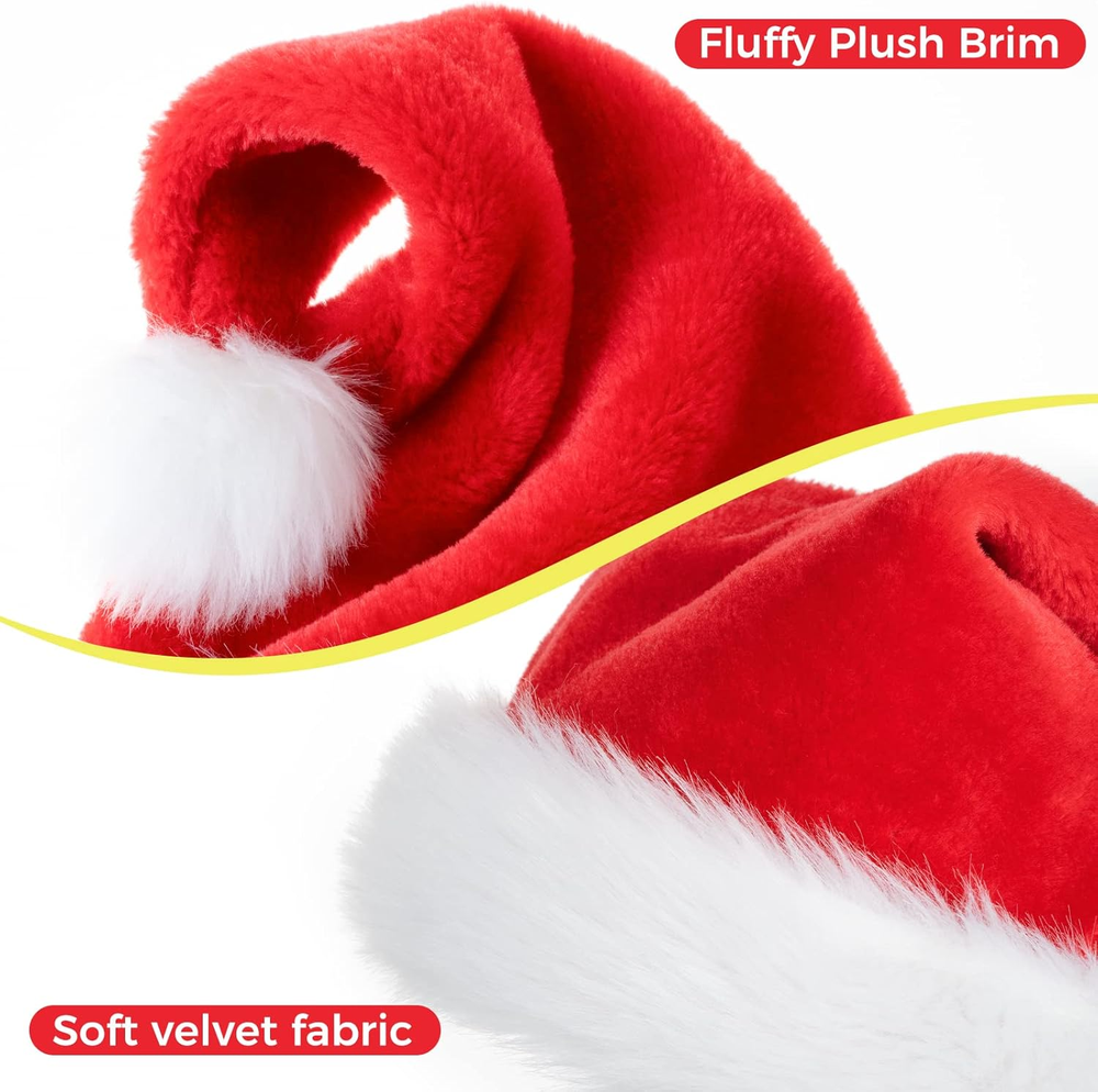 Christmas Hat Santa Hat Adult: Xmas Holiday Hat for Women and Men Polyester Head circumference: 6 3/8-8 3/8 ♥Wonderful Christmas Gifts: Adult santa hats are very suitable for adults, ladies and men, and are great christmas gifts for friends and family. The santa hats adult bring a strong Christmas atmosphere to your christmas day, good quality makes santa hat will be nice for a Christmas photo shoot every year. ♥Ensure Long-term Use: This Christmas hats use the advanced sewing technology, does not shed hair, and is very suitable for long-term wear. Excellent workmanship can even let you use it until next Christmas. ♥Double Thickened & Keep Warm: Extra large santa hat was made with double thickened fabric, inner layer is softer and more comfortable than other ordinary red santa hat, you will feel super warm after wearing it for a even short time. You will feel warm and happy in the New Year. ♥Soft & High Quality: Santa claus hat selected high quality red velvet to made this santa hat, 80% Velvet, 5% Lycra, 15% Plush. Soft comfortable fabric to protect your head and hair without irritation or sweat! We believe that you will fall in love with it because of its material. ♥Best Christmas Party Decorations: Christmas Santa Hat is perfect decoration prop for your party costume to create a pleasant and interesting atmosphere. suitable for Christmas, Halloween, Christmas cosplay, annual ceremony, community activities, stage performance, holiday party and etc. Santa Hat for Adults Santa Hat Women Men Santa Hat Headband Large Velvet Santa Hat Gorrito de Navidad Product Description Santa Hats Are Really Cute And Quirky For Family Christmas Christmas is one of the most grand festivals of the year How can a high quality ceremonial Christmas hat be missed! ! Wear santa hat extra large and enjoy a happy time with your family. Velvet santa hat is also the best partner to take pictures and remember the happy Christmas. Soft &Comfort Liner This Christmas Festival Hats made of high-quality plush, red Velvet fabric and double comfortable linerred fuzz, very warm, suitable for any mild or sensitive skin Super Plush The long velvet quality material is the same as the capball. It can't effectively protect the warmth of the mostimportant head after wearing The smooth long fluff can modify your face and look softer and warmer Christmas atmosphere Or just like Santa Claus . M Soft but Strong Pompom The pompom of this Christmas Santa hats for unisex adults is made of soft and high-quality fluffy so pure white and beautiful ,unlike a short-haired flat Christmas hat but more cute and warm feeling on the moving Every unforgettable moment of Christmas 3.86 inches x 6.06 inches x 2.95 inches. Weight: 2.46 oz Item model number -001 Color 1pack Item Weight 2.46 ounces Manufacturer recommended age 12 months - 6 years Department Unisex Package Dimensions 6.06 x 3.86 x 2.95 inches