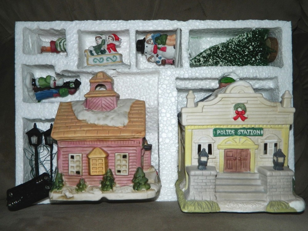 Estate Fresh! Beautiful & Complete in Box 9 Piece Christmas Town Scene with Actual Lighted Hookups made by A Christmas Shoppe This set comes with: 2 Buildings 4 People 2 Light Posts 1 Tree These are made of Porcelain... This set is complete in box! The only reason I think these may have been displayed is the marks showing on the bottom as shown in the pictures... if those weren't there, I'd say they were brand new.