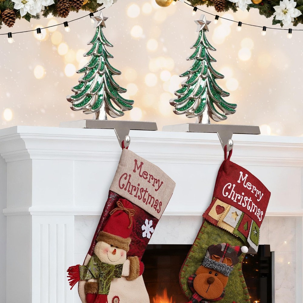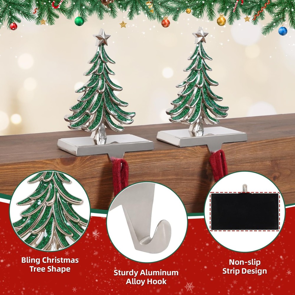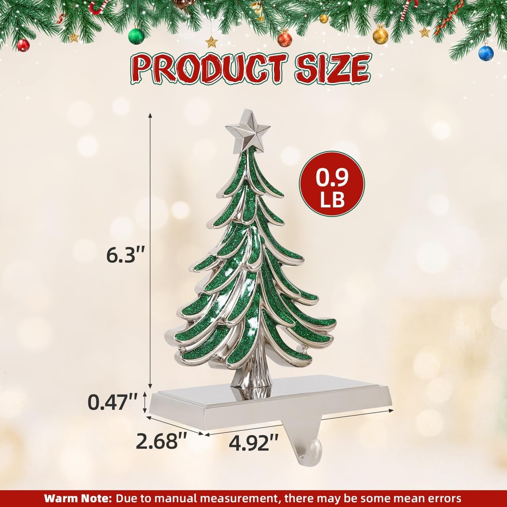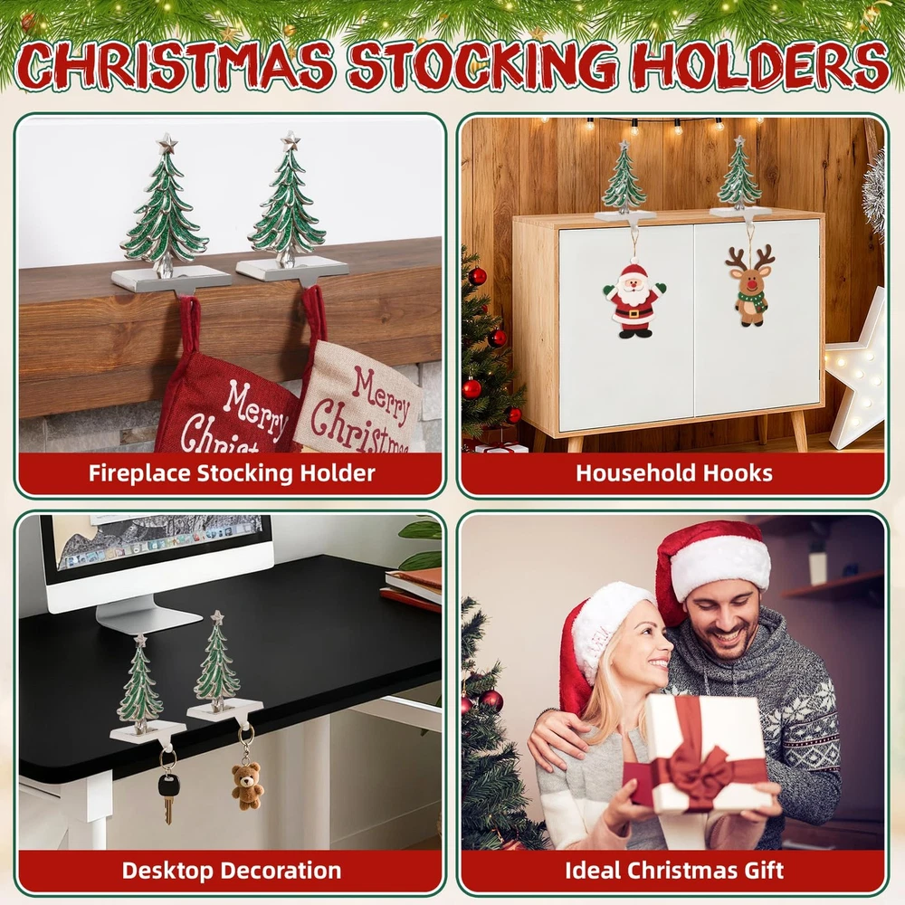 This Christmas, elevate your holiday decor with our exquisite collection of hand-painted fireplace stocking holders! More than just functional hooks, they are miniature pieces of art designed to capture the of the season. Whether you're crafting a cozy scene around the fireplace or adding festive touches to your shelves, our unique designs—the Christmas Tree, Reindeer, Snowflake, Snowman—will become the heartwarming centerpiece of your celebrations, creating memories that last a . Features: 1. Stunning handmade artistry that elevates festive decor — charming designs (Christmas Tree, Reindeer, Snowflake, Snowman) feature exquisite hand-painted detailing to enhance your mantle, shelves, or entryway during the holidays. 2. Solid metal construction with a silver base — Durable, long-lasting stocking holders that stand up to full stockings year after year, delivering reliable through many seasons. 3. Generous weight capacity of 3.5 lb — Built to securely hold stockings, gifts, or lightweight decor without tipping, so Santa’s gifts stay put. 4. Stable, non-slip bottom for protection — Rubberized anti-slip pads safeguard mantels and surfaces while preventing unwanted movement. 5. Versatile holiday décor and gift-ready — Christmas icons that fit a variety of home styles; the handmade finish makes them thoughtful gifts for family and friends. 6. No Installation Required — Simply place on your fireplace mantel, shelf, desktop, or windows without tools or assembly required. 7. Sleek Silver Shine & Easy Care — The stocking hooks for mantle is made of high-quality metal and silver hooks. The sturdy metal hooks will not bend under . There is no need to clean and maintain the stocking rack frequently, just wipe it with a dry cloth to restore the mirror-like luster. It still looks brand new to welcome Santa Claus when he comes. 【Exquisite Christmas Stocking Hangers】 Bring the feeling of Christmas to life with our unique collection of stocking holders (Tree, Reindeer, Snowflake, Snowman). Each stocking hook feature exquisite hand-painted detailing to enhance your mantle, shelves, or entryway during the holidays, elevates festive decor. 【Sturdy & Heavy-Duty Construction】Crafted from high-quality metal, these weighted stocking holders are built to last for many Christmas seasons to come. They are rust-resistant and sturdy enough to securely hold your stockings even when filled with goodies, ensuring your festive display remains perfect throughout the holidays. 【Non-Slip Base & 3.5lbs Strong Hold】These mantle hooks for stockings features a weighted base with a fabric felt anti-slip pad, prevent scratching or sliding on your mantel, shelves, or . With a reliable 3.5lbs weight capacity, you can confidently hang stockings with gifts without worrying about tipping over. 【Versatile to Use】Perfectly designed for mantels fireplace christmas decorations, but also ideal for decorating bookshelves, staircases, counter, window, console tables, or windowsills. These mantle stocking hangers are not just for stockings; use them to hang Christmas cards, lightweight garlands, or small holiday wreaths for a cohesive look. 【Perfect Holiday Gift】Beautifully designed and practical, these stocking hangers for mantel make a thoughtful gift for family and friends. Their timeless appeal and functional design bring warmth and joy to any Christmas decor, creating cherished memories season after season.