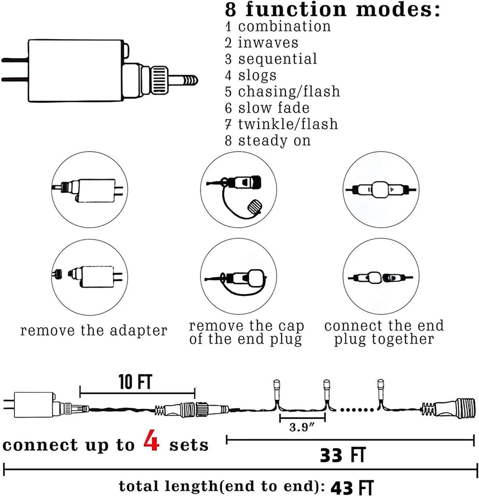 Store New Arrivals Add to Favorite View Feedback Contact Fast deliveries to the customer's home Quality customer service John Make the customers happy! Christmas String Lights, 100 LED 33 FT Connectable Fairy Lights with 8 Modes, Waterproof Christmas Decorations for Indoor Outdoor Holiday Party Home Tree Decor (Warm White) Description Light Specifications: With 100 LED string lights, each Christmas string lights is 43 ft long in total, wire with LED bulbs is 33 ft, lead wire is 10 ft, spacing between bulb is 3.9 inch. 29V low voltage, will keep at a low temperature state after lighting up for hours, ensure the safety. 8 Lighting Modes Christmas Lights: 8 Modes (combination, in wave, sequential, slo-glo, chasing/flash, slow fade, twinkle/flash, and steady on). You could use different modes of the 100 LED lights according to different occasions, light up a unique outdoor & indoor illuminated backdrop for your vivid and funny decorations. Connectable Christmas Lights: These Christmas string lights string has male and female safe plug, easy end-to-end connection, you can connect up to 4 sets together to light up a wider range. Easy to use, just hang the lights anywhere you want. Waterproof Outdoor Christmas Lights: IP44 grade waterproof, can withstand all kinds of weather! You can easily hang the Christmas string lights anywhere you like, suitable for both outdoor & indoor decorations. The string lights is bright, perfect to create a romantic Christmas atmosphere. Widely Application: This soft green wire string can be wound on Christmas trees, signs, plants and furniture. Prefect to decorate bedroom, terrace, indoor, outdoor, yard, garden, cafe, wedding, birthday, Christmas, Thanksgiving, Halloween, Valentine's Day. Product Description Decorate Your Life and Home with Fairy String Lights Safe To Touch 29V low-voltage transformers and UL certificated plug to ensure the safety of Christmas string lights. The LED string lights will not overheat after a long time of use and safe to touch. Widely Application These twinkle string lights can be used in different places to increase the warm atmosphere and relax mood. Perfect decoration for party, camping, wedding, Christmas, holiday, patio, yard, garden, etc. Specification: Lights Color: Warm White Lights Quality: 100 LED Total Length: 43 ft Lights Length: 33 ft Lead Length: 10 ft Bulb Spacing: 3.9 inch Waterproof Level: IP44 Power Supply: Adapter Powered 8 Working Modes This twinkle lights have 8 modes (combination, slow glow, wave, sequential, chasing/flash, slow fade, twinkle/flash, and steady on) to satisfy your diverse decorative effect. End-to-End Connectable 33 ft length LED string lights with safe plug, could be extended to a maximum of 4 light chains, which can meet your application needs in various scenarios. Waterproof Outdoor Lights The Christmas 100 LED lights is IP44 waterproof level, they can work well outside in rainy days, but please keep the plug away from water. Item model number ZF-100-2/SB Light Source Type LED Style Modern Number of Items 1 Power Source Corded Electric Number of Light Sources 100 Control Method App Theme Christmas Style Number ZF-100-2/SB Department mens Controller Type Button Control Occasion Type Christmas Seasons Christmas Additional Features Waterproof Package Dimensions 6.46 x 3.7 x 2.76 inches; 10.41 ounces Indoor/Outdoor Usage Outdoor Material Type Plastic Light Color Multicolor Water Resistance Level Waterproof Item Weight 0.65 Pounds Occasion Christmas Special Feature Waterproof Color Warm White Indoor Outdoor Usage Outdoor Voltage 29 Volts Included Components light Style Name Modern ABOUT US We offer the best prices around on high quality products. Our E-store includes media such as books, movies, music and games while offering electronics, toys, sporting apparel, clothing, tools, general home, garden items and more. SHIPPING We are always working hard to ensure your package arrives as soon as possible. Please understand that some factors like weather, high postal traffic, and the performance of shipping companies are outside of our control. We offer free shipping to the lower 48 states and ship within 2 business days of payment, usually sooner. We do not accept P.O. Boxes. Please provide a physical address. For shipping outside of the continental USA, we only use eBay's Global Shipping Program. The item is shipped to KY and then sent to the rest of the world. International customers are responsible for all duties and taxes. Continue to 'check out' to calculate costs for shipping the item to your country. Messages regarding eBay's Global Shipping Program MUST be directed at eBay EXCLUSIVELY. RETURNS We offer a 30-Day Return Policy on items in which you are not completely satisfied with. You have the option of a full-refund or an exchange of the item. No returns are available on items shipped outside of the USA PAYMENT We accept PayPal. CONTACT US This page content is yet to come Please ad us to your favorite seller and visit again later Thank You CUSTOMER SATISFACTION We try our very best to make sure every customer is completely satisfied. If there's a problem, message us! We're happy to help. WE ACCEPT