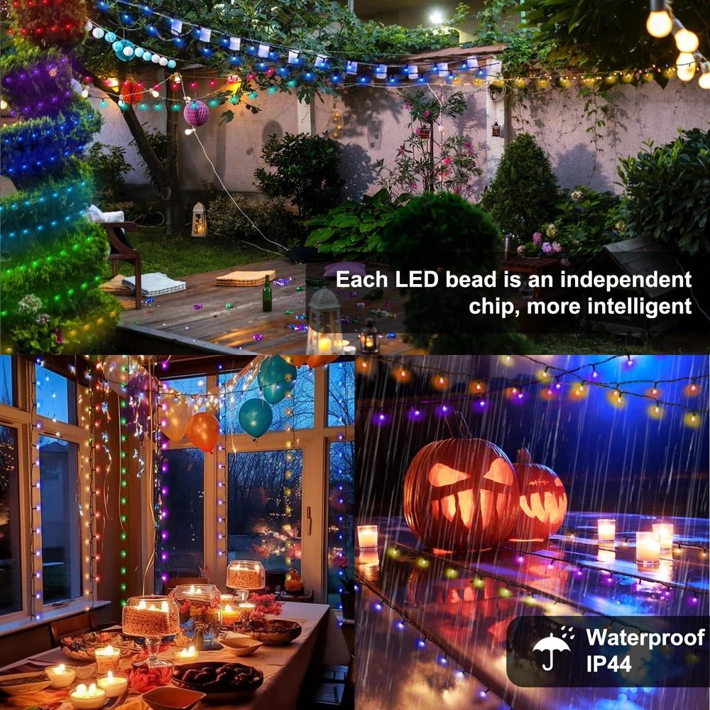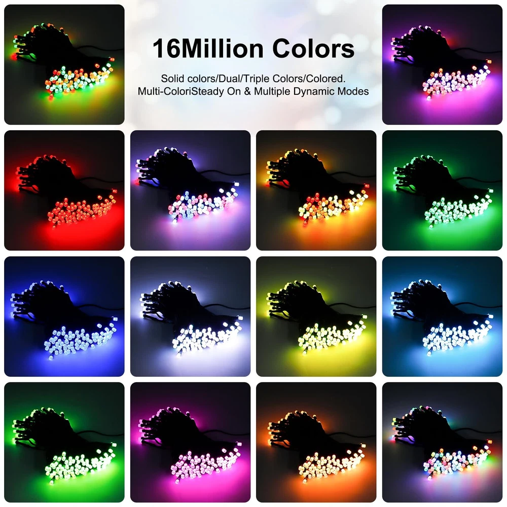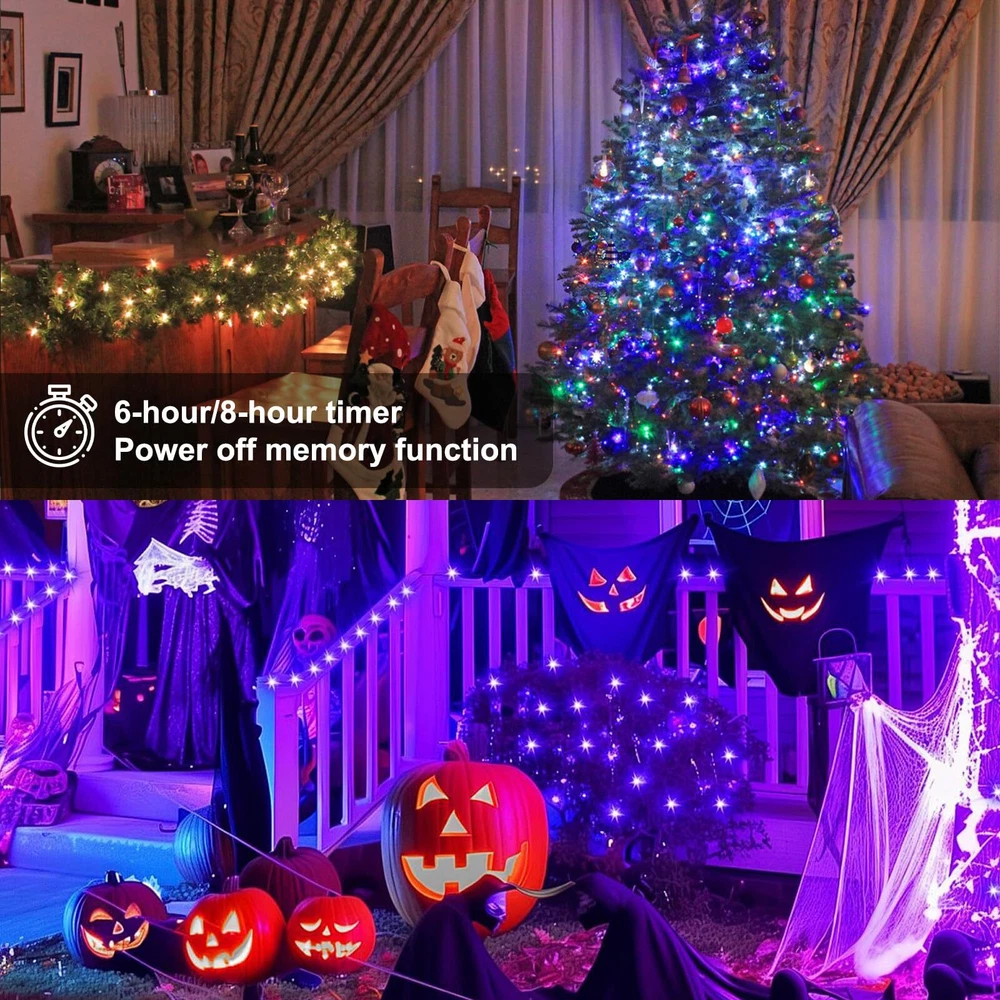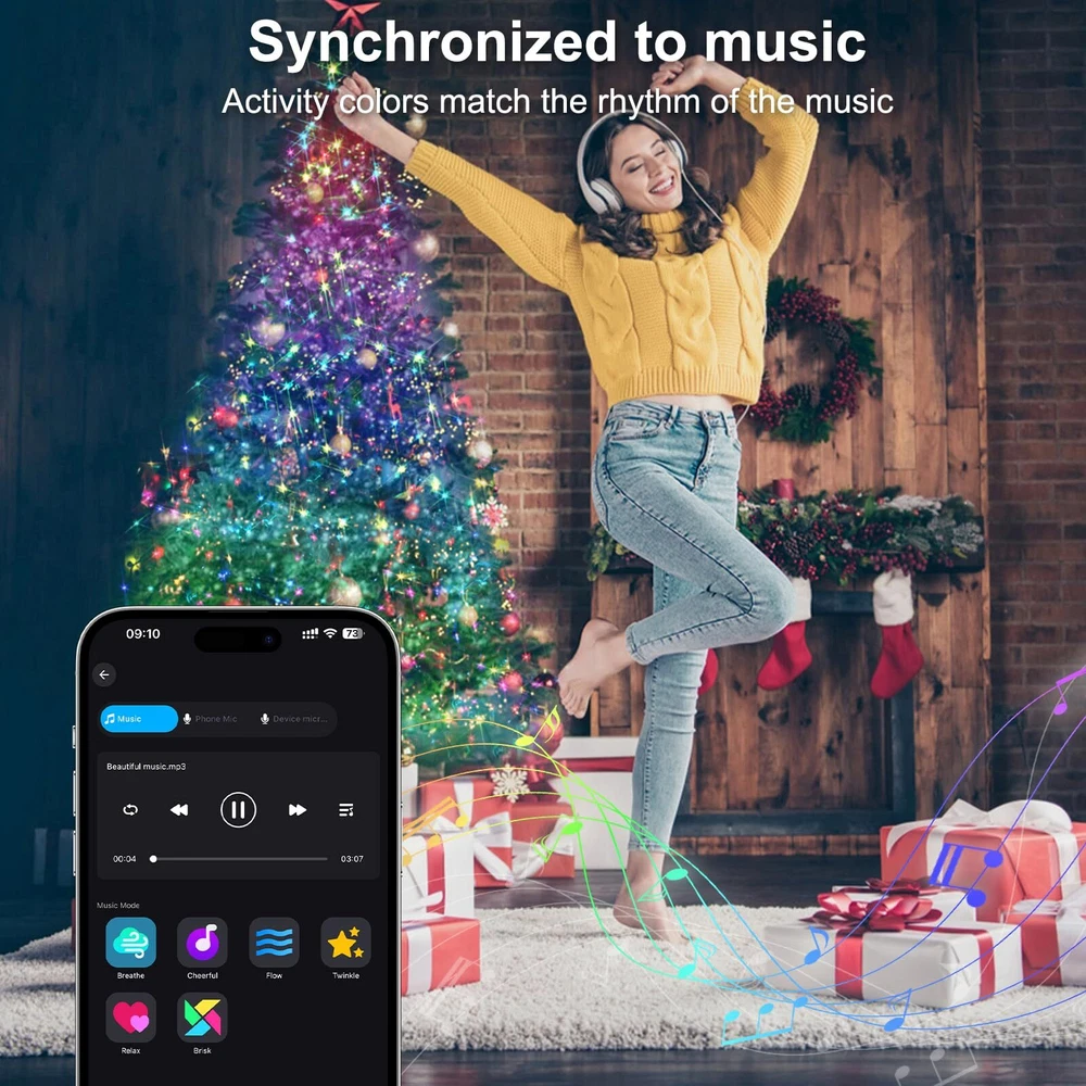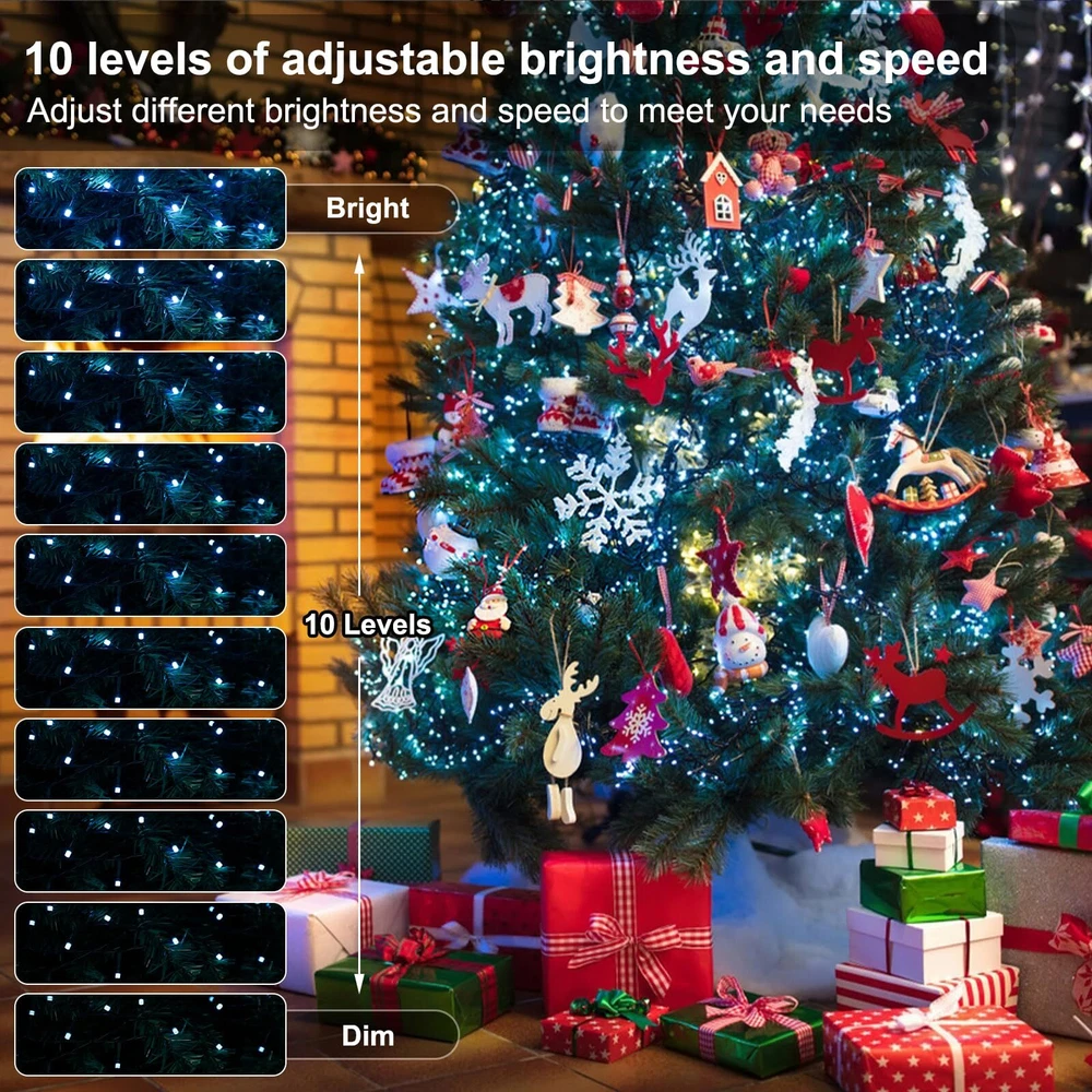 Rich Color Options: Our RGB christmas lights offer a wide range of color choices, including red, green, white, blue, orange, purple, and more. With over 16 million color options, you can easily create the perfect ambiance for Christmas, Halloween, Thanksgiving, Valentine's Day, or any special occasion. Customizable Lighting Control: Our christmas tree lights come with a smartphone app that allows you to adjust brightness, color, dimness, and even turn them on/off remotely. You have full control over creating the ideal lighting setting for your space. Music Sync Technology: Experience an immersive environment with our intelligent LED Christmas fairy lights. These lights can detect and match the rhythm of your music, creating a stunning light show that synchronizes with the beats. Watch as the colors and brightness change in sync with your favorite tunes, adding a mesmerizing and party-like atmosphere. Adjustable Brightness and Speed: Personalize your lighting experience with our 10-level brightness and speed settings. Whether you prefer a soft glow or a vibrant display, you can easily adjust the lights to suit your preferences. Timer and Memory Functions: Set the timer for 6 or 8 hours, allowing the lights to automatically turn off after a specific duration. Even in case of a power outage, our lights have a memory function that preserves your last settings, ensuring convenience and continuity.