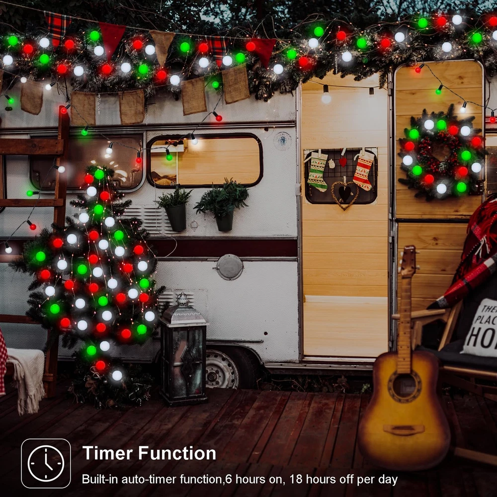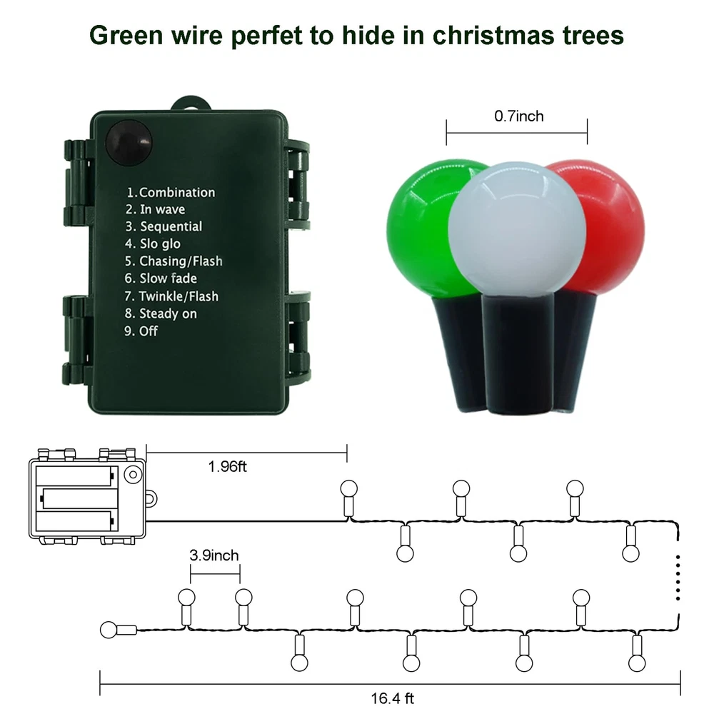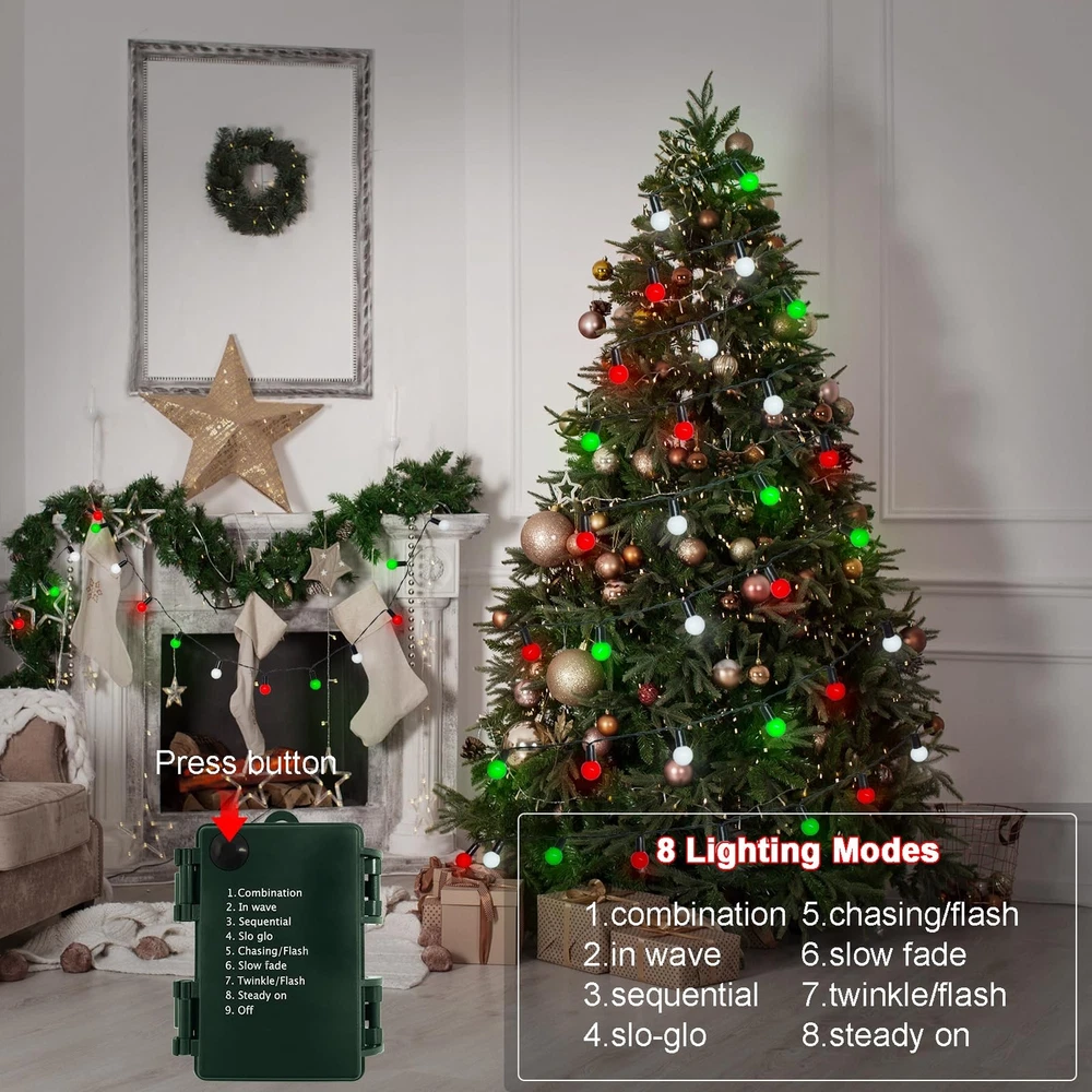 Christmas String Lights Battery Powered 16.4Ft 50LED Red Green White Globe String Lights with Timer 8 Modes Waterproof Fairy String Lights for Indoor Xmas Tree Holiday Party Outdoor Decor Sepcifications Wire material:PVC rubber LED Quantity: 50 Power Source:Battery Powered Cable Color: Green Light Color : Red Green White Size: 16.4ft Lead wire: 60CM (Approx.1.96 ft) Waterproof: IP54 8 Lighting Modes: Combination In wave Sequential Slo-glo Chasing/Flash Slow fade Twinkle/Flash Steady on Package included: 1 x Red Green White String Lights Globe String Lights: The total length of the green wire string light is 16.4ft, lead wire: 23.6 inch,two bulbs distance: 3.9 inch. Green wire design is perfet hidden inside the Christmas tree Red Green White String Lights:The fairy string lights feature 50 Globe ‎red white green LED lights, which create a joyful festival atmosphere for Christmas Auto Timer Function:The LED string light will auto set a timer for 6 hours on and 18 hours off each day when you light up the string fairy lights,which could save energy costs and keep a long battery life Battery Power String Lights: The LED string light with battery box is portable to place anywhere you want, no need to find the socket. Powered by 3 x AA batteries(Not Included), 3V lower volt output, safe and free to touch for child and pet 8 Lighting Modes: Press the button of the battery box to choose the different mode to suit the different occasion Widely Application: Christmas color string lights is perfect for wrapping Christmas trees, wreaths, patios, hedges, fences, pillars. Good choice for increasing your holiday atmosphere for Christmas