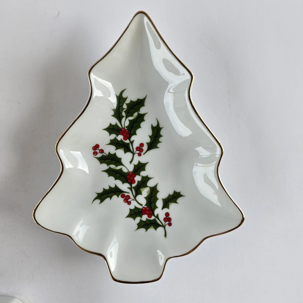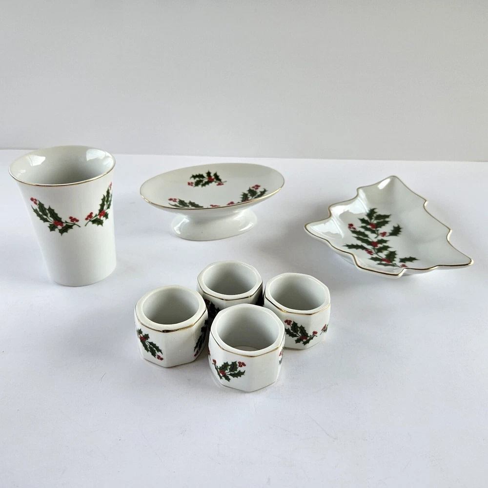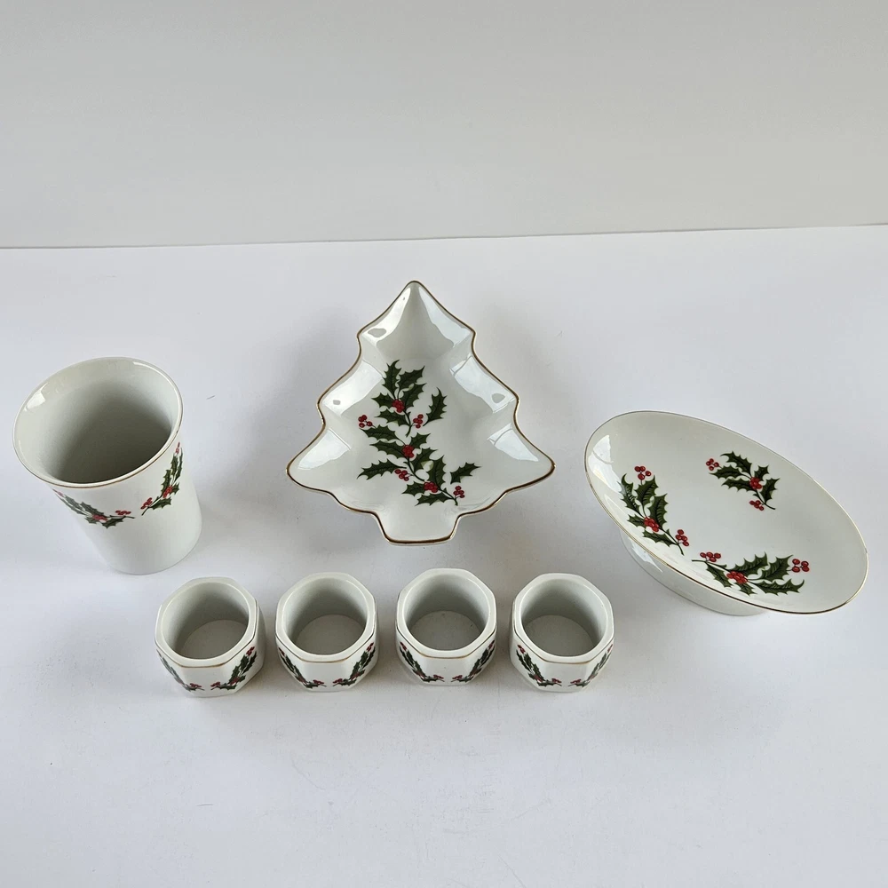 Thank you for viewing this listing. Elevate your festive table setting with this exquisite Holly Berry 7 Piece Lot, crafted from fine porcelain and originating from Japan. Each piece showcases a classic white color accented with delicate gold rims, bringing a touch of elegance to your Christmas celebrations. The collection includes a Christmas tree shaped candy/jewelry dish, soap dish, tumbler, and four napkin ring holders; designed to create a cohesive and charming display. The napkin rings come in their original box. These porcelain items are ideal for those who appreciate timeless holiday decor with a sophisticated flair. Please view the condition description and photos for additional details and, as always, feel free to reach out with questions.