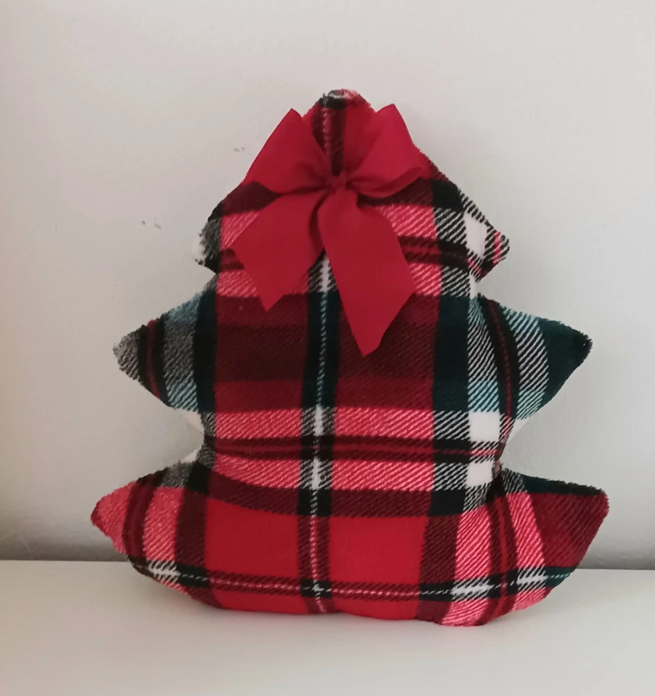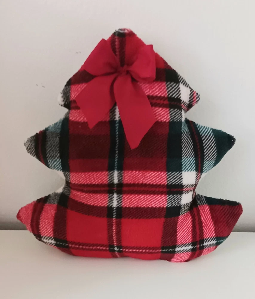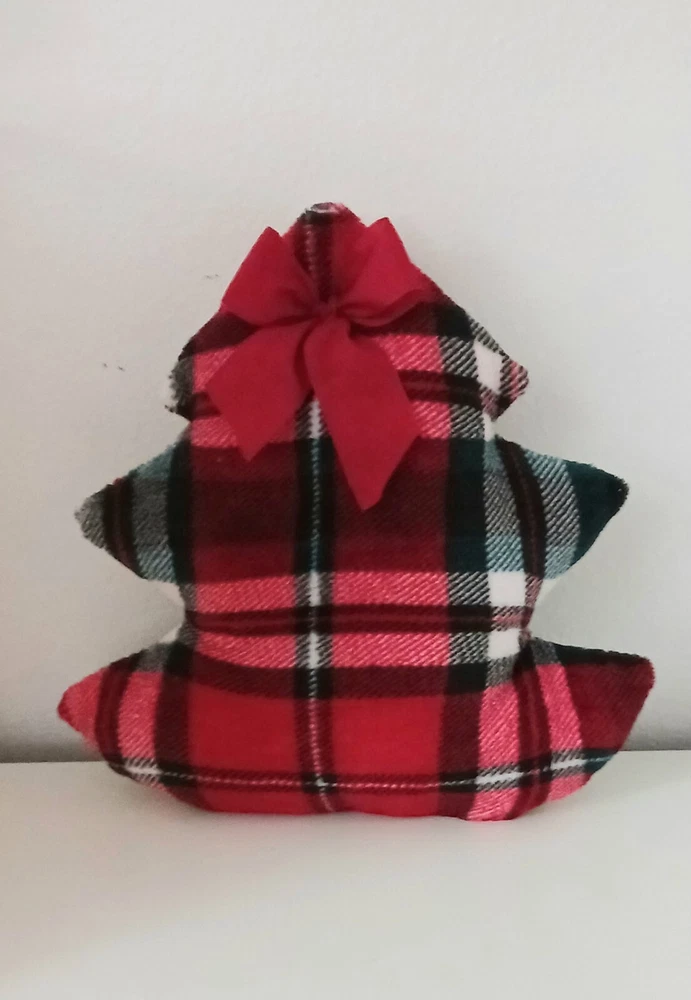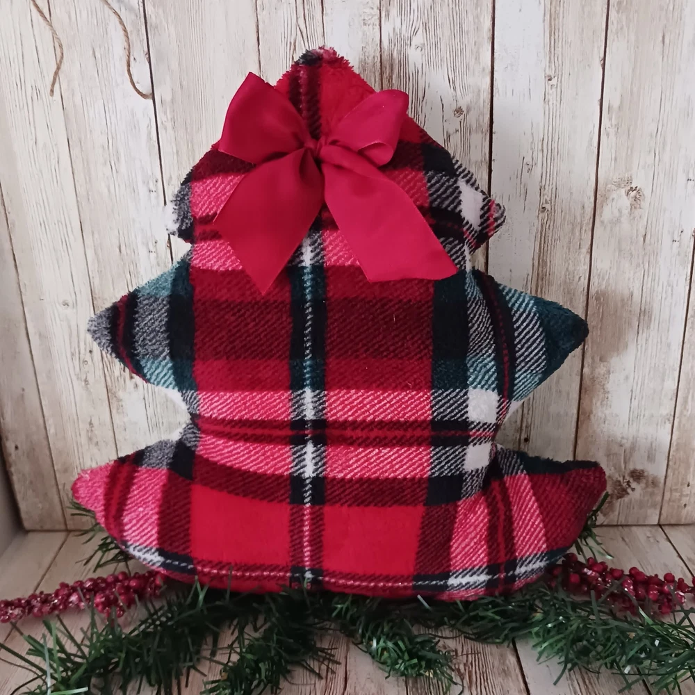 Christmas Decor- Christmas tree accent pillow. Red, white & green plaid plush fleece fabric. Accented with brushed satin ribbon bow. Backed with natural canvas fabric. Start a collection to use as furniture accent, basket filler, mantel, or shelf arrangement. Size: about :12". All are handmade, so sizes vary slightly. Items are ready to ship via USPS