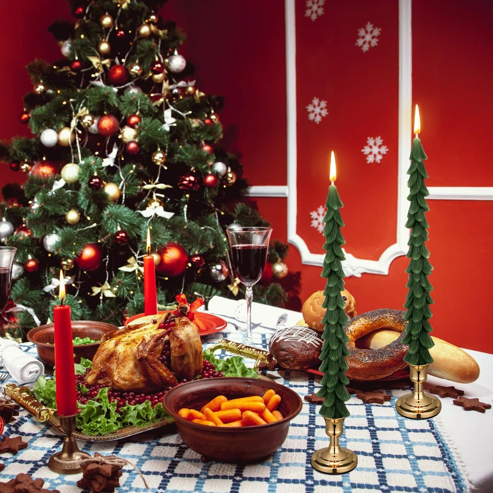 Features: These Christmas tree candles wax with metal candle stick holders make a wonderful and heartfelt gift for your friends, family, or neighbors. They are especially fitting as a holiday present, spreading warmth and festivity The vibrant green and golden color of the green taper candles and candlesticks holders immediately light up your room, adding Christmas cheer to your home. They create a warm, inviting atmosphere that is irresistible, making them an ideal for holiday celebrations. Specifications: Material: wax and metal Color: green and golden Size: Candle: about 9.84 inches/ 25 cm high Holder: about 2.5 x 2.5 x 3 inches (L x W x H) and 0.75 inch deep for candle hole Package includes: 2 x Christmas tree candles 2 x Candle holders Notes: Manual measurement, please allow slight errors on size. The color may exist a slight difference due to different screen displays. Complete Package Includes: the package includes 2 pieces of unscented wax candles in about 9.84 inches/ 25 cm high and 2 pieces of gold candlesticks, approximately 2.5 x 2.5 x 3 inches (L x W x H) and 0.75 inch deep for the candle hole; This set provides what you need for a jubilant Christmas decoration, adding to your convenience, please kindly note that the candle needs to be first poured on the candlestick to secure the candle Notice for Use: due to the special shape of the candle, you need to drip wax oil on the edge of the candle holder to ensure that the candle does not shake; This metal candle holder is suitable for all rod candles, and you can keep it after you have applied your Christmas tree candles Quality and Reliable: our table candles are made of quality wax, crafted delicately for a realistic Christmas tree appearance; The taper candle holders are crafted from robust and durable metal, ensuring they can firmly and safely hold the candles, both the candles and holders are designed to serve you for a long time Suitable for Various Occasions: our Christmas candles with Christmas candle holders not just add festival cheer to your home, but they are versatile enough to be served on various occasions; They can be acted for holiday parties, family gatherings, or even intimate dinners, enhancing the festive feeling Safe Package: we use protective packaging and boxes to ensure that the candle is not damaged to the maximum extent; However, due to the material of the candle, damage is inevitable; If it breaks, please return it in time and we will reship it; We wish you a Merry Christmas