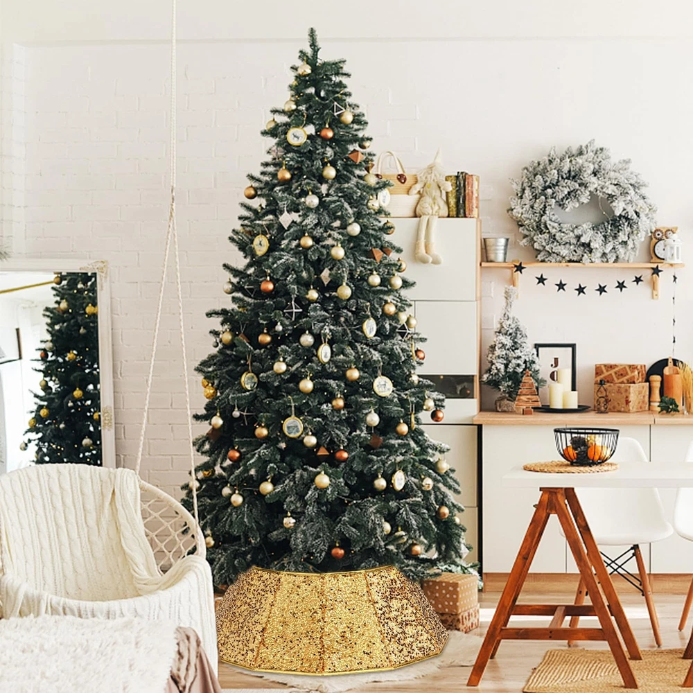 Christmas Tree Collar, Sequin Christmas Tree Skirt, Folable Christmas Tree Ring, Xmas Tree Stand Base Cover for Christmas Tree Decoration, Bright Gold GREAT MATERIAL: This fabric tree collar Christmas decorations consists of high quality polyester fiber, sequin and cardboard inside, sturdy enough for long lasting use. Golden sequins add the finishing touch to any tree. EASY ASSEMBLE: This Christmas tree ring comes in 1 piece, easy assembly by sticking Velcro. Contains 11 unique fixed accessories for extra stable, you no longer have to worry about your child or pet ruining the collar's shape. With the quick fold in no time after the holiday season is over, space saving storage guaranteed! ALTERNATIVE TO TRADITIONAL TREE SKIRTS: This fabric tree ring is a whole new twist on the traditional tree skirt, it completely hides the trunk of your Christmas tree while covering the tree stand, it's no appealing toy for toddlers, and there's no need to rearrange any cloth or get rid of the wrinkles. DIMENSIONS: 15 inch (top) diam. x 25.6 inch (bottom) diam. x 9.8 H inch. Fits for most standard size Christmas trees. We suggest that you measure your tree stand to ensure its fit within the collar. CHARMING CHRISTMAS DECOR: This round beautiful Christmas tree collar offers long-term durability and beautiful elegant style to step up your holiday decorations, adds a unique atmosphere to your home.