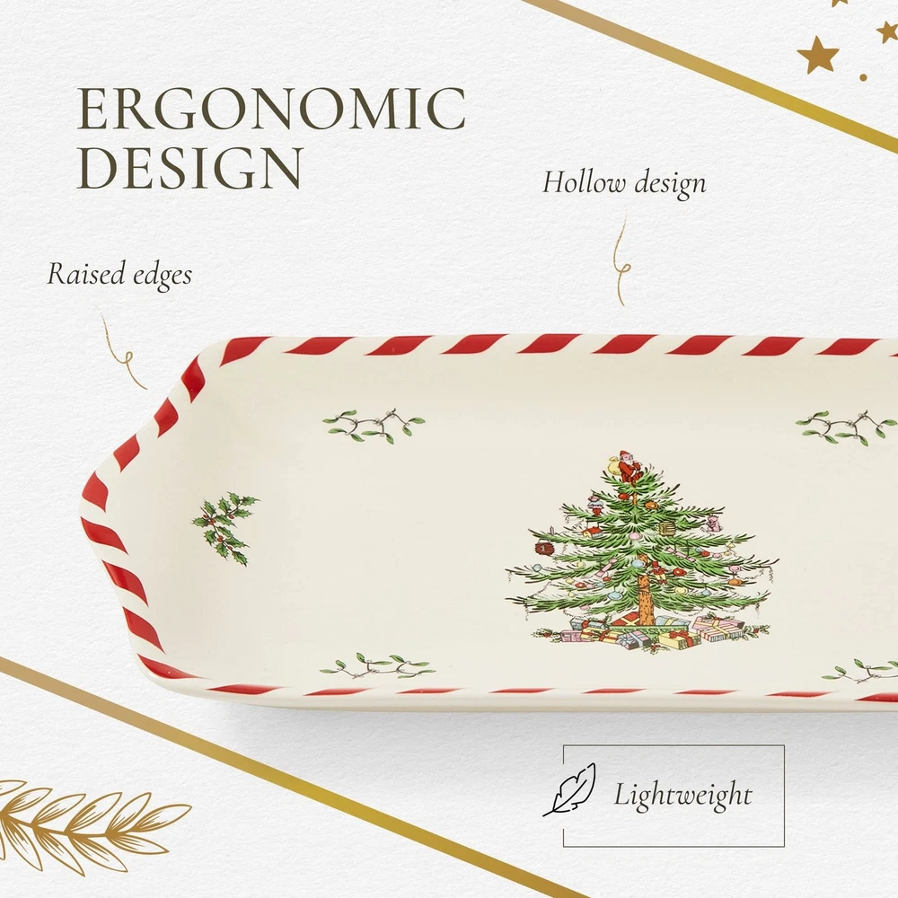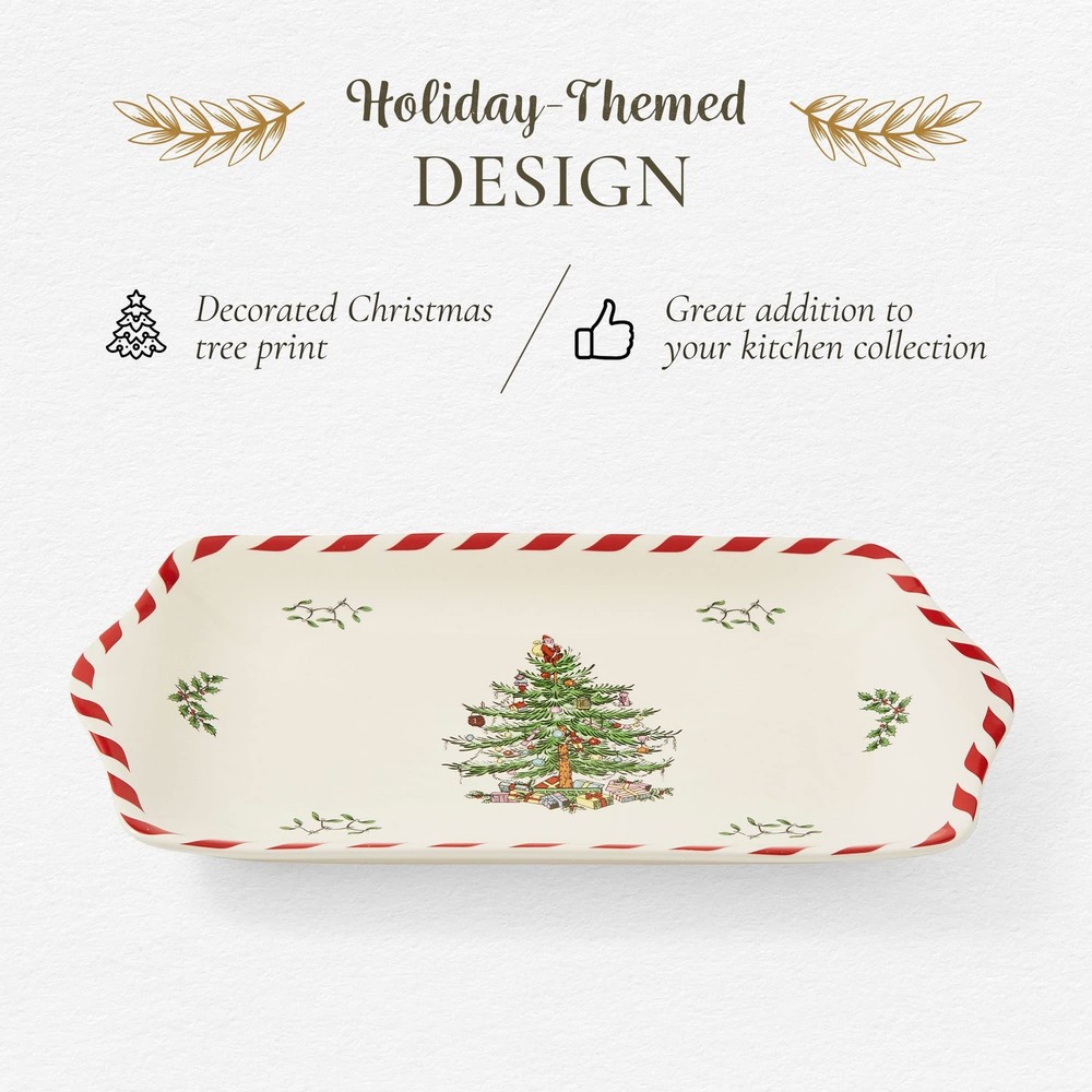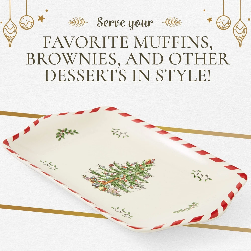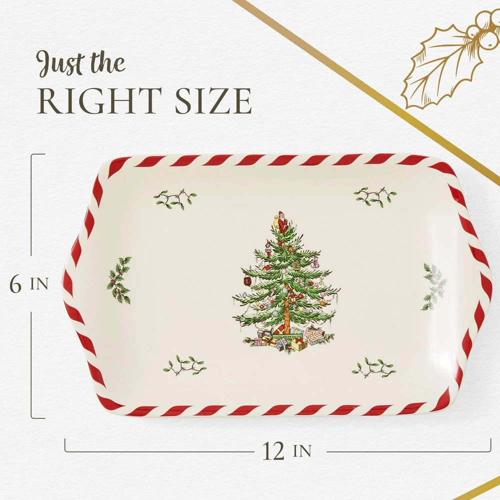 Christmas Tree Peppermint Dessert Tray Product Details Style: Christmas Tree Peppermint Dessert Tray Brand: Spode MPN: 1555990 UPC: 749151555990 EAN: 0749151555990 Brand: Spode Color: Multicolor Material: Porcelain Product Dimensions: 12"L x 12"W x 6"H Shape: Rectangular Brand: Spode Color: Multicolor Material: Porcelain Product Dimensions: 12"L x 12"W x 6"H Shape: Rectangular Tray Type: Serving Tray Special Feature: Peppermint, Christmas Tree Style: Christmas Tree Peppermint Dessert Tray Finish Type: Painted Recommended Uses For Product: Food Number of Items: 1 Product Care Instructions: Hand Wash Only Pattern: Striped Item Weight: 1.8 Pounds Theme: Christmas Tree Is Dishwasher Safe: No UPC: 749151555990 Global Trade Identification Number: 90 Manufacturer: Portmeirion USA Item Weight: 1.8 pounds Item model number: 1555990 Is Discontinued By Manufacturer: No Date First Available: July 10, 2013 Iconic Holiday Design with a Twist: The Spode Christmas Tree Peppermint Dessert Tray features the classic Christmas Tree pattern, cherished since 1938, with a festive peppermint band. This tray adds charm to your holiday table and gatherings. Versatile Serving for All Occasions: Whether presenting appetizers, charcuterie, snacks, or desserts, this 12-inch tray meets your holiday entertaining needs. Its classic design enhances your dishes, adding a festive touch to every occasion. Elegant and Durable Porcelain: Crafted from porcelain, this dessert tray combines elegance with durability. Its sturdy build handles holiday serving while maintaining decorative appeal, making it a reliable piece in your festive tableware collection. Thoughtful Holiday Gift: Packaged in a gift box, the Spode Christmas Tree Peppermint Dessert Tray is a gift for friends, family, or collectors. Its festive design and practicality ensure it will be appreciated during the holiday season. Classic Meets Contemporary Style: The tray blends Spodes iconic Christmas Tree motif with a modern peppermint band, offering a fresh take on a beloved design. This mix of tradition and modern style makes it a versatile piece for holiday decor. Spode Christmas Tree has graced tables all over the world since 1938. Spode has added new dinnerware, accessory and giftware items to this iconic pattern in a second and updated peppermint band which adds new life and interest to this classic pattern. There is no better holiday tradition than the gift of Spode Christmas Tree. Each item comes beautifully gift boxed.