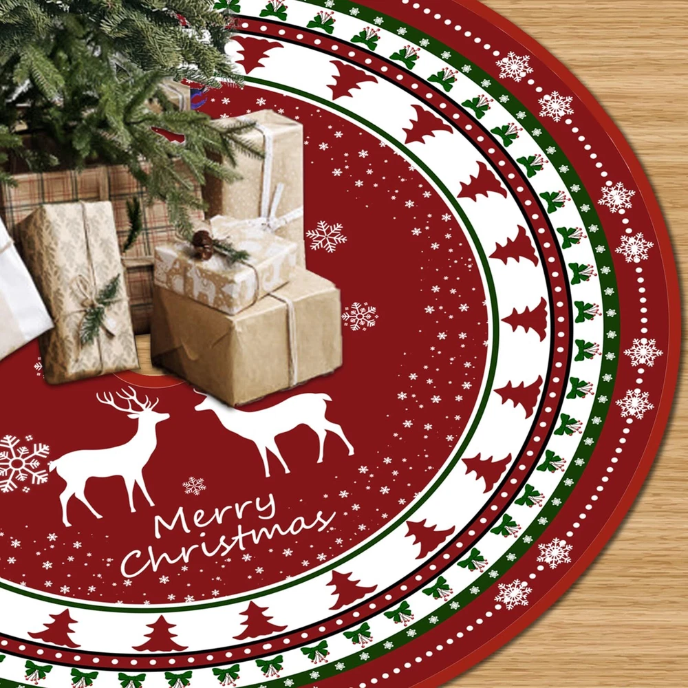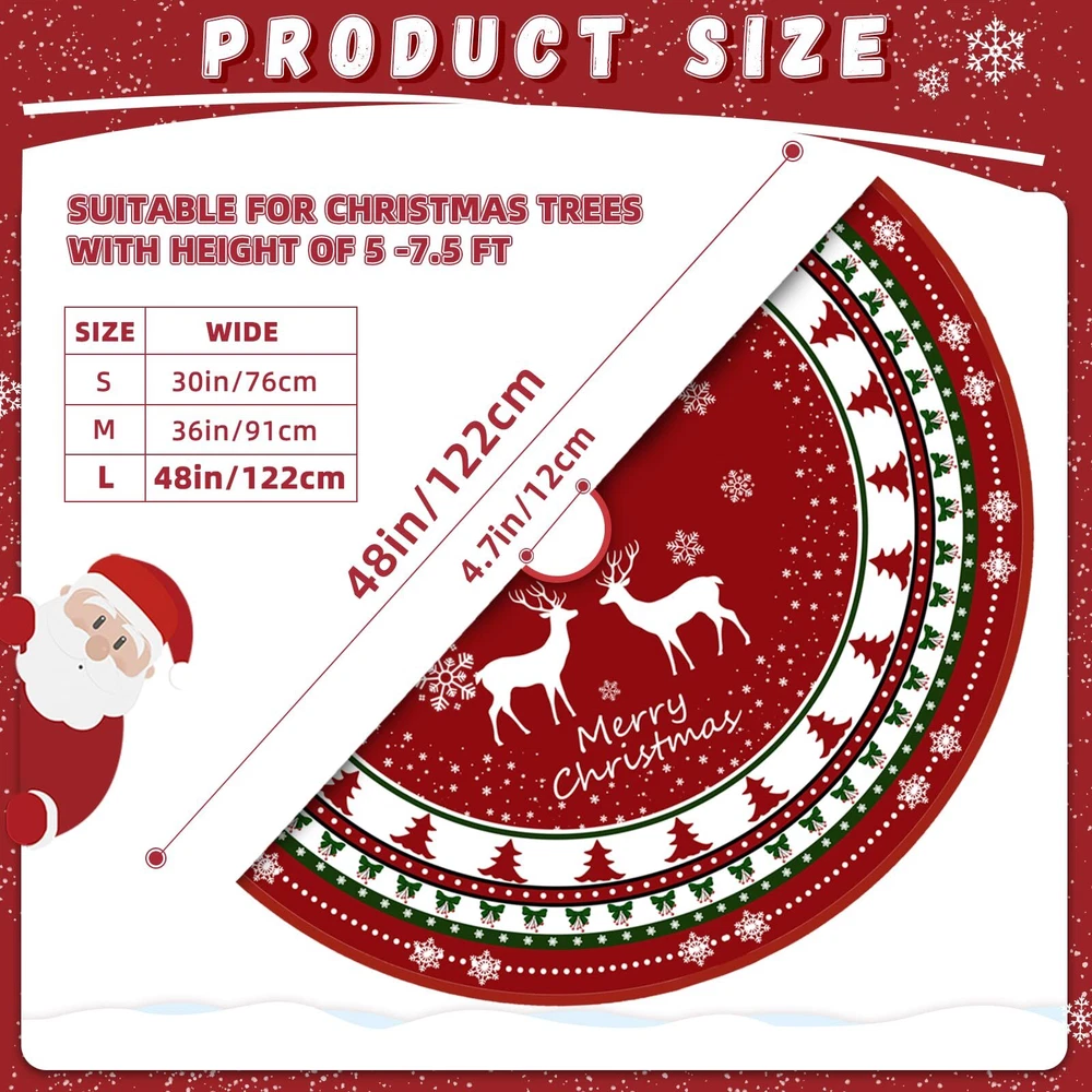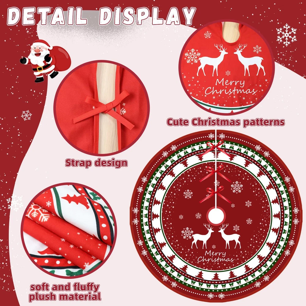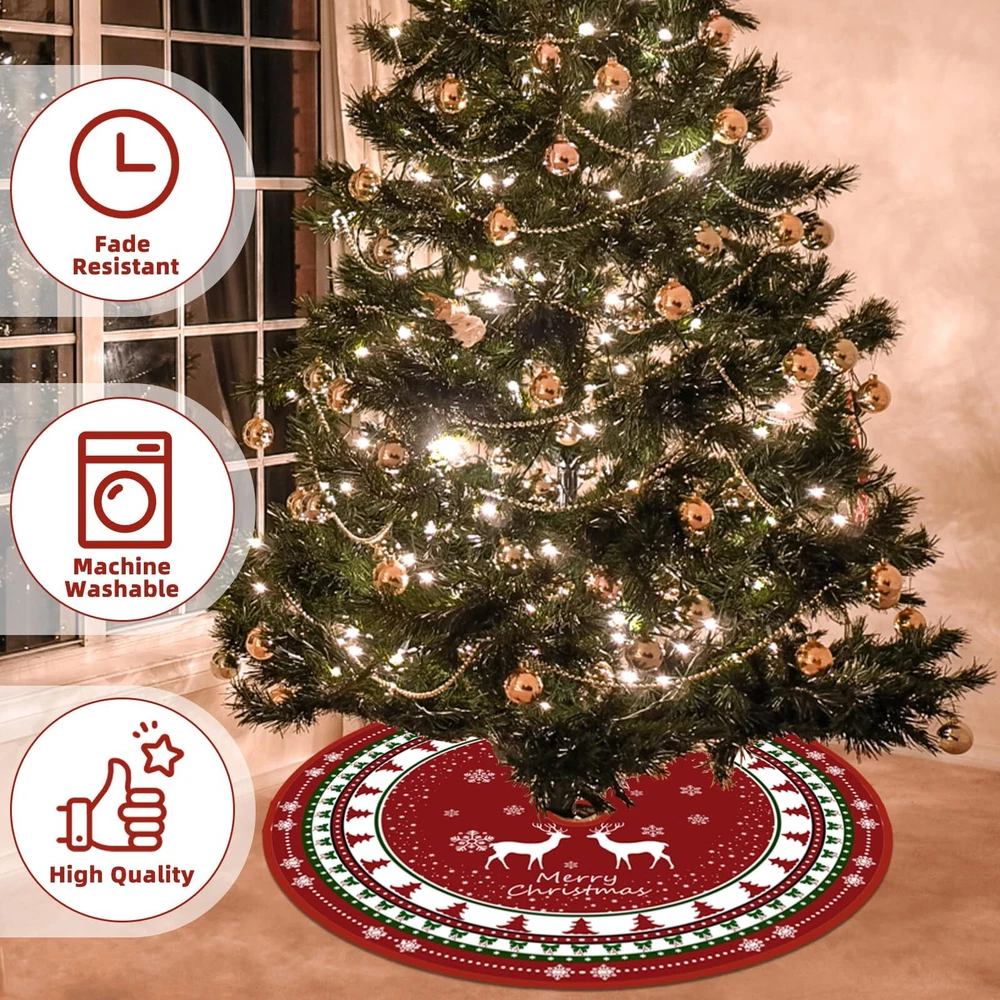 The red tree skirt made of thick and soft material. Premium material:The red and Green Christmas tree skirt is made of thick and soft material. The surface is covered with ultra-fine velvet which is smooth and soft to touch, super sturdy and lightweight, colour is long lasting. The Christmas tree mat is very soft and cozy to the touch, polyester on the bottom helps the skirt stick better to the ground, which can bring you an excellent hand feeling and a good viewing experience. Perfect Size: Our Christmas tree skirt size design of 48 inches, fits most Christmas trees and is large enough to cover the frame under the tree.The red and Green Christmas tree mat is the perfect habitat for all your exquisite Christmas gifts, you can put your favorite decorations or gift on the tree skirt, which can make the Christmas tree more gorgeous and fashionable, adding a stronger Christmas atmosphere. Exquisite design: The Christmas tree skirt design is cute and vivid. The warm red background, small Christmas tree and bow, vivid Christmas reindeer and Christmas tree complement each other, very elegant and comfortable! The cute snowflake design and letters also add a comfortable atmosphere, making your Christmas home decoration more dazzling! Easy to install: The Christmas tree skirt just needs to be laid under the Christmas tree, the durable rope can be easily and quickly adjusted to best fit your Christmas tree. You can tie the string into a bow, it not only adds to the beauty of the tree but is easier to install and remove. Our christmas tree mat can be reused, and simple folding can be stored away, keep using it on your next holiday! Quality service: We have been committed to bringing customers a good shopping experience. If you have any dissatisfaction after receiving our Christmas tree skirt, please do not hesitate to contact us, and we will give you the most satisfactory answer. This classic red and green Christmas tree mat is perfect for Christmas holiday family gatherings, indoor, living room, bedroom, garden, supermarket or other places for Christmas tree decorations, you can also give it as a warm Christmas gift to your family and friends.