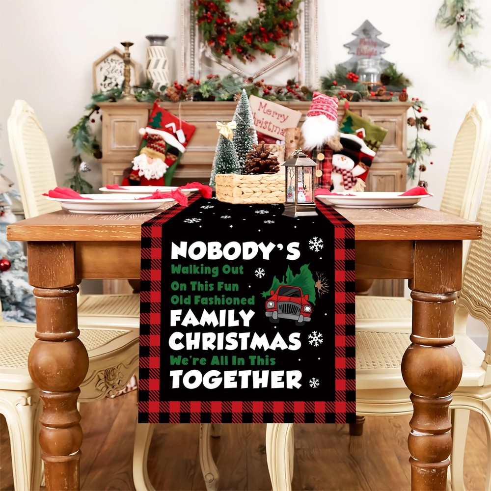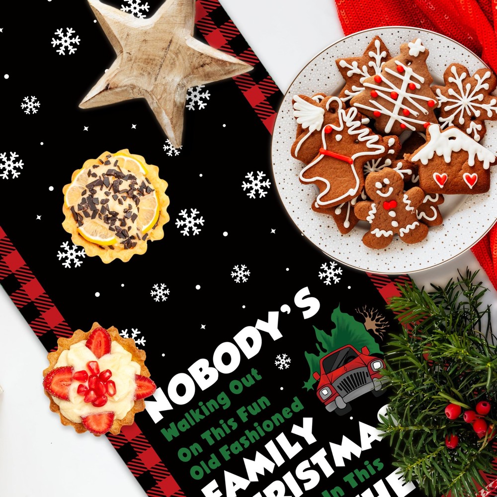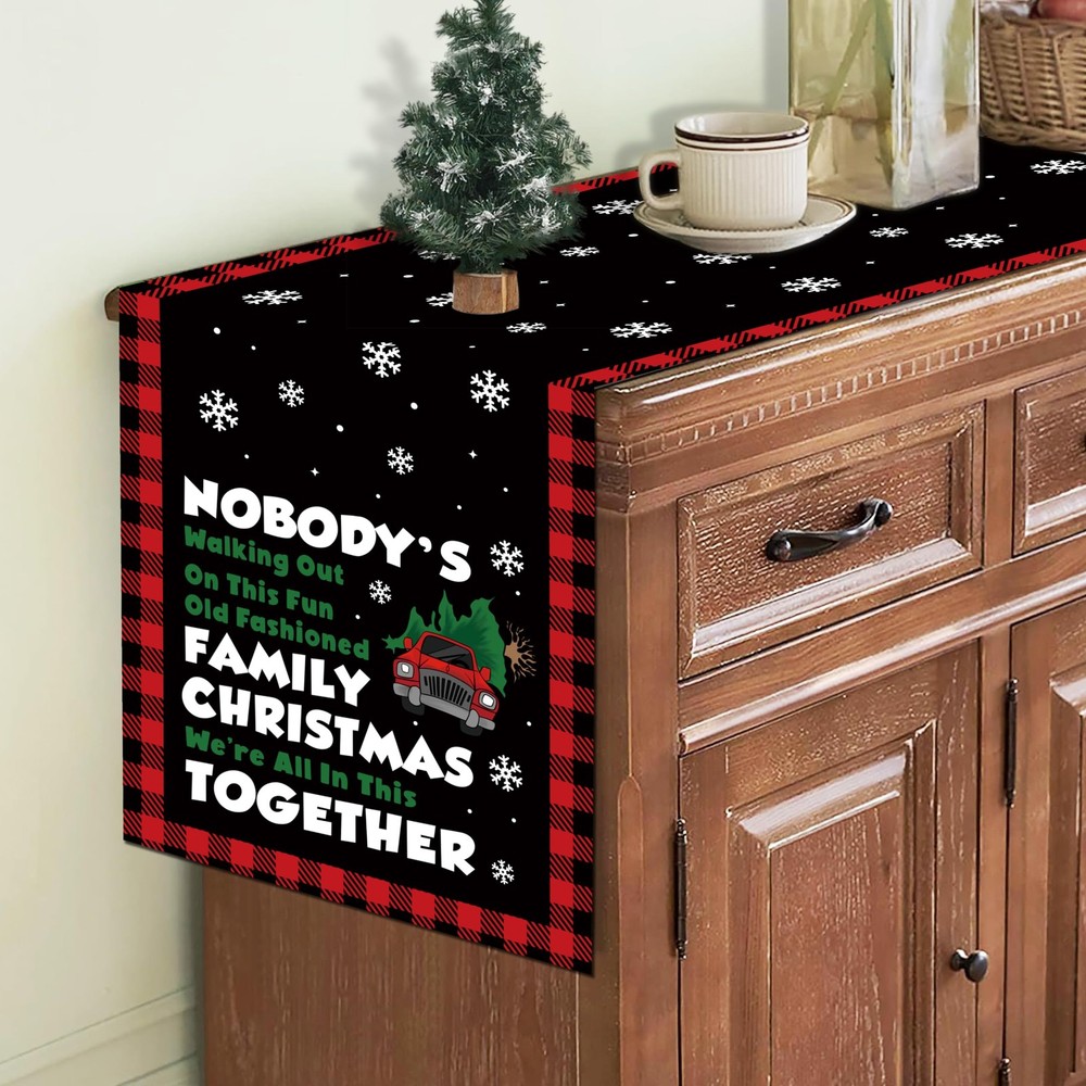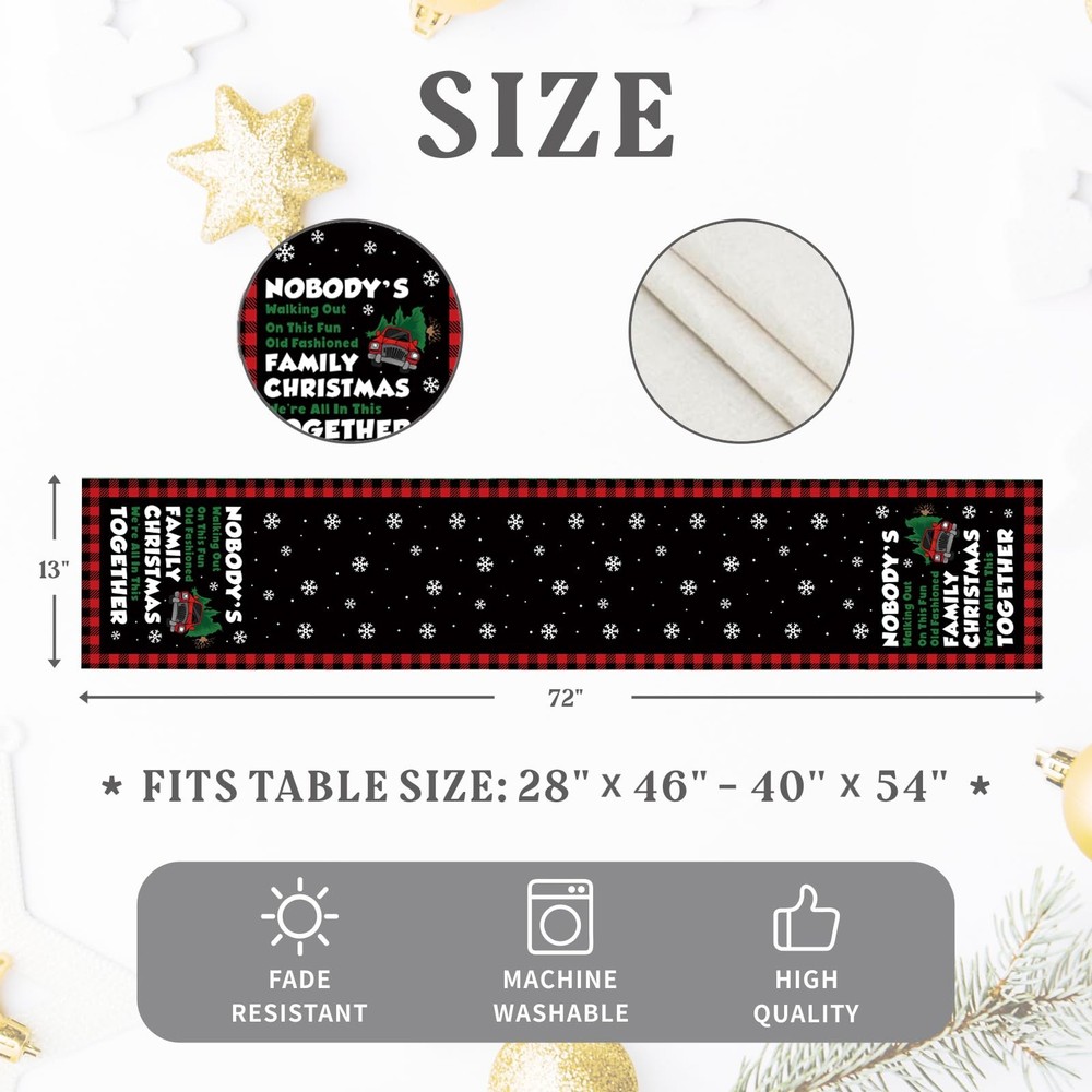 SPECIFICATION: Material: Premium Cotton & Linen Size: 13x72 inch Package Includes: 1 x Christmas Table Runner Festive Holiday Decor: This table runner would make a fantastic way to infuse your living space with the spirit of Christmas, creating a cheerful atmosphere that will be appreciated by both children and adults. NOTE: ->Due to the different displays of the computers, the color of the real item may be slightly different from the picture shown. ->Please allow 0.5-1 cm errors due to manual measurement. Conversation Starter: This table runner not only adds a humorous twist to your holiday decorations but also serves as a fantastic conversation starter among guests, sparking fond memories of the beloved Christmas Vacation film and creating a festive, lighthearted atmosphere at your table. Premium Linen Fabric: Crafted from premium linen fabric, this table runner not only boasts durability but also provides a luxurious backdrop for your holiday feast. Its high-quality material ensures it withstands years of festive use. Easy Maintenance: Cleaning up after your holiday gathering is a breeze, as this table runner is easy to care for. Simply machine wash it on a gentle cycle and hang it to dry, ensuring it's ready to spread holiday cheer for many seasons to come. Ideal Size for Most Tables: Measuring a generous 13 inches by 72 inches, the runner is designed to fit beautifully on most dining tables, providing a stylish and humorous base for your place settings and festive centerpieces. Griswold Family Antics: This table runner is printed with iconic and funny quotes from the classic film - Nobody's walking ou on this FUN-OLD-FASHIONED family Christmas, we're all in this together, bringing the movie's humor directly to your holiday table.
